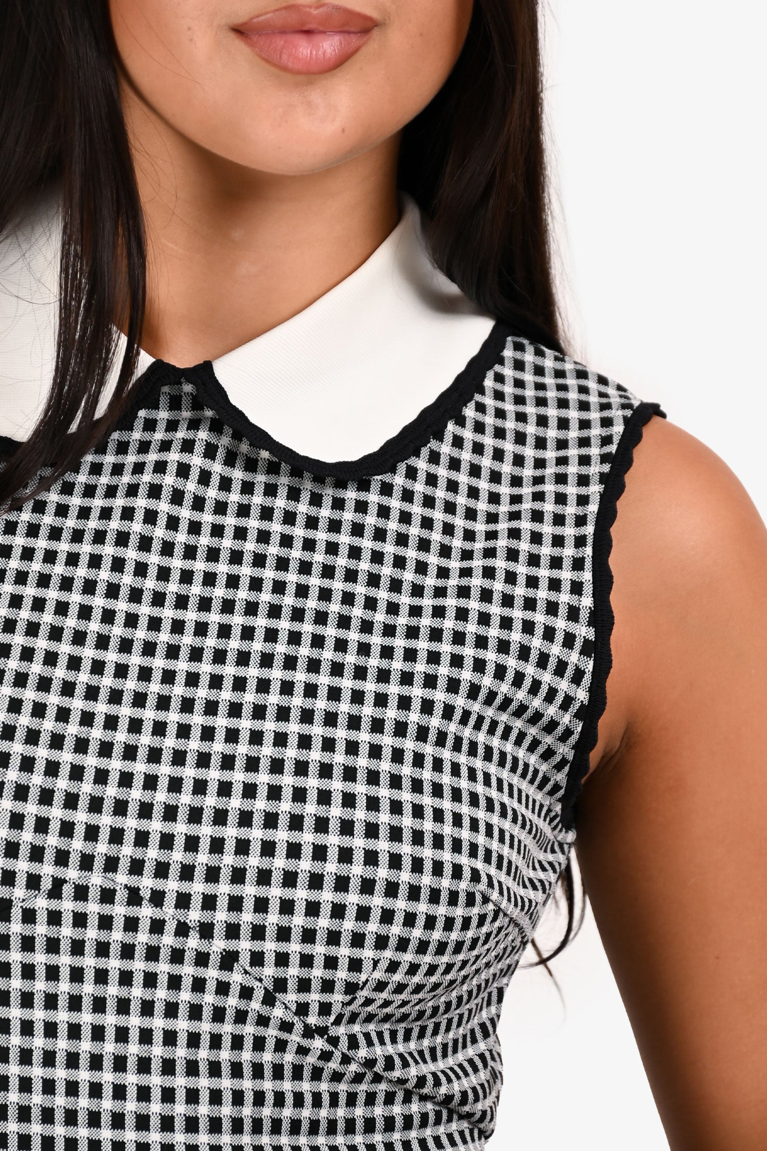Refresh availabilityMiu Miu 2019 Black/White Gingham Check Collared Shift Dress. Back zipper with top button closure. Peter Pan collar. Scalloped collar and arm hole edging. Two symmetrical bodice darts. Mid bodice seam.