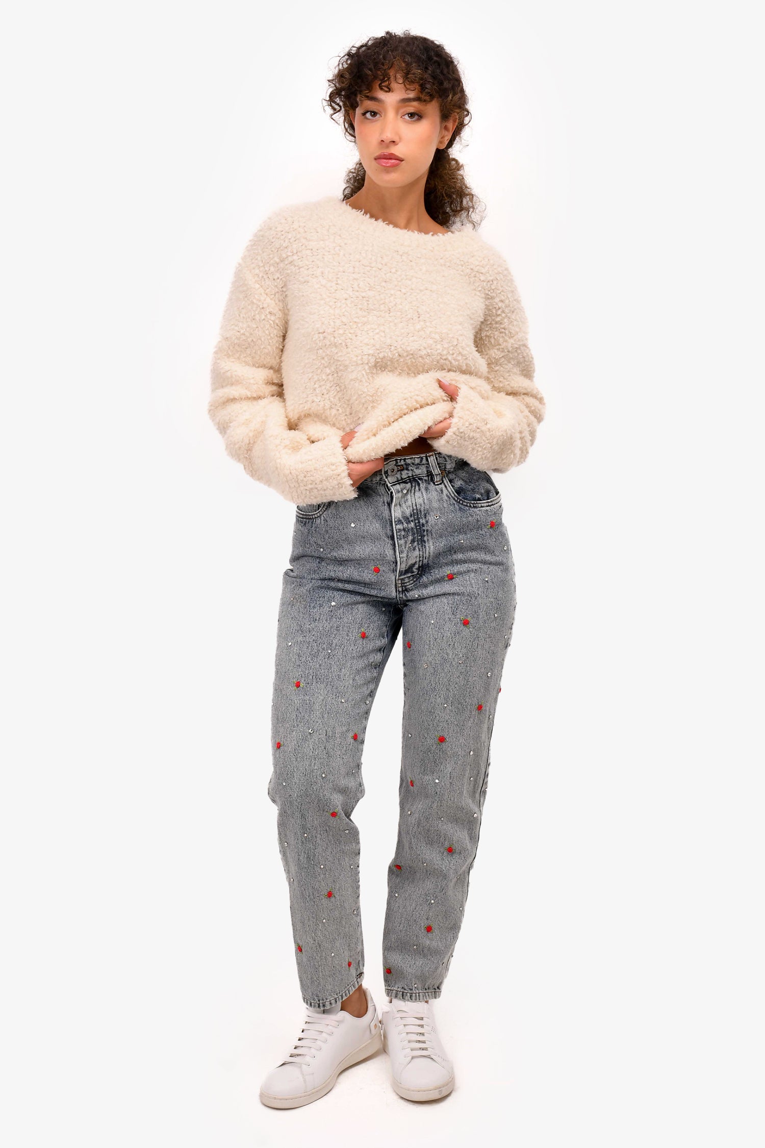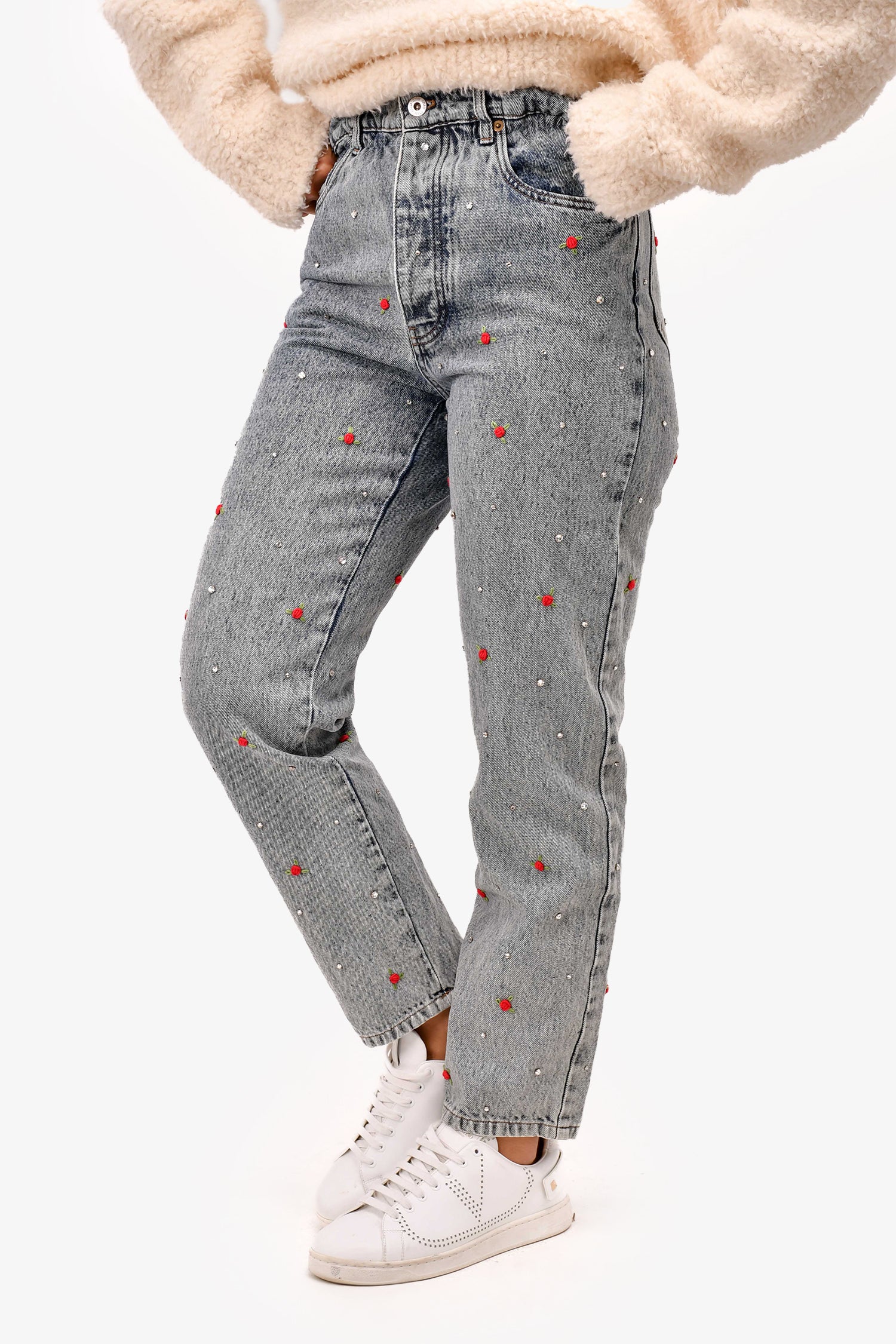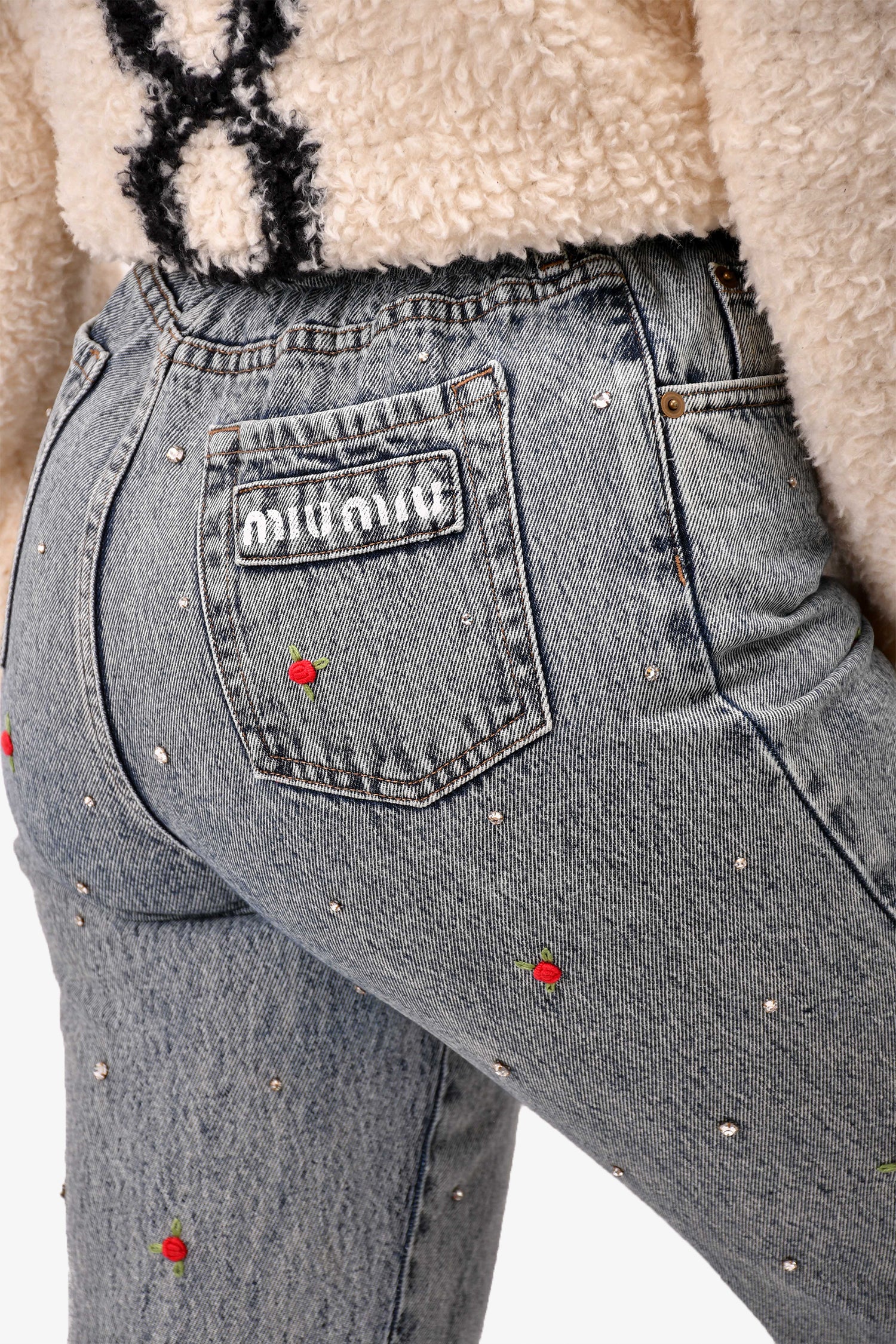 Refresh availabilityMiu Miu 2020 Blue Denim Rose/Crystal Embellished Jeans. Front button-up closure. Front and rear pockets. Waist belt loops.