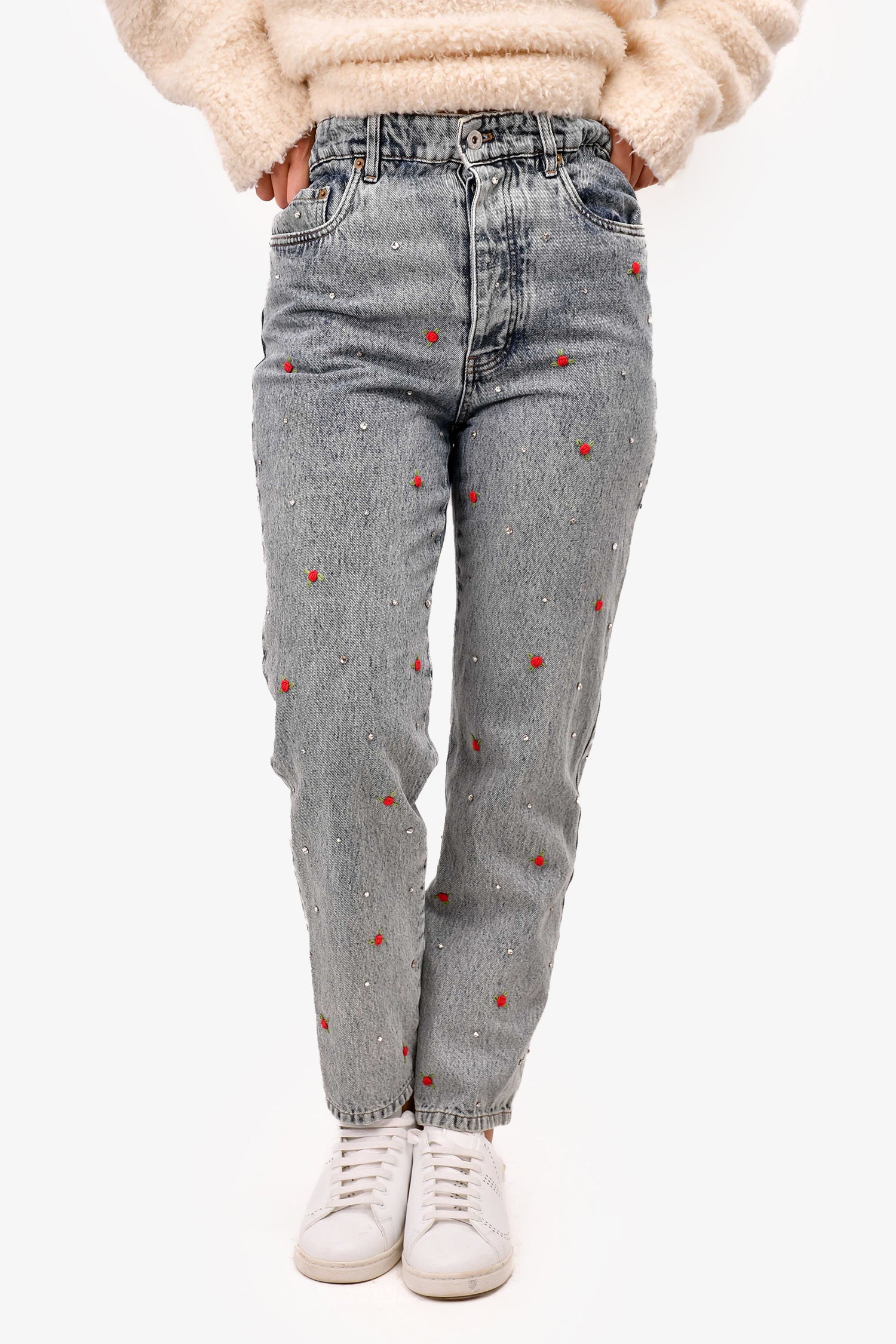 Miu Miu 2020 Blue Denim Rose/Crystal Embellished Jeans Size 25