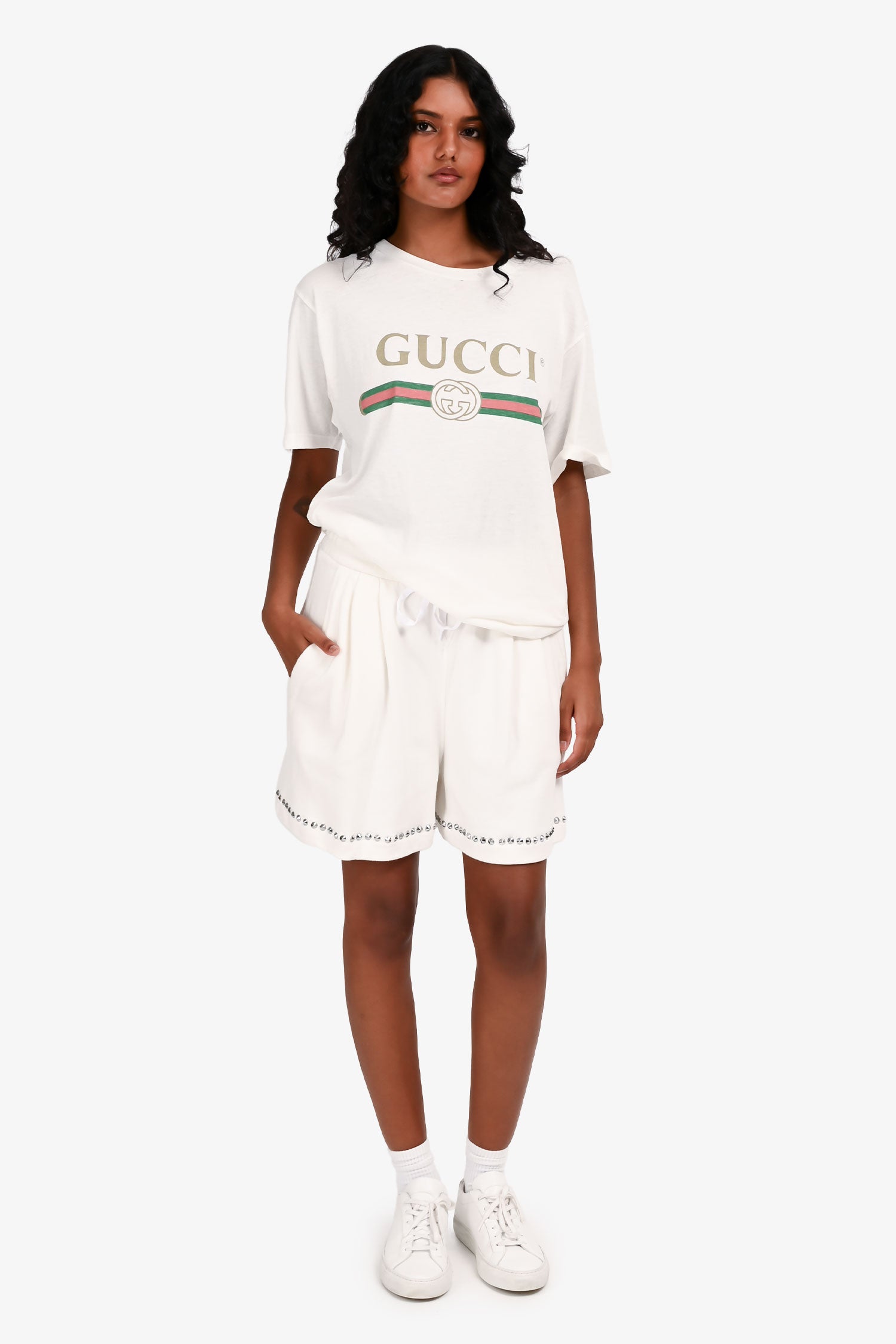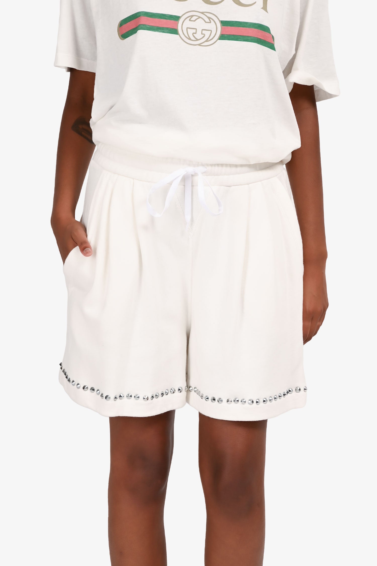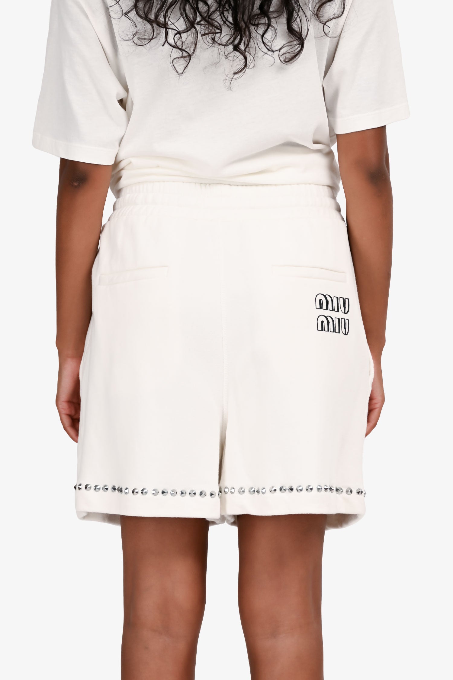 Refresh availabilityMiu Miu 2021 White Stud Detail Shorts. Silver-tone stud embellishments at hem. Elastic waistband with drawstring. Side pockets. Tonal stitching.