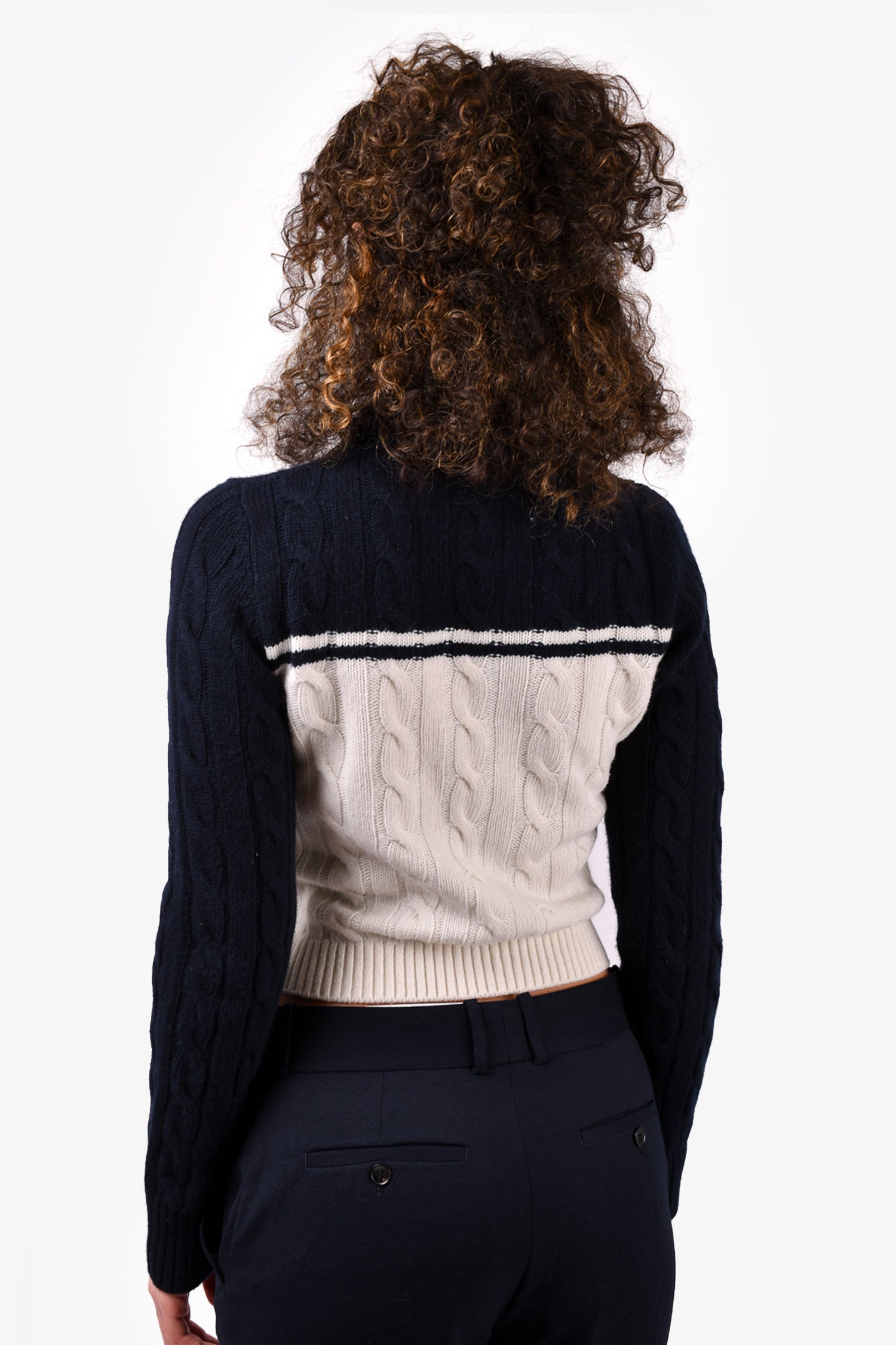 Refresh availabilityMiu Miu 2022 Navy/White Wool/Cashmere Cable Knit Zip Sweater. Ribbed neck, cuffs and hem. Tonal stitching.