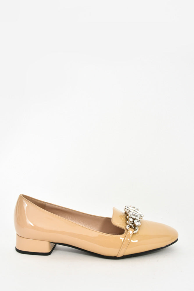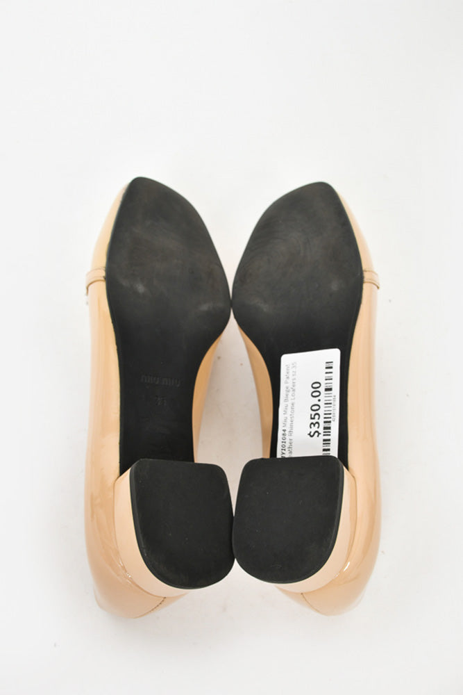 Refresh availabilityMiu Miu Beige Patent Leather Rhinestone Loafers. Glossy finish. Square toe. Tonal stitching.