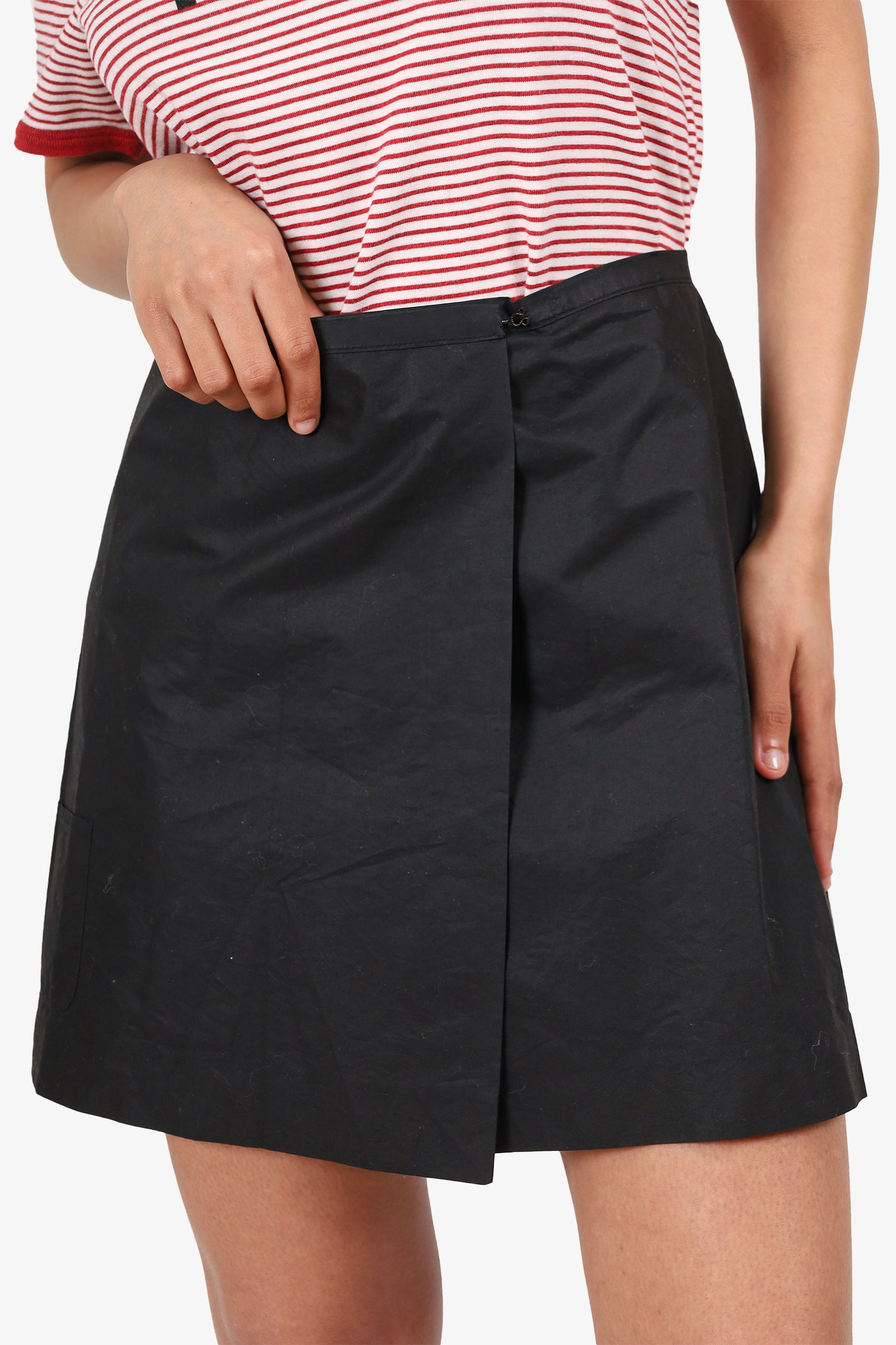 Refresh availabilityMiu Miu Black Cotton/Nylon Mini Wrap Skirt. Slip-on. Wrap design waist with hook closure. Single slip pocket at right exterior. Unlined. Tonal stitching.