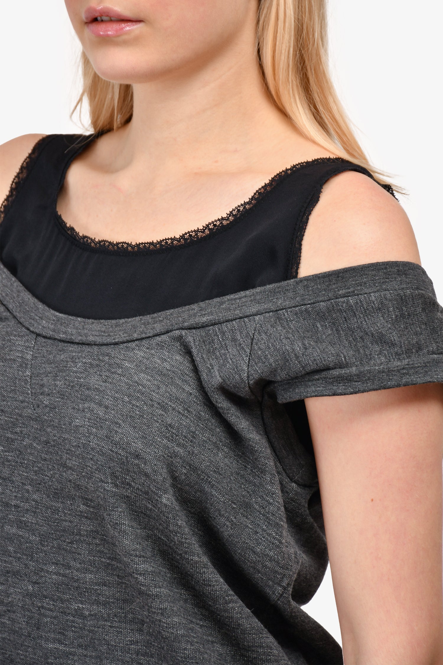 Refresh availabilityMiu Miu Black/Grey Sleeveless Lace Trim Dress. Lace trimming throughout bottom layer. Fleece overlay. Tonal stitching.