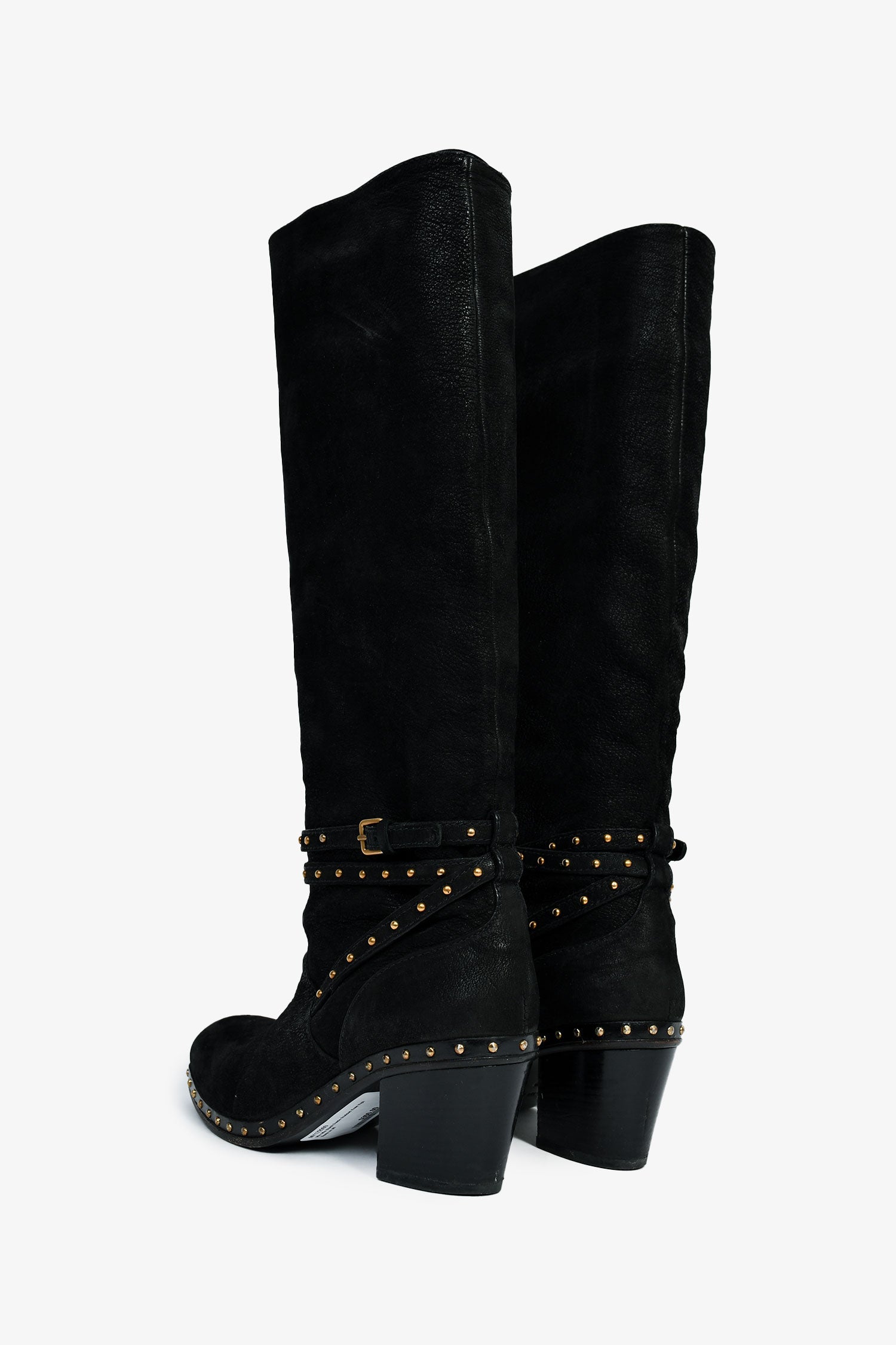 Refresh availabilityMiu Miu Black Suede Studded Knee High Boots. Round toe. Gold-tone hardware. Leather lined interior. Tonal stitching.