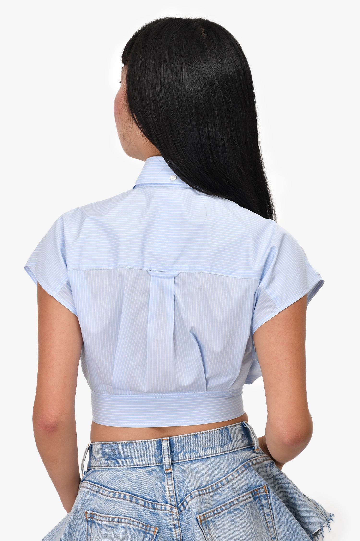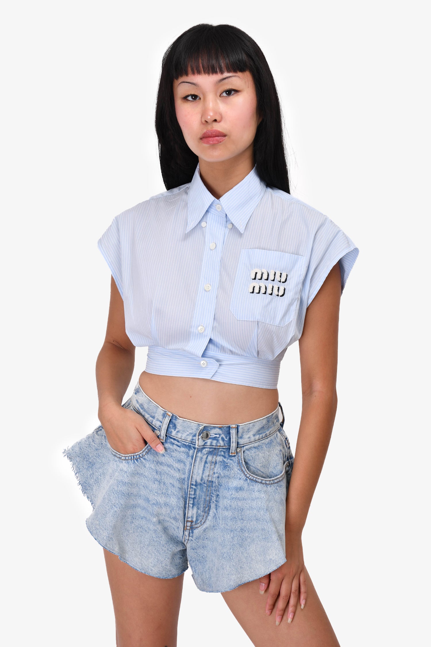 Refresh availabilityMiu Miu Blue & White Striped Embroidered Logo Sleeveless Cropped Vest. Cap sleeves. button down closure. Pleated at the waist and cuffed. Button closure detailing on the collar. Tonal stitching.