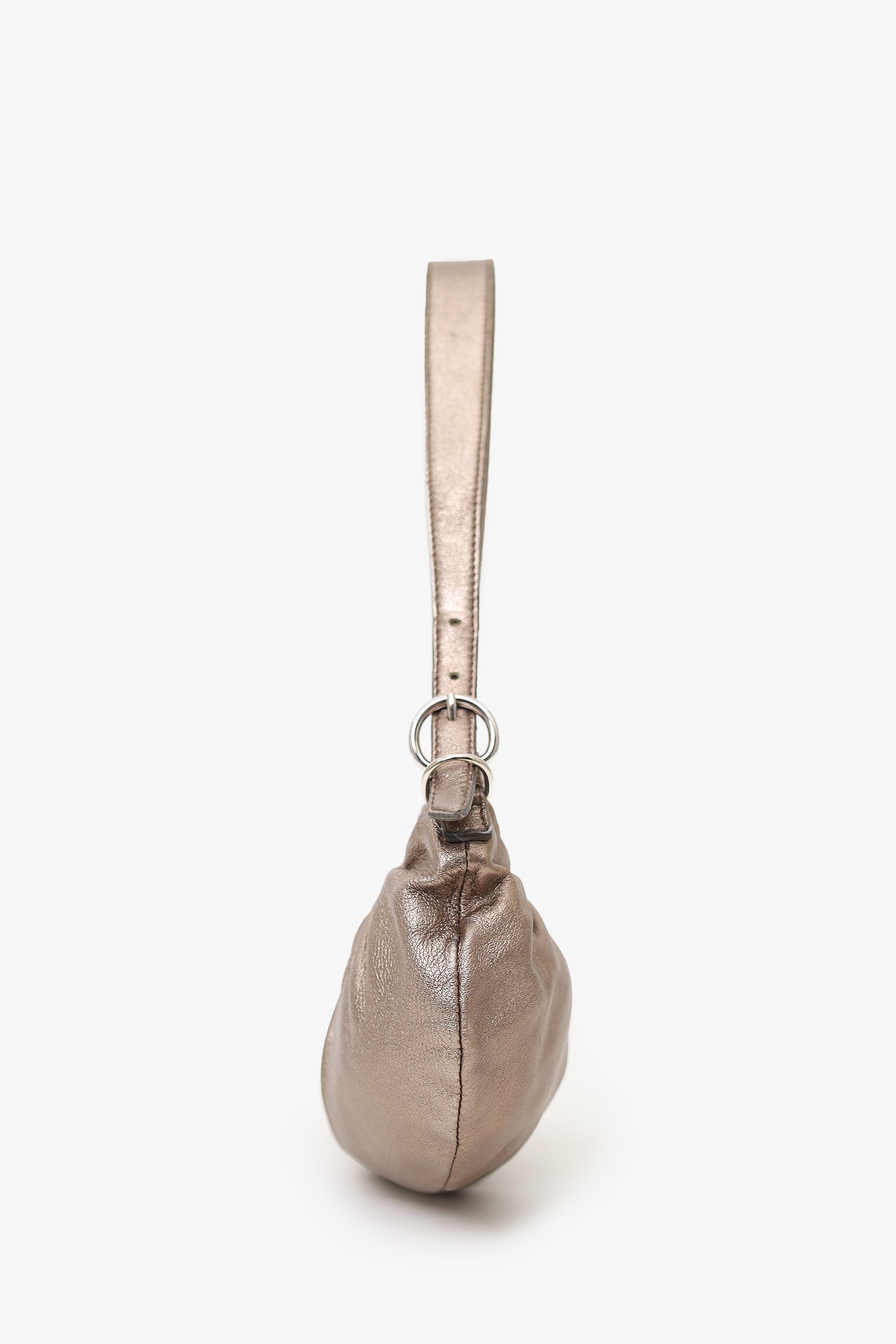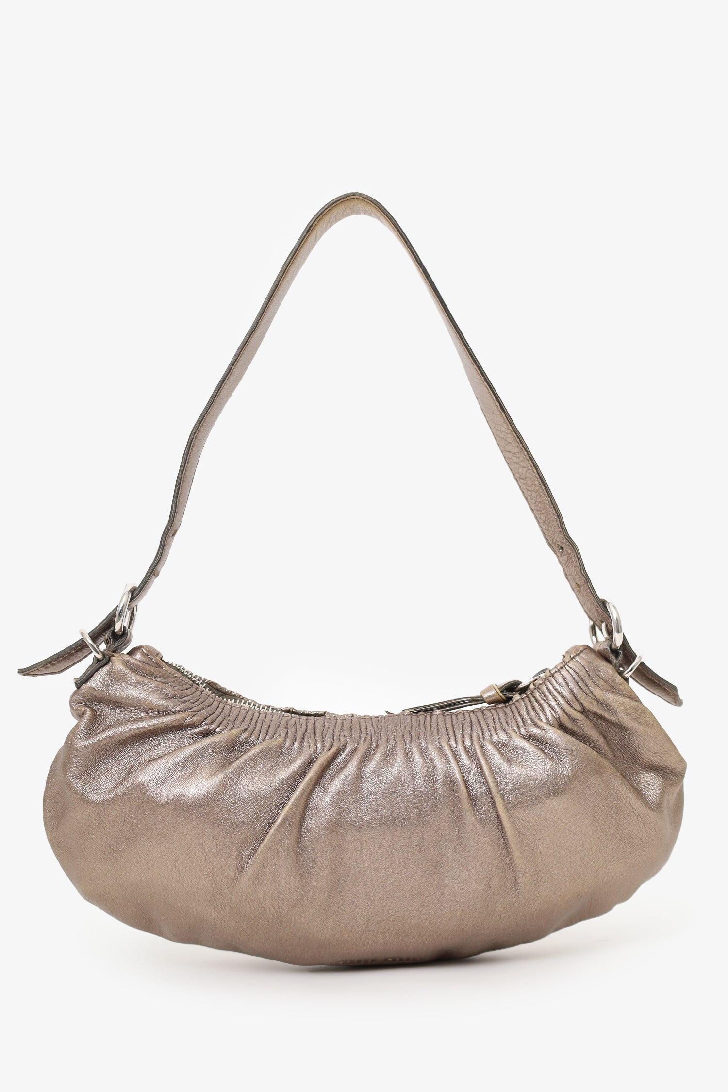 Refresh availabilityMiu Miu Bronze Leather Shoulder Bag. Top zip closure. Leather adjustable and removable strap. Ruched detail underneath zipper closure. Fabric lined interior. Single interior zip pocket. Silver-tone hardware. Tonal stitching.