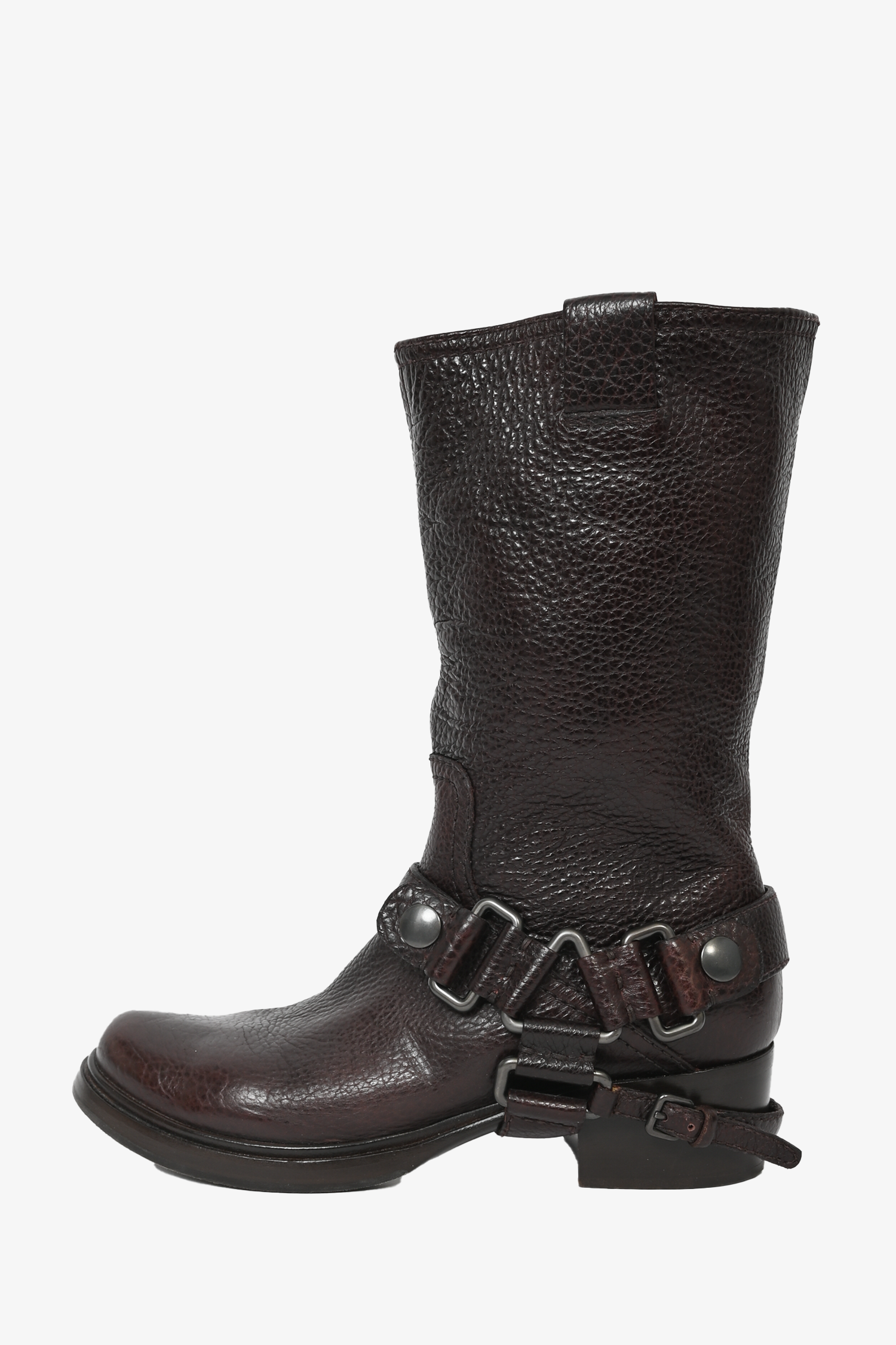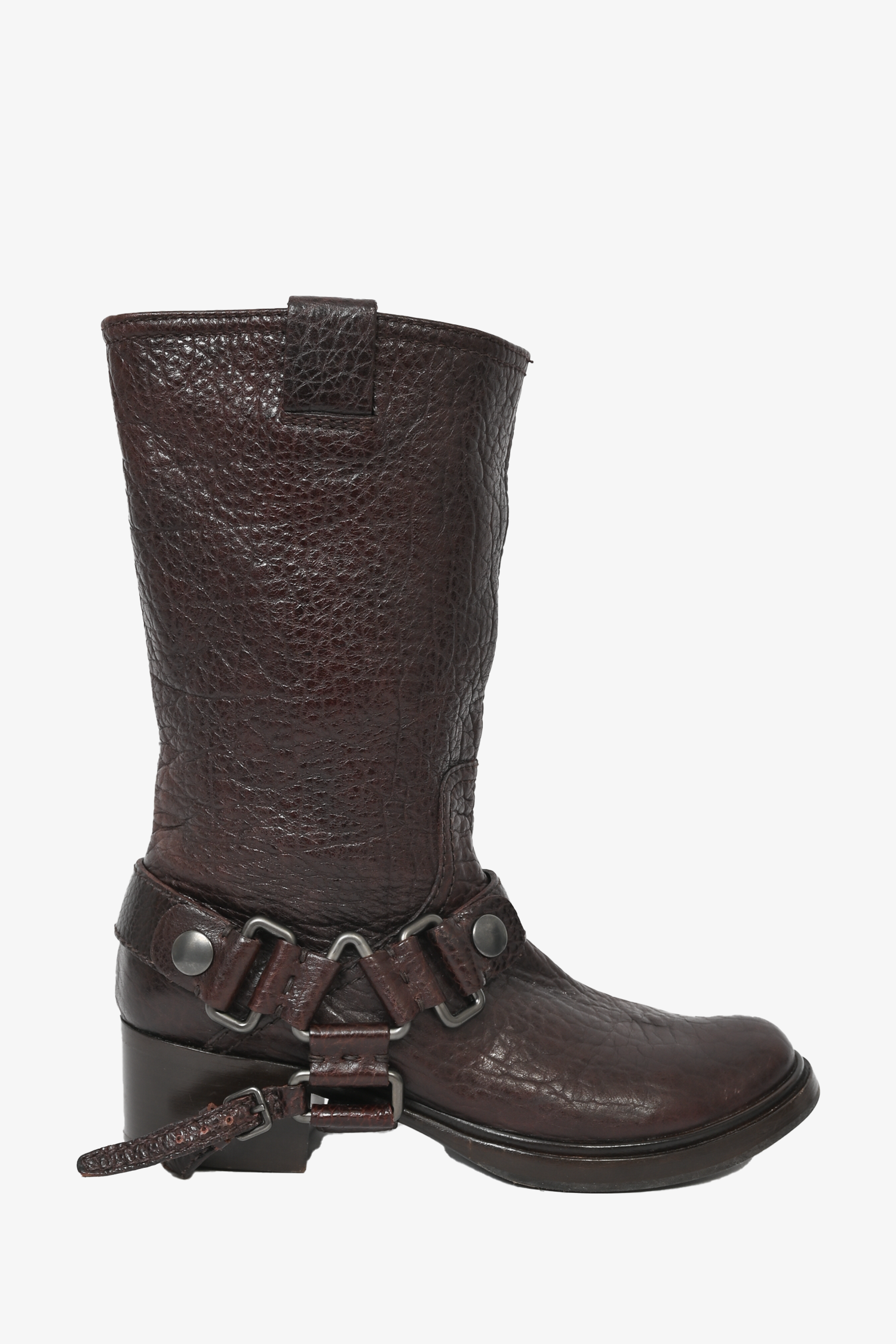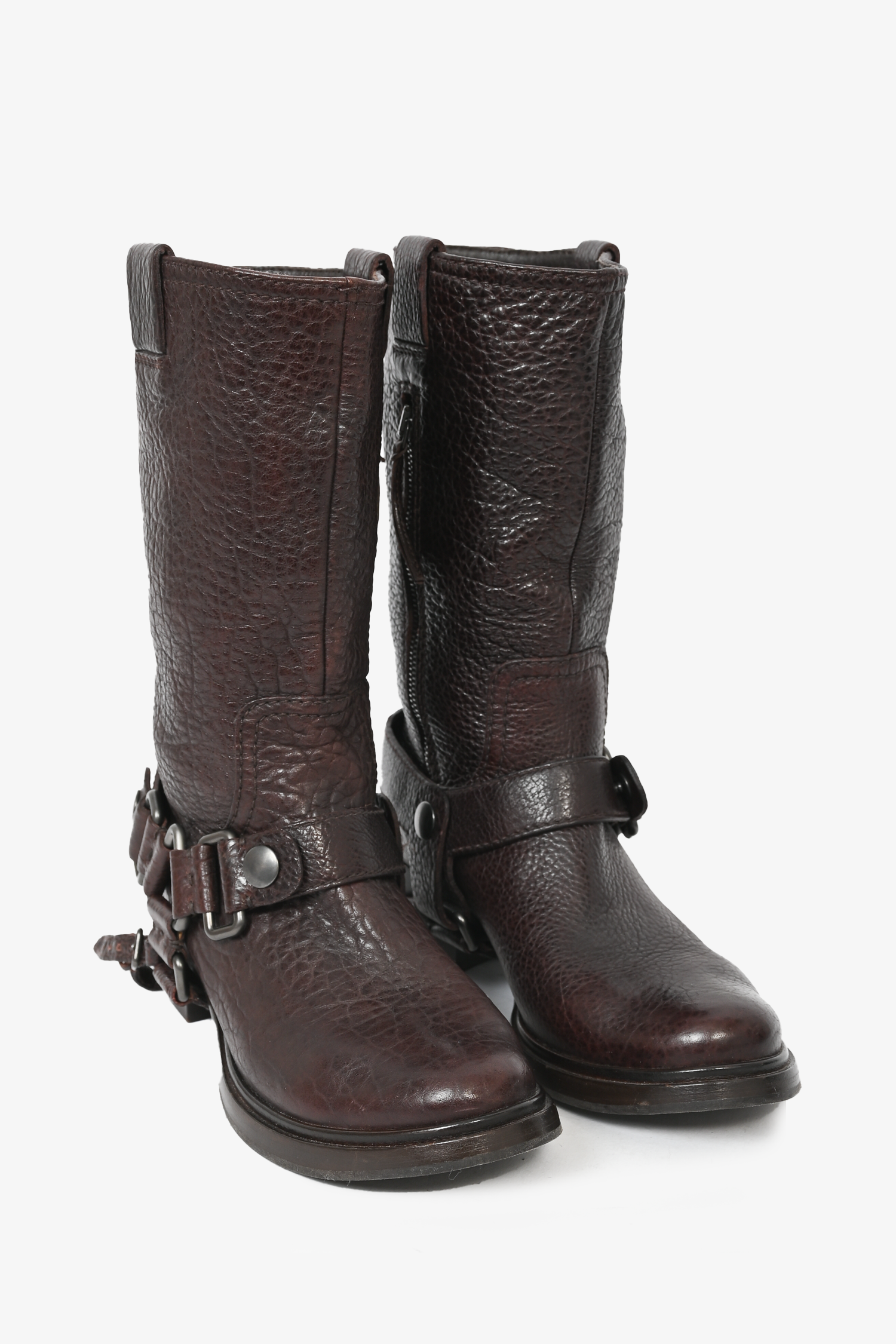Refresh availabilityMiu Miu Brown Leather Motorcycle Boots. Round toe. Side zip closure. Pull-on. Tonal stitching.