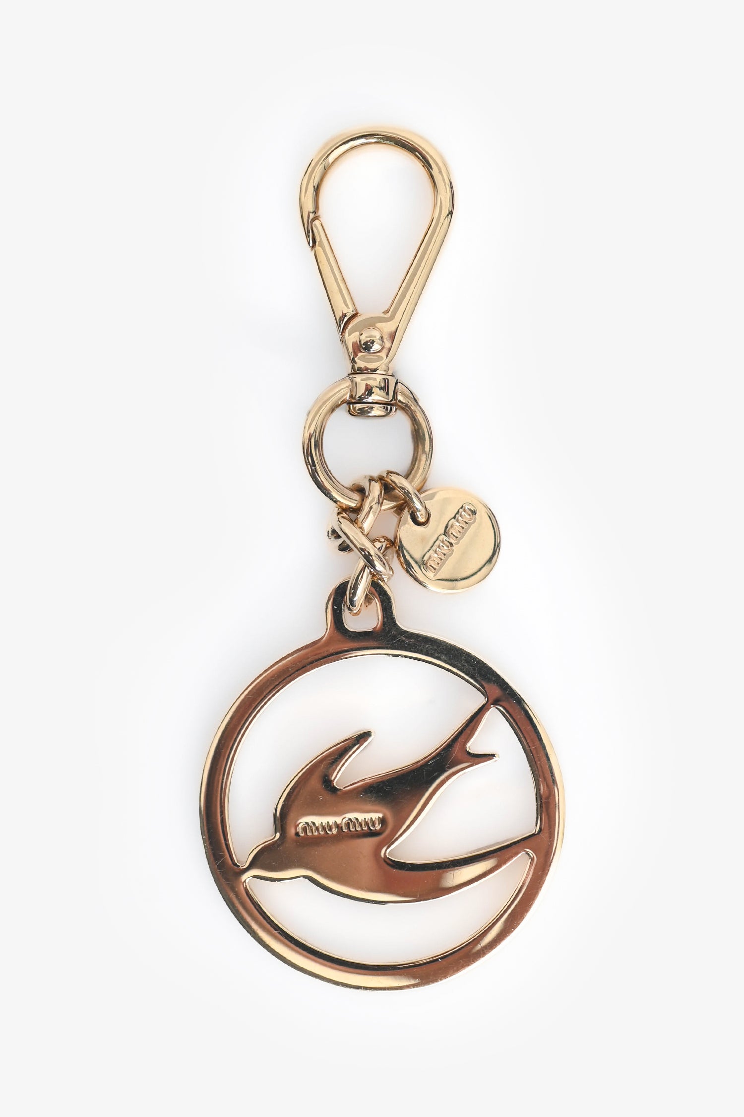 Refresh availabilityMiu Miu Gold Tone Metal Crystal Embellished Bag Charm. Features a logo-engraved circle charm. Lobster clasp closure.