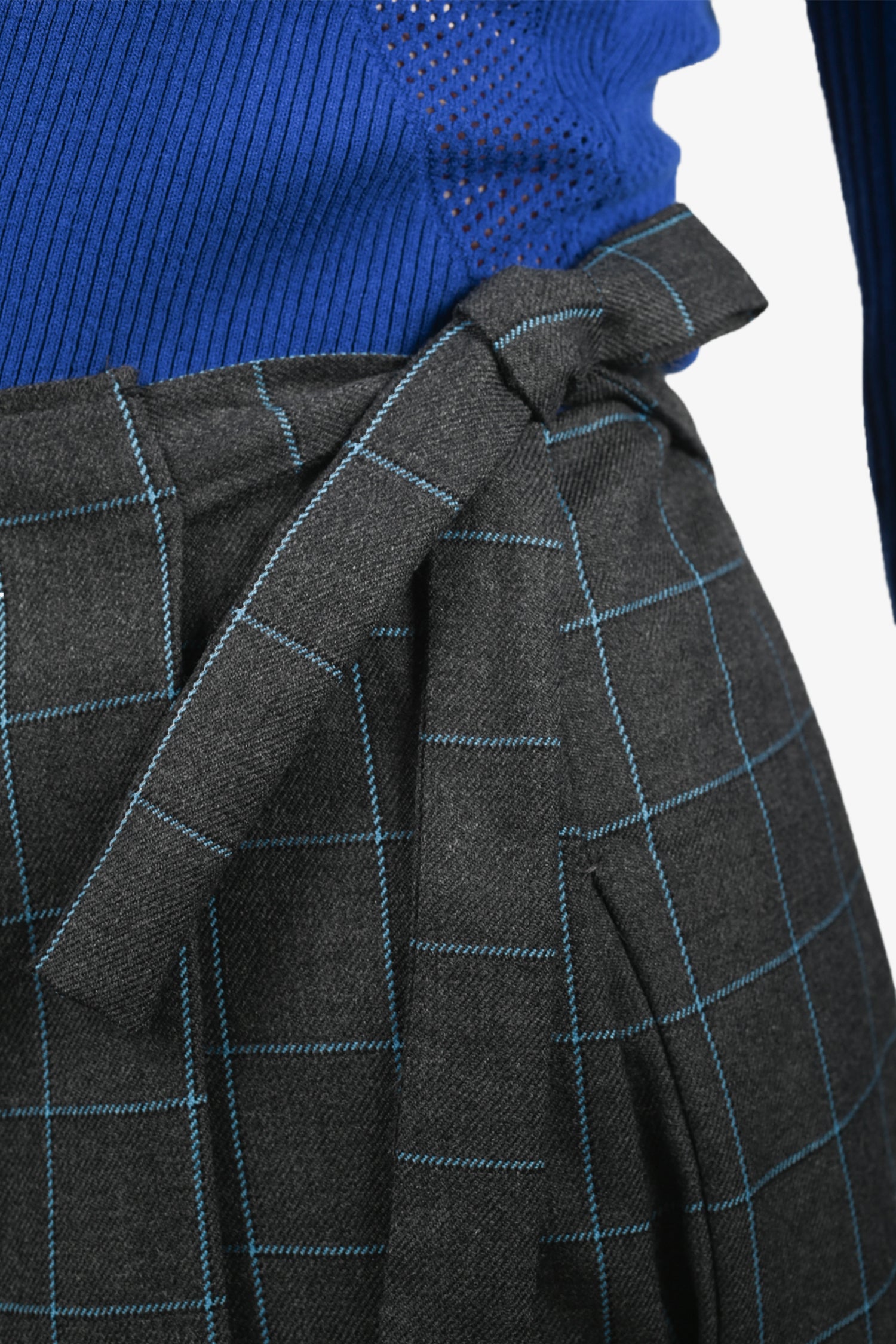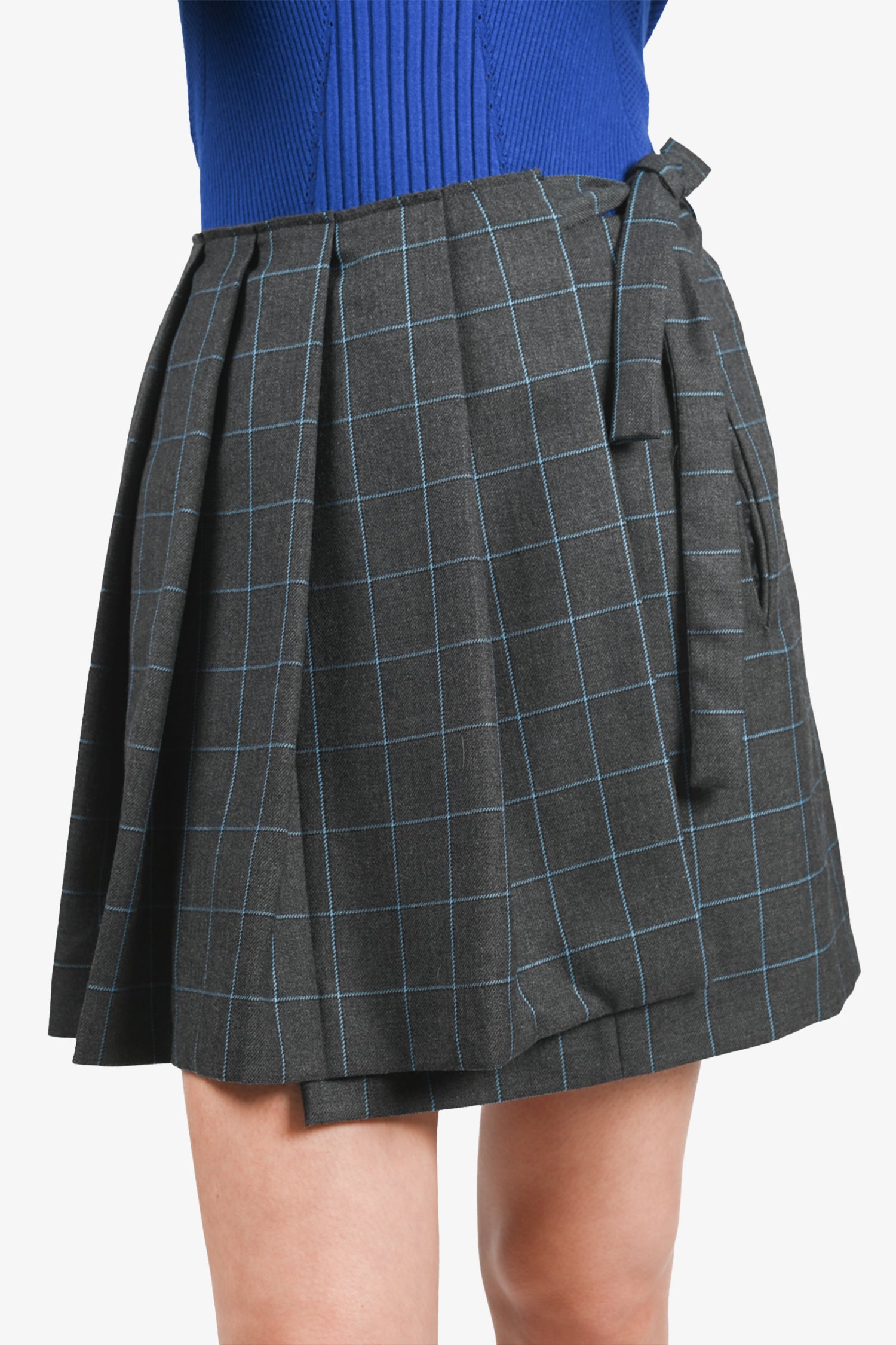 Refresh availabilityMiu Miu Grey/Blue Check Wool Tie Mini Skirt. Single-side snap-button closure and front tie-up closure. Lined. Tonal stitching. Pinned on model.