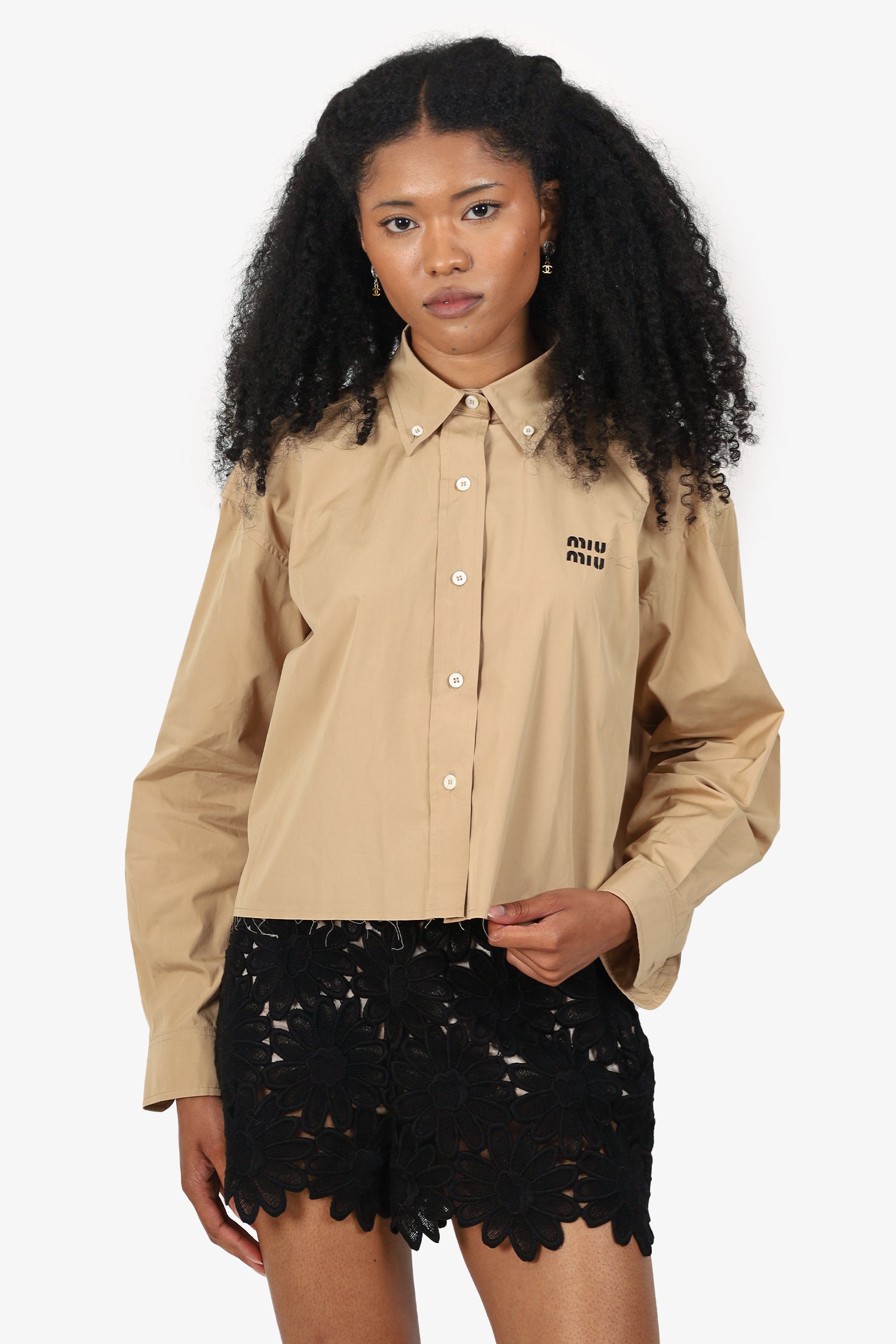 Refresh availabilityMiu Miu Khaki Embroidered Logo Crop Poplin Shirt. Pull-on. Collared-neckline. Front button-up closure. Sleeve cuffs with button-up closure. Frayed bottom hem. Tonal stitching.