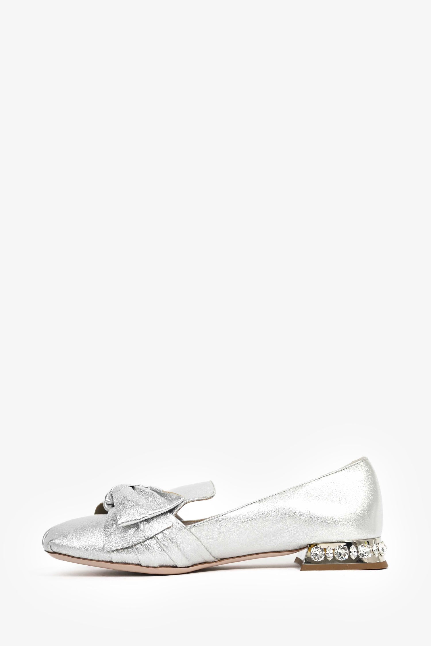 Refresh availabilityMiu Miu Silver Leather Rhinestone Heel Bow Flats. Leather insoles. Rhinestone heels. Tonal stitching.