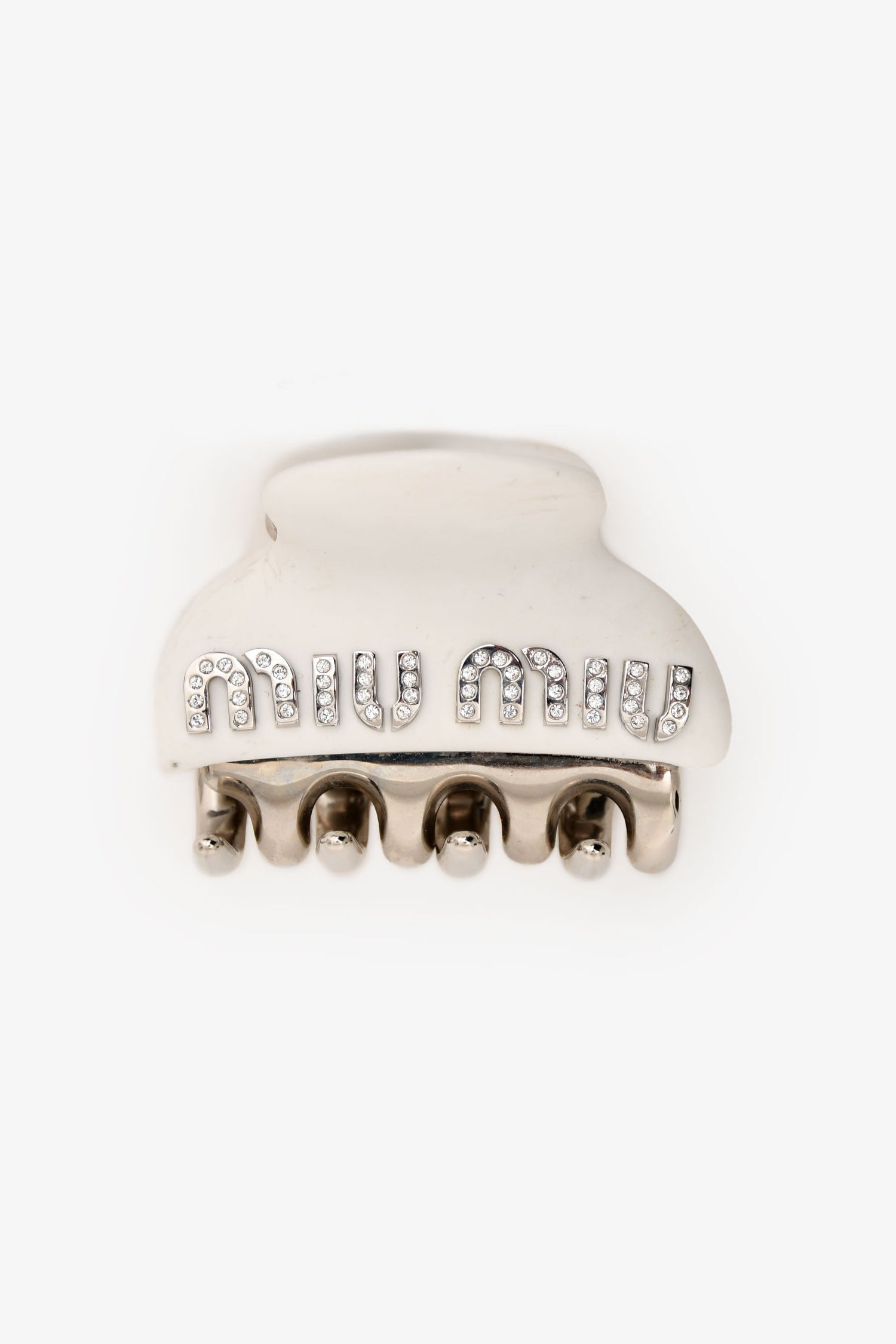 Refresh availabilityMiu Miu White Crystal Embellished Hair Clip. Silver-tone hardware. Logo detail. Clear crystal embellishments throughout. Snap clip closure.