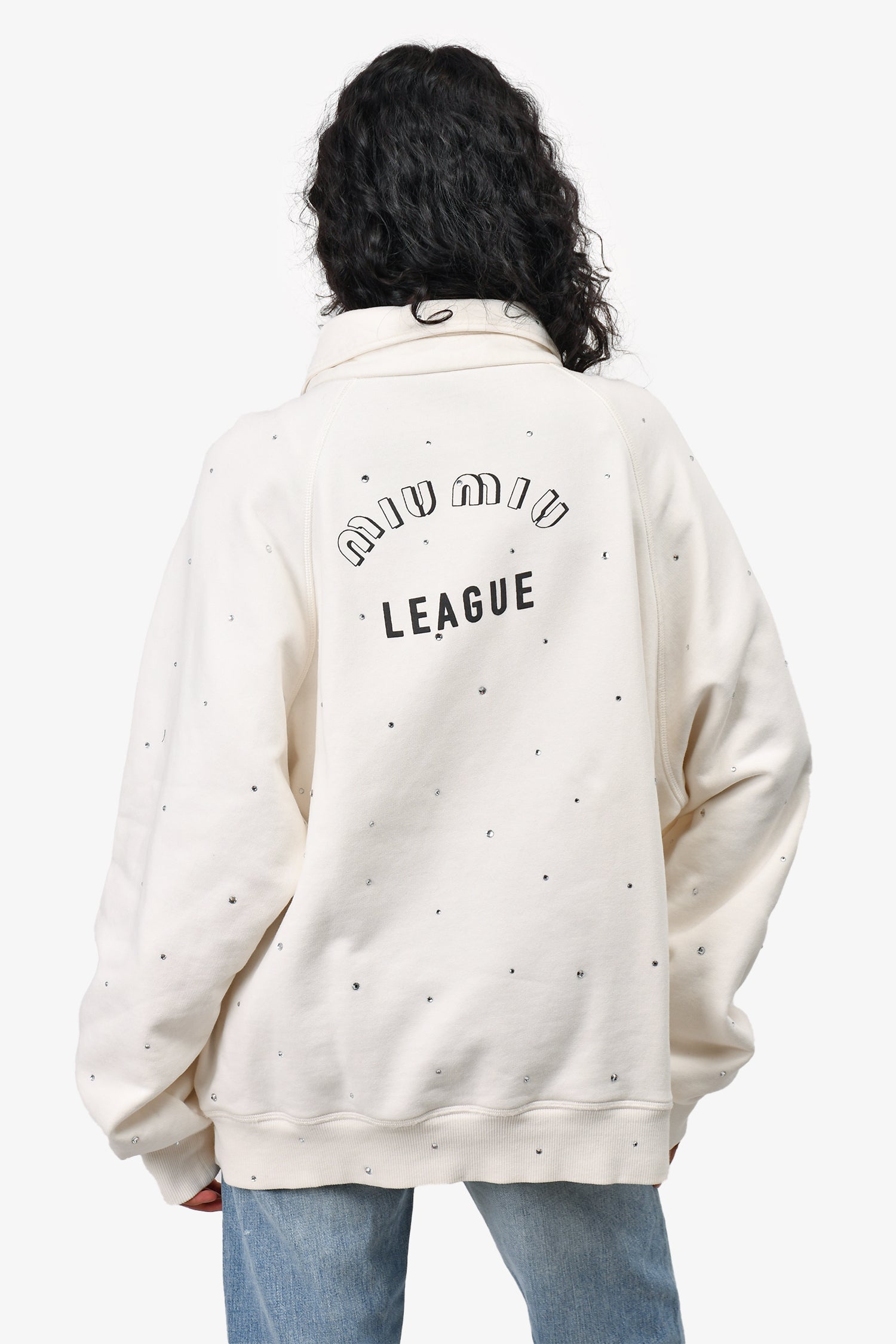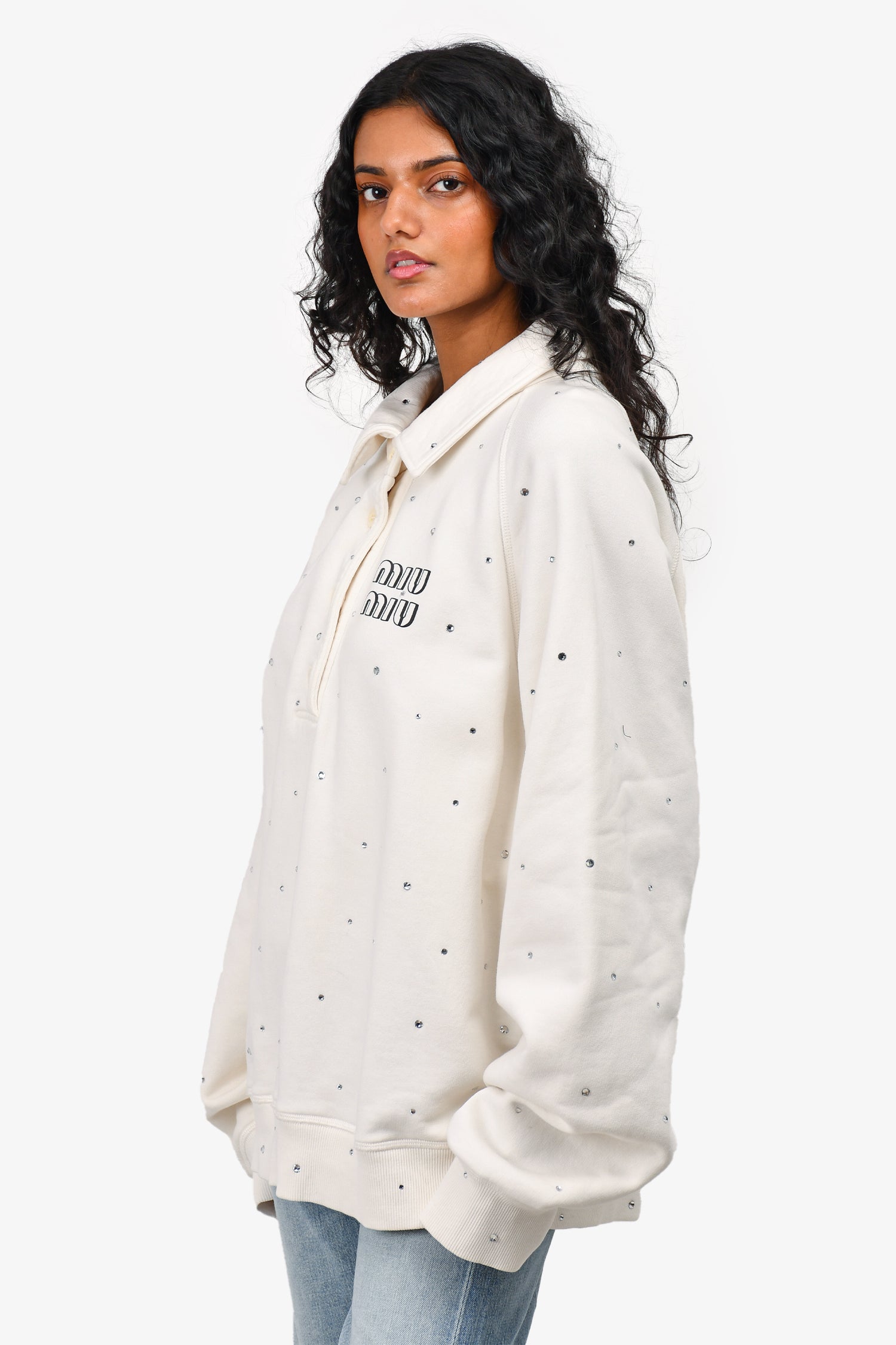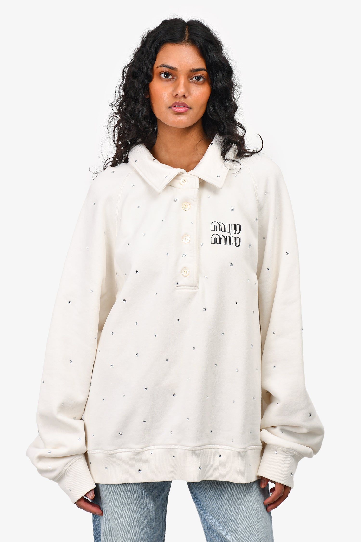 Refresh availabilityMiu Miu White Logo Crystal Embellished Oversize Polo Sweatshirt. Pull-on. Front-button up detail. Ribbed trimmings. Tonal stitching. Unlined.