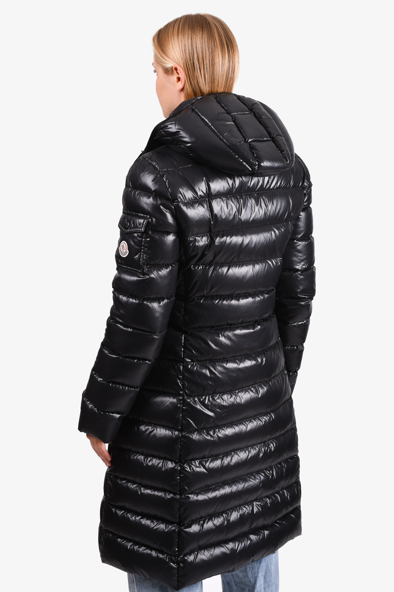 Refresh availabilityMoncler Black Down Long Zip Hooded 'Moka' Coat. Front two-way zip closure. Front zip pockets. Brand logo patch on the left sleeve. Removable hood. Tonal stitching.