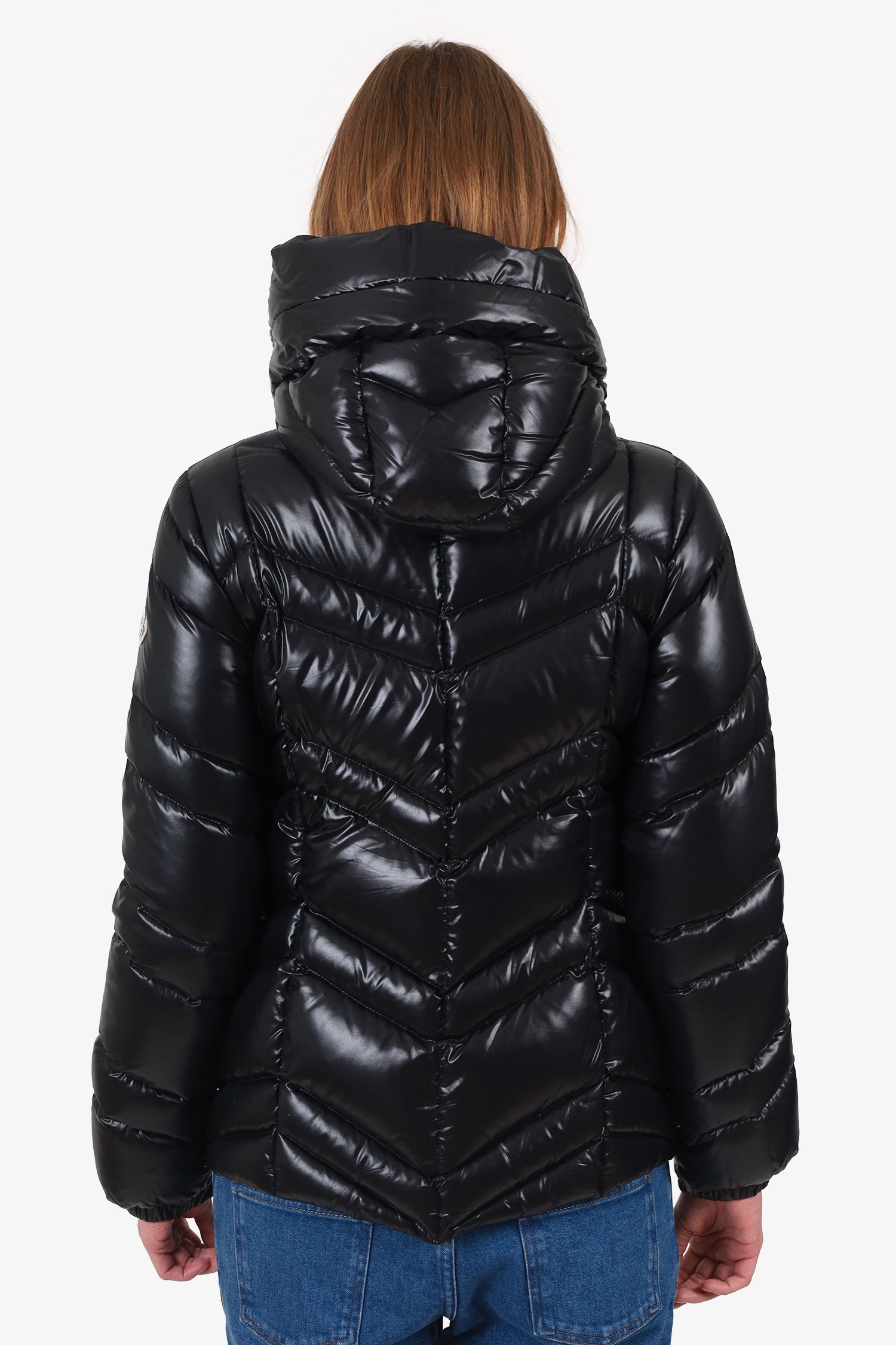 Refresh availabilityMoncler Black Down Puffer Jacket With Hood. Pull-on. Hooded. Front zip-up closure. Adjustable strap at sleeve cuffs with button-up closure. Elasticized sleeve cuffs. 2 exterior pockets with zip-up closure. Tonal stitching.
