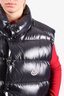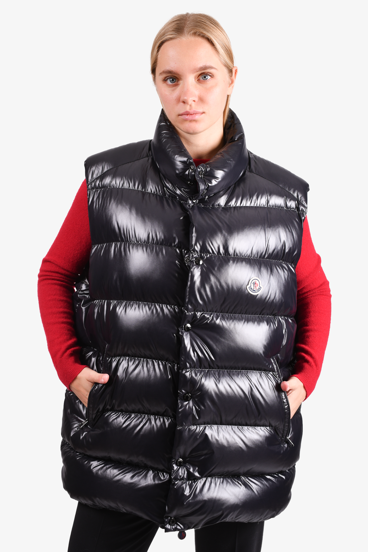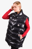 Refresh availabilityMoncler Black Down Puffer Vest. Front zip and snap button-up closure. Front zip pockets. Lined. Brand logo patch at the front. Tonal stitching.