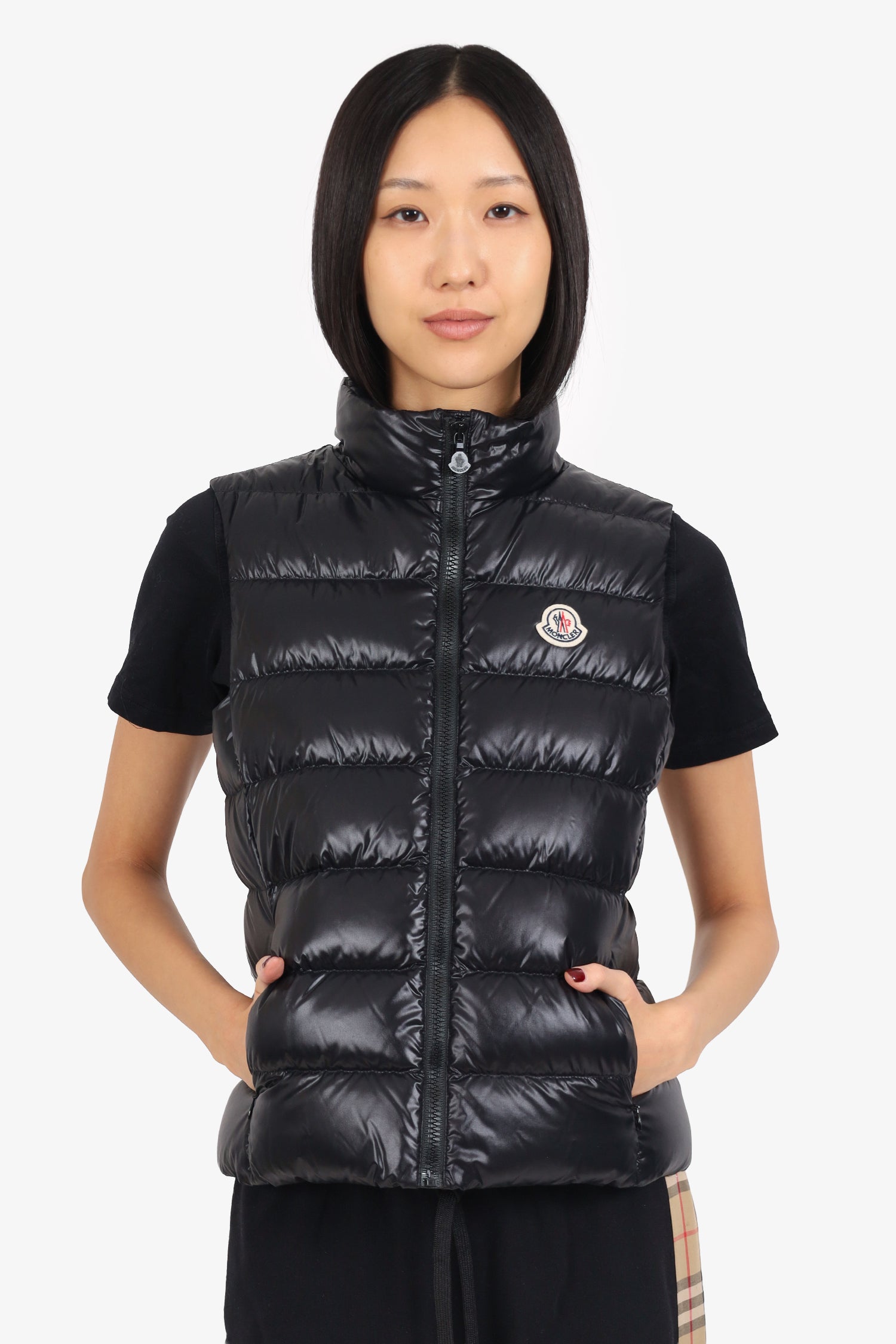 Refresh availabilityMoncler Black Down Quilted Vest. Pull-on. Mock neckline. Front zip closure. 2 front exterior zip pockets. Tonal stitching.