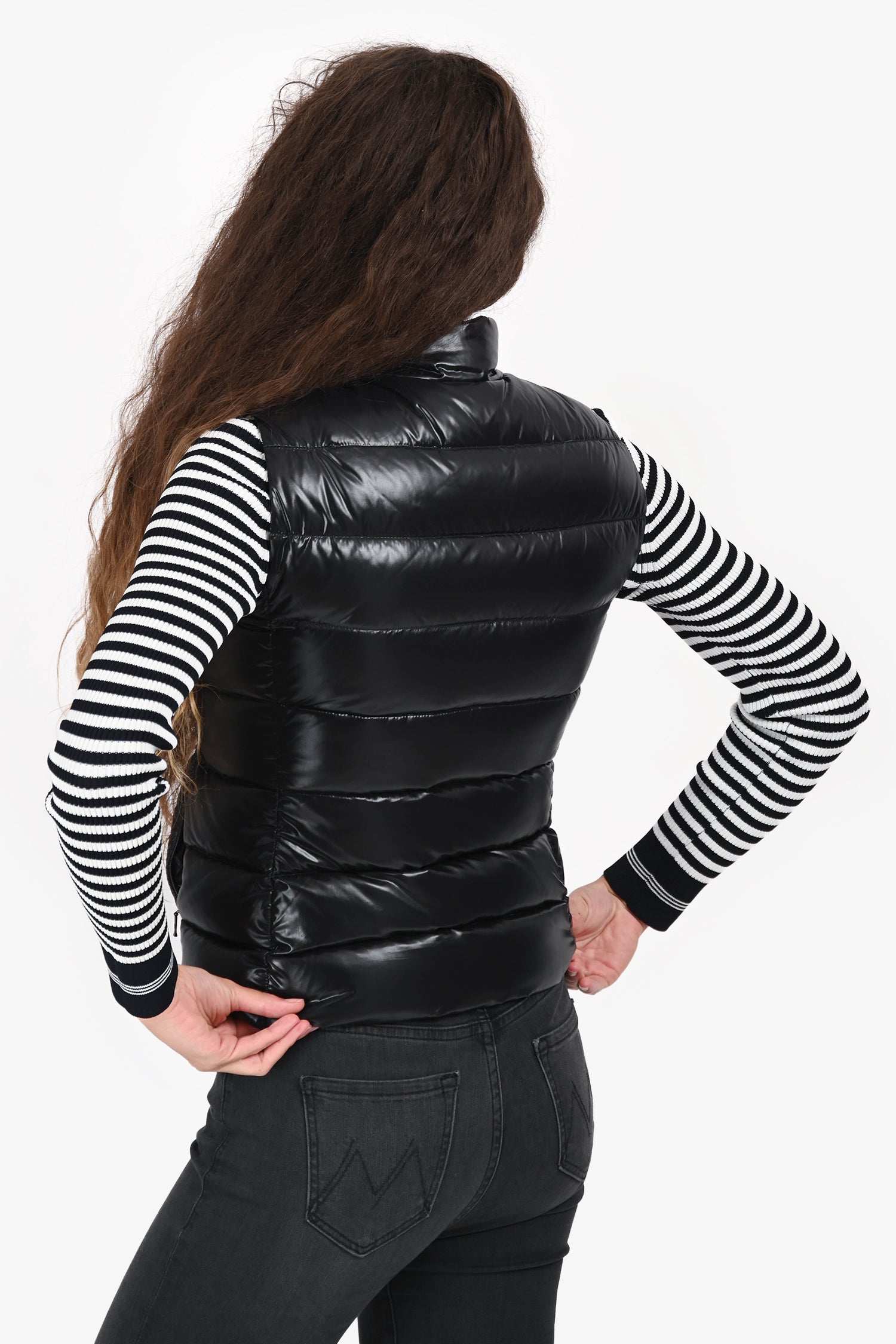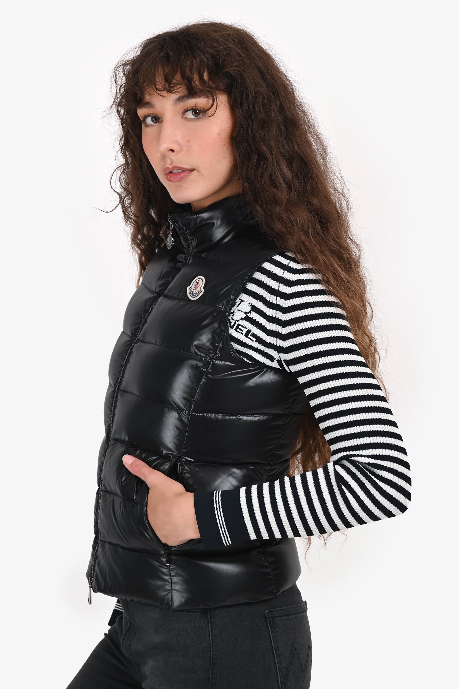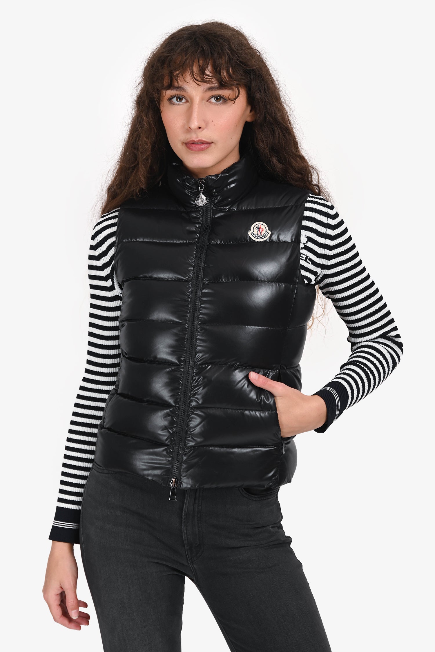 Refresh availabilityMoncler Black Ghany Down Vest. Slip-on. 2-way front zip closures. Front brand logo patch. 2 front zip pockets. Tonal stitching.