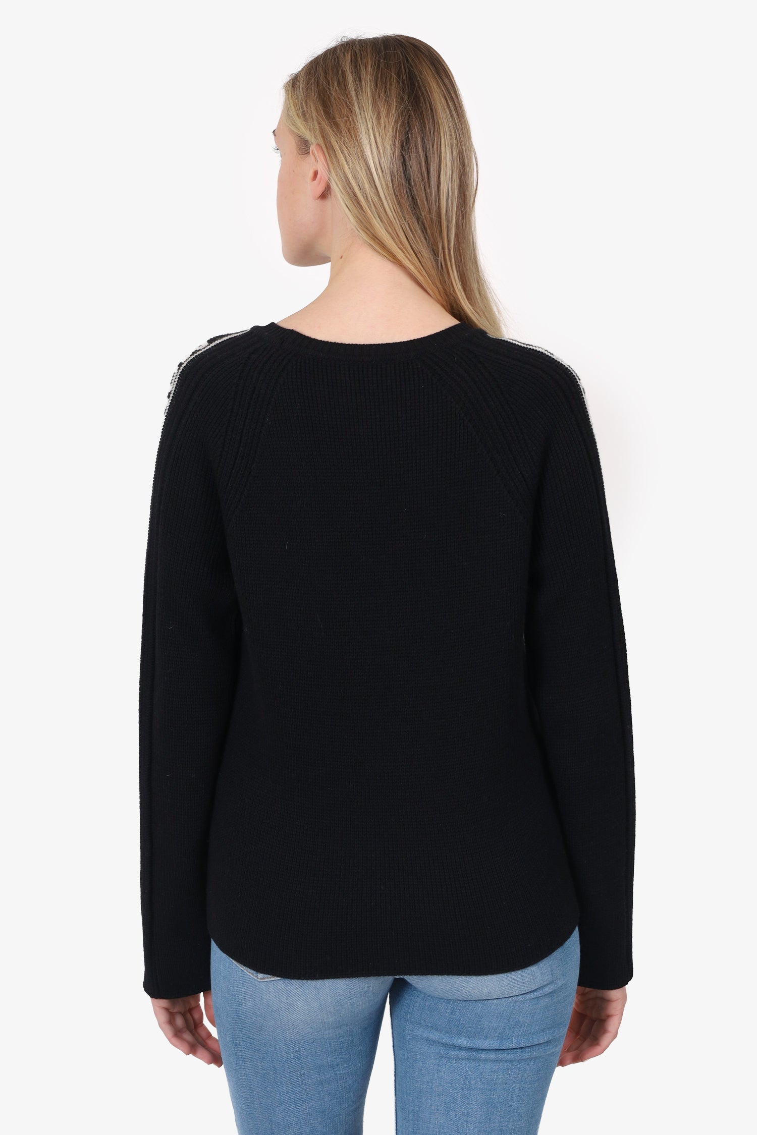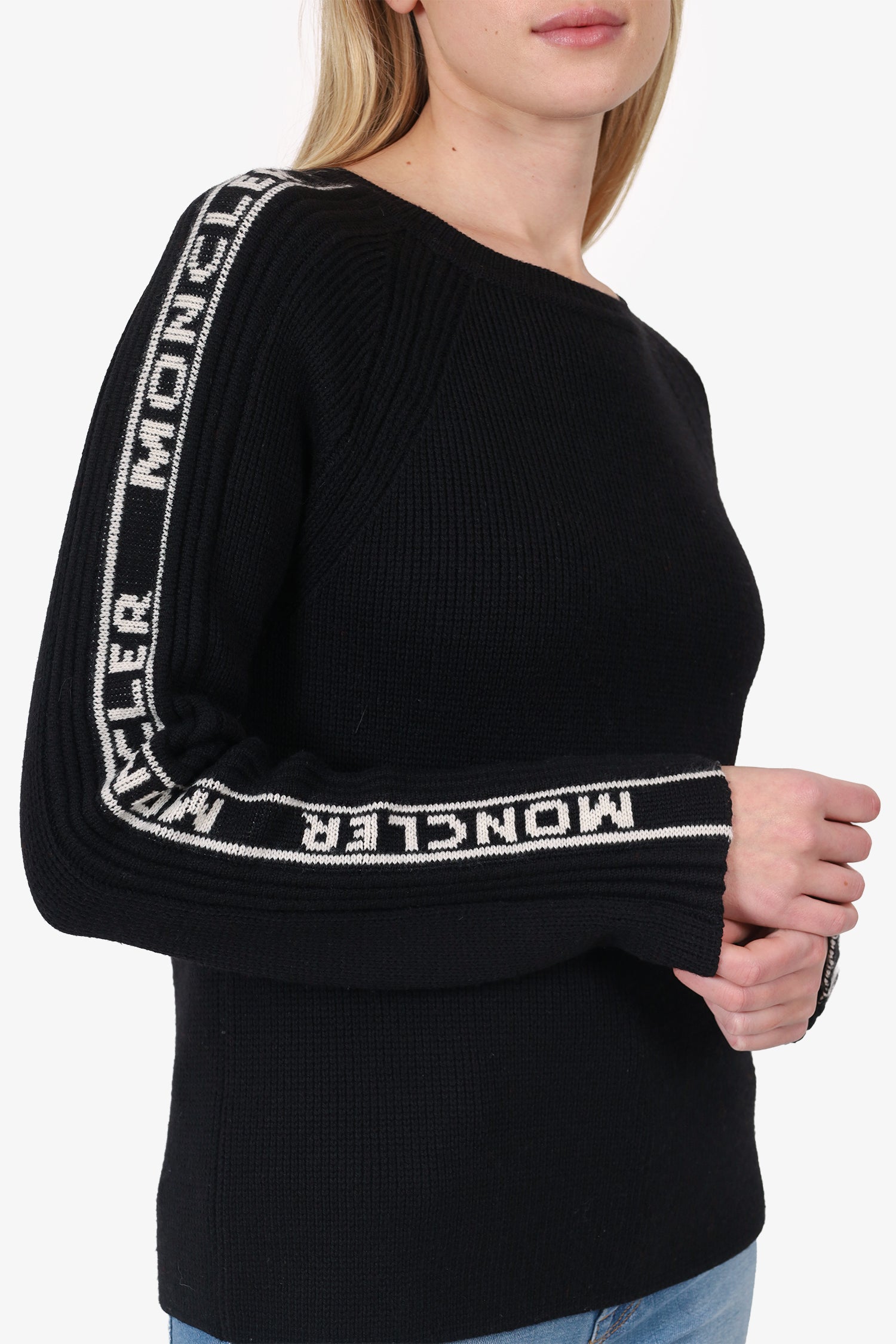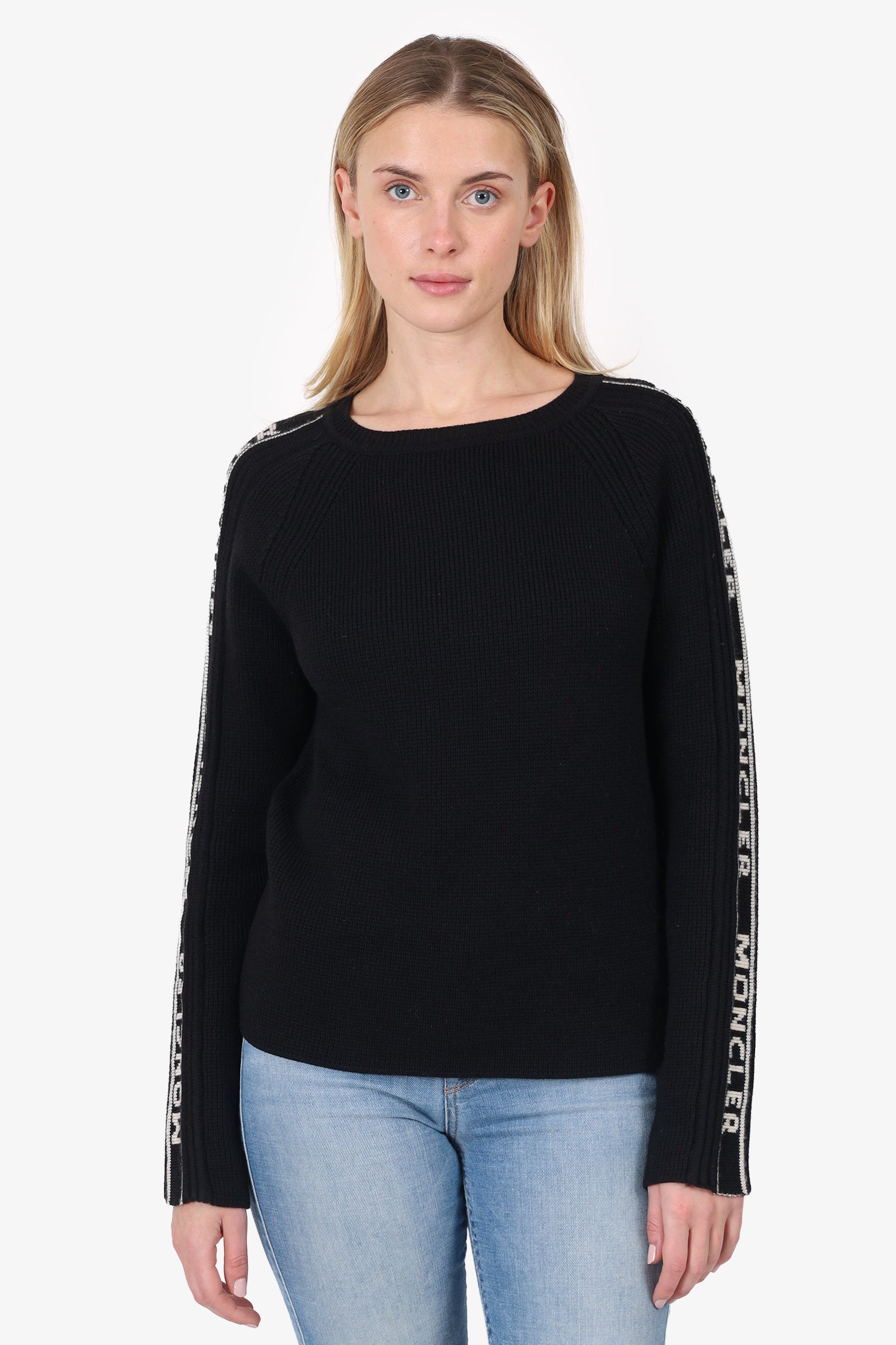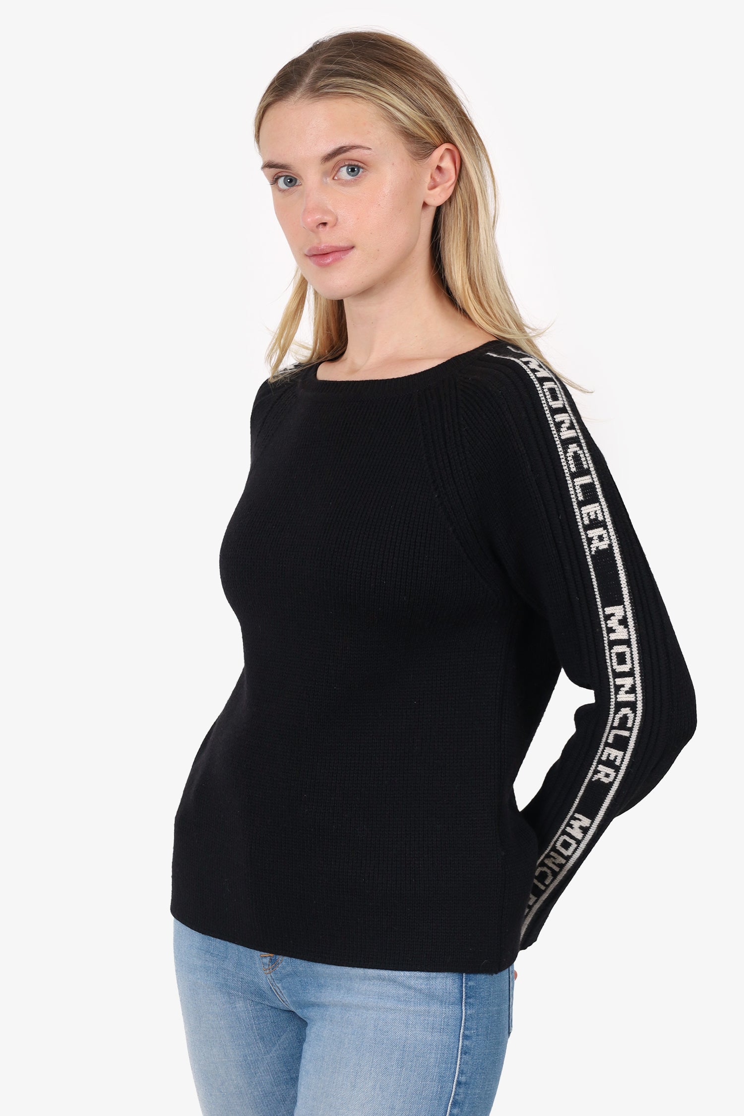 Refresh availabilityMoncler Black Knit Logo Sweater. Pull-on. Round neckline. Contrast and tonal stitching.