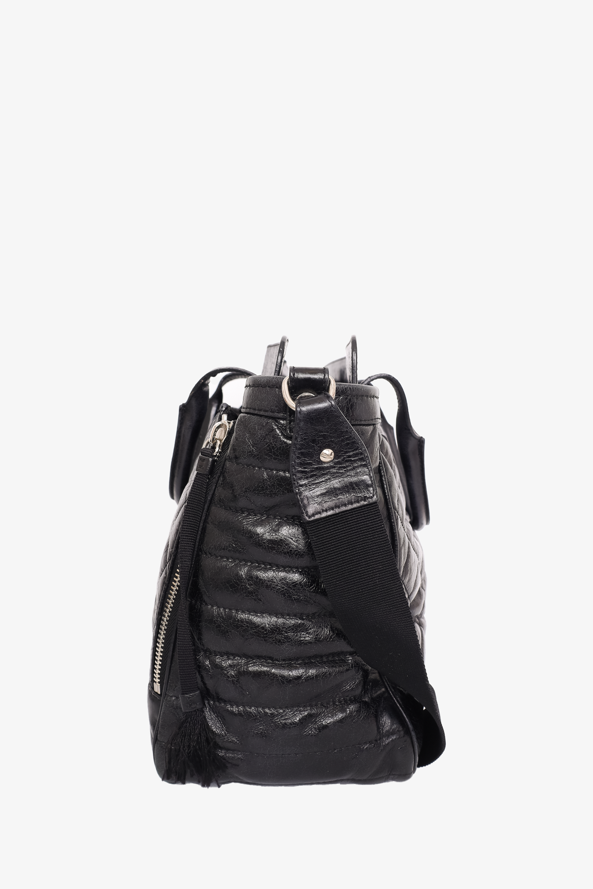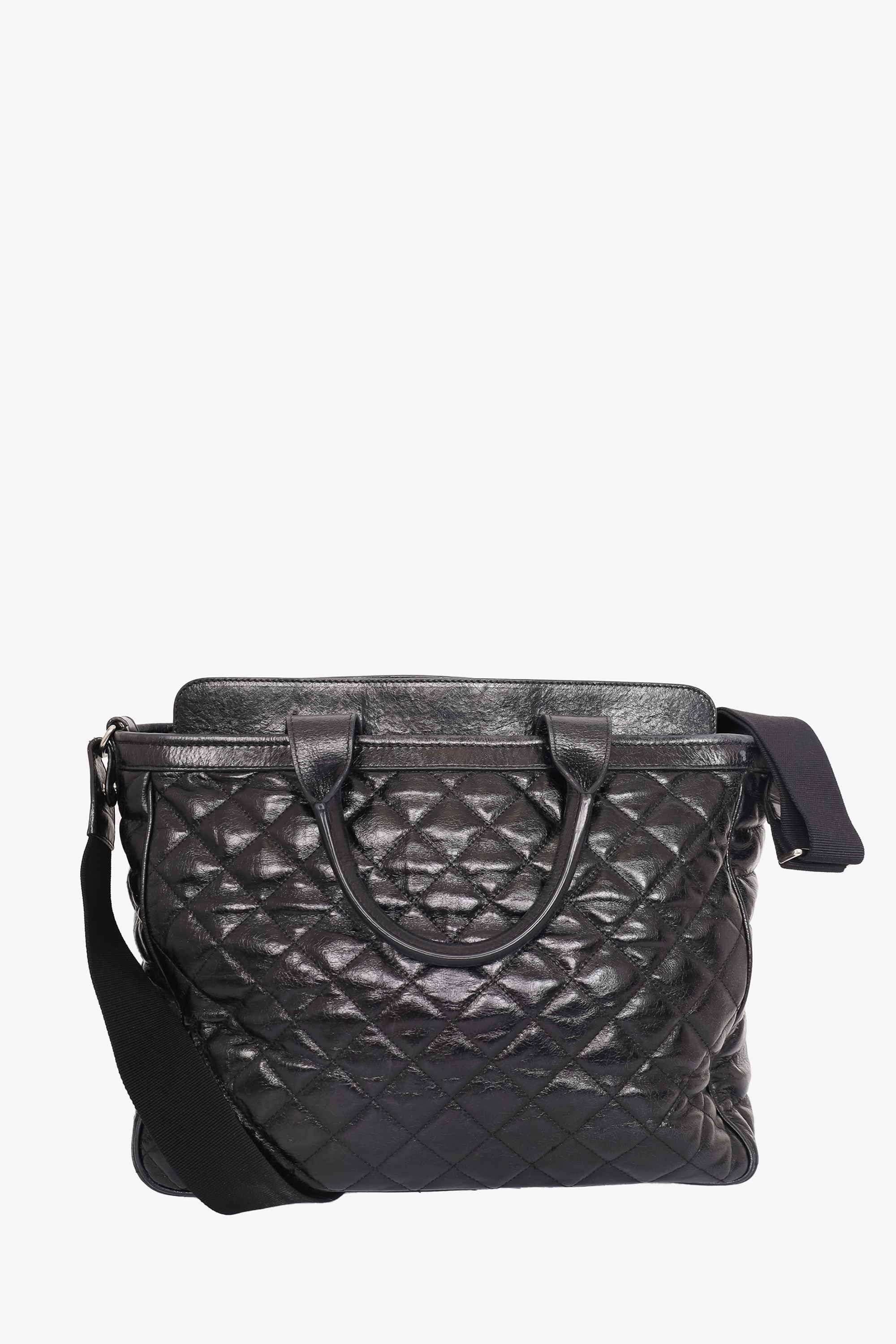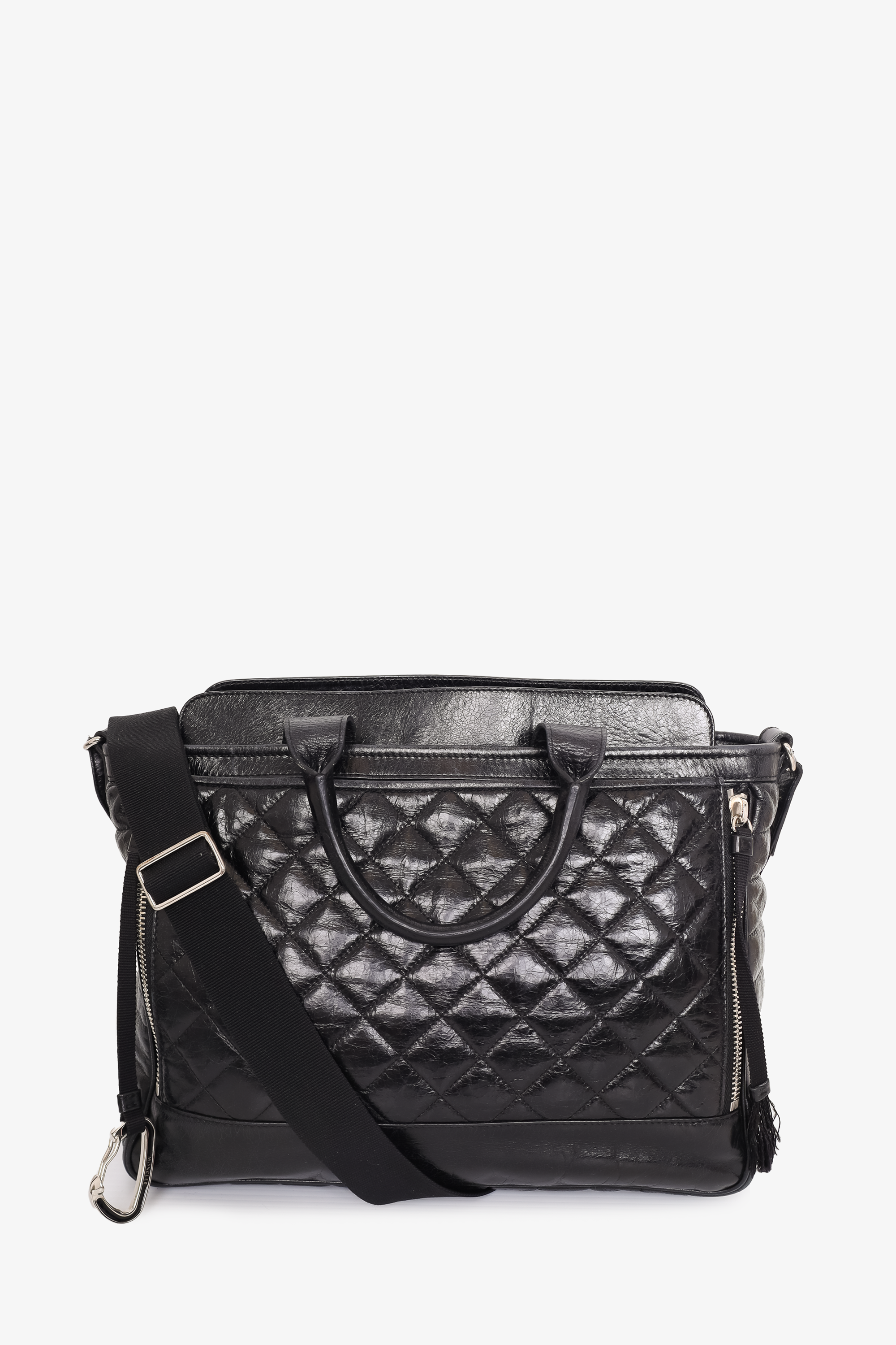 Refresh availabilityMoncler Black Leather Quilted Tote Bag with Strap. Silver-tone hardware. Top handles. Top zipper closure. Removable/adjustable strap. 1 exterior slip pocket with magnetic closure. 1 interior slip pocket. 1 interior zip pocket. Tonal stitching.