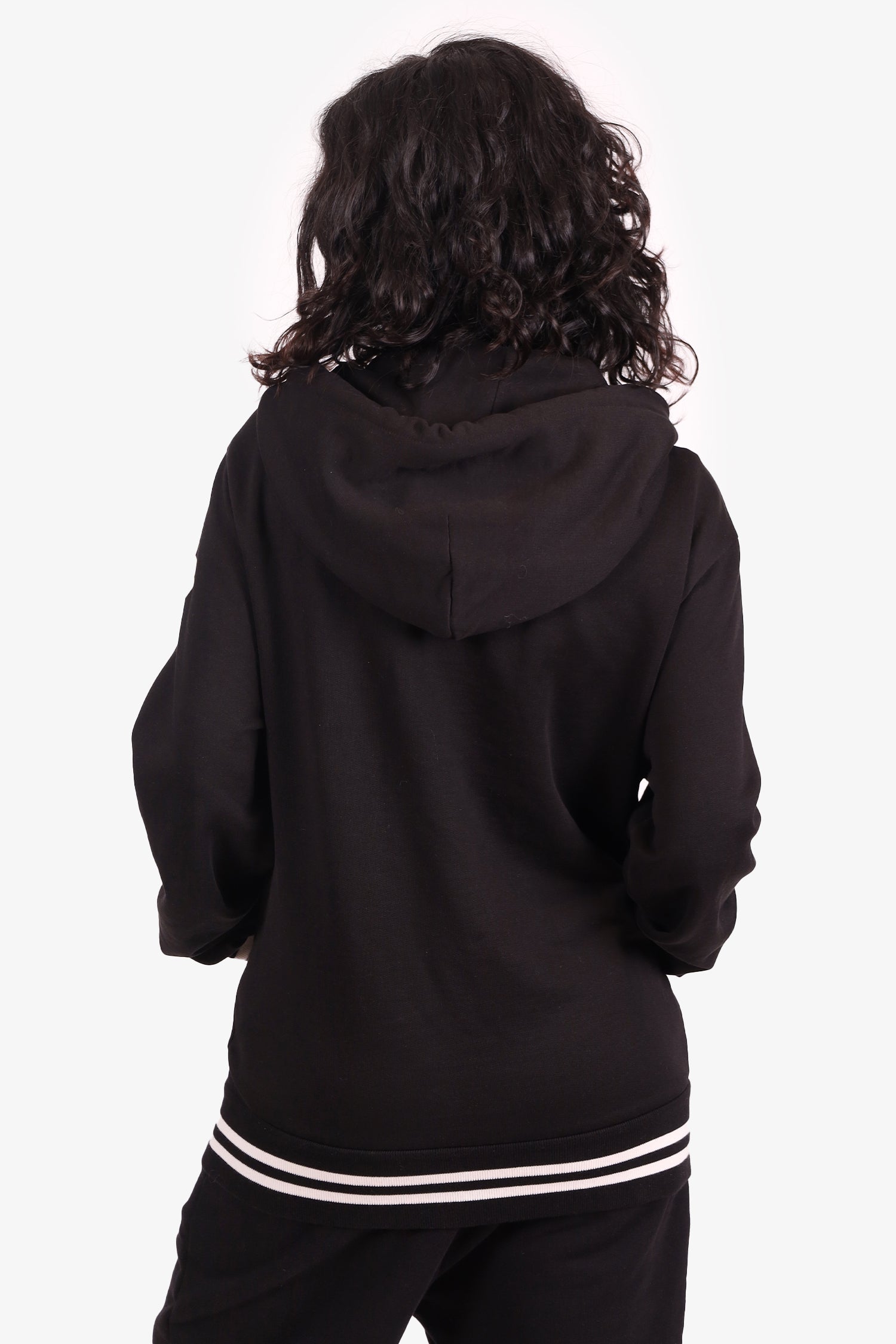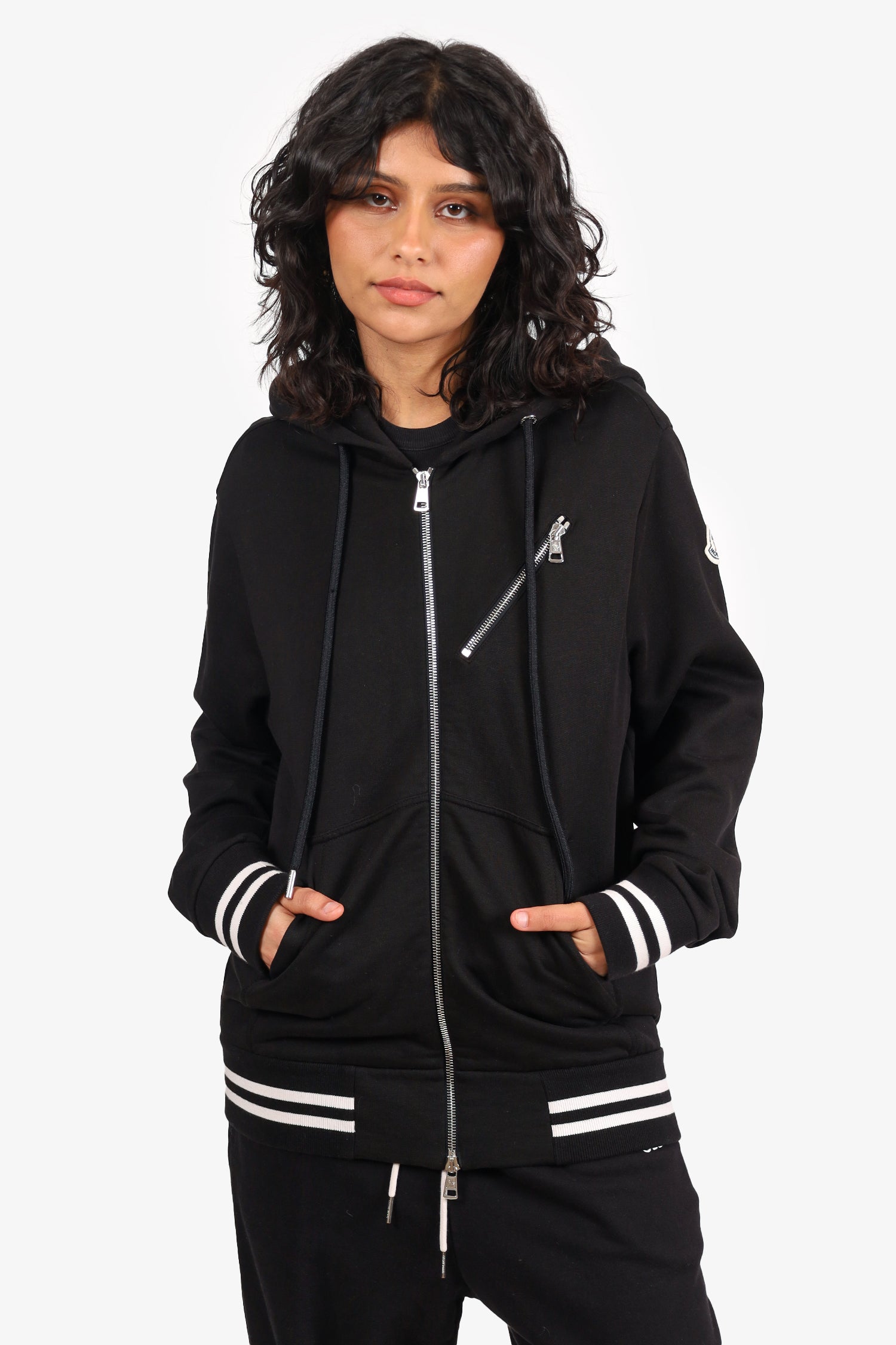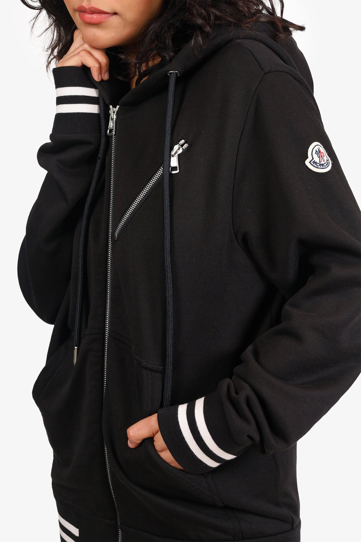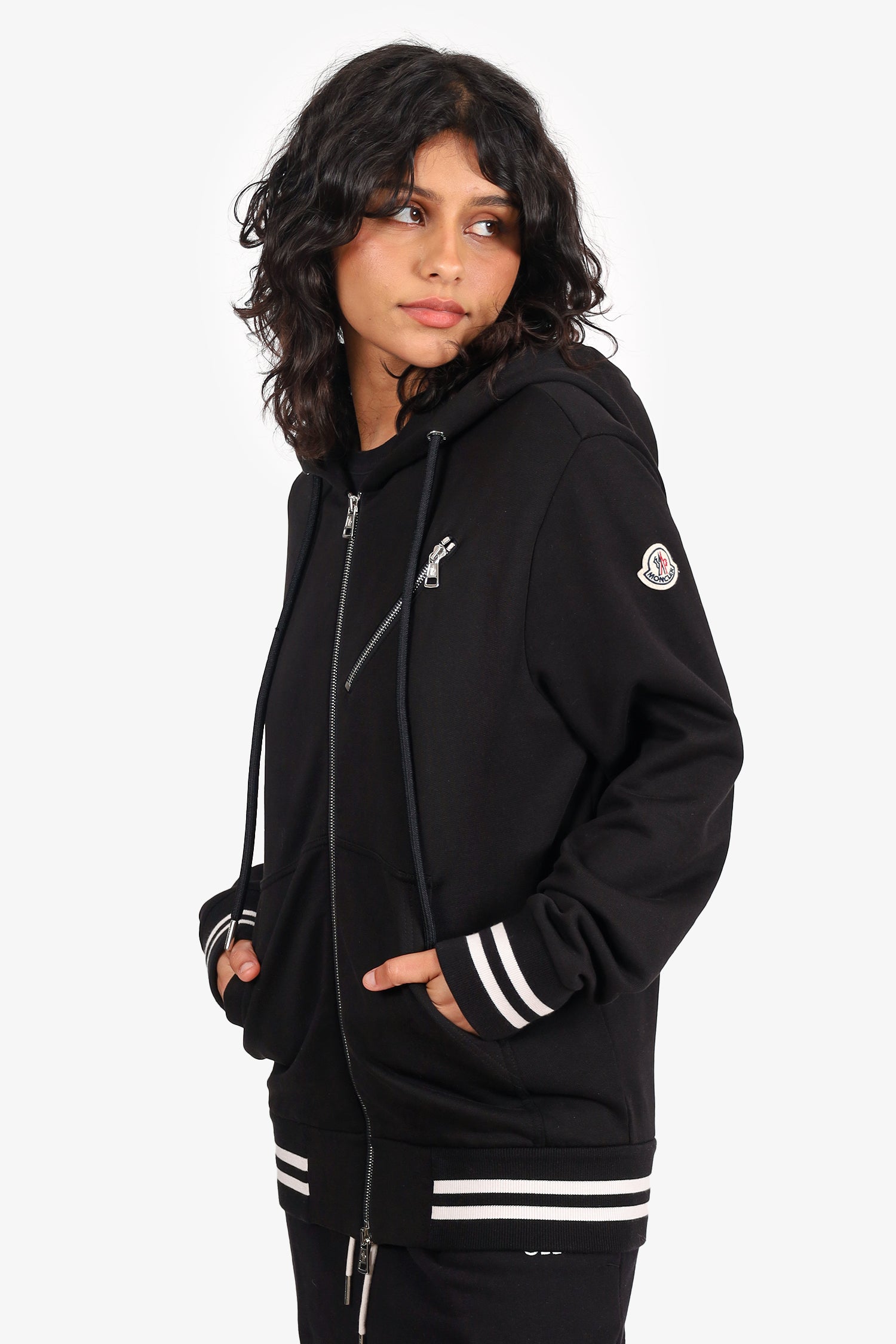 Refresh availabilityMoncler Black Logo Applique Cotton Zip-Up Hoodie. Pull-on. Front zip closure. Hooded with drawstring closure. 3 front exterior pockets; 2 slip and 1 zip. Silver-tone hardware. Tonal stitching.
