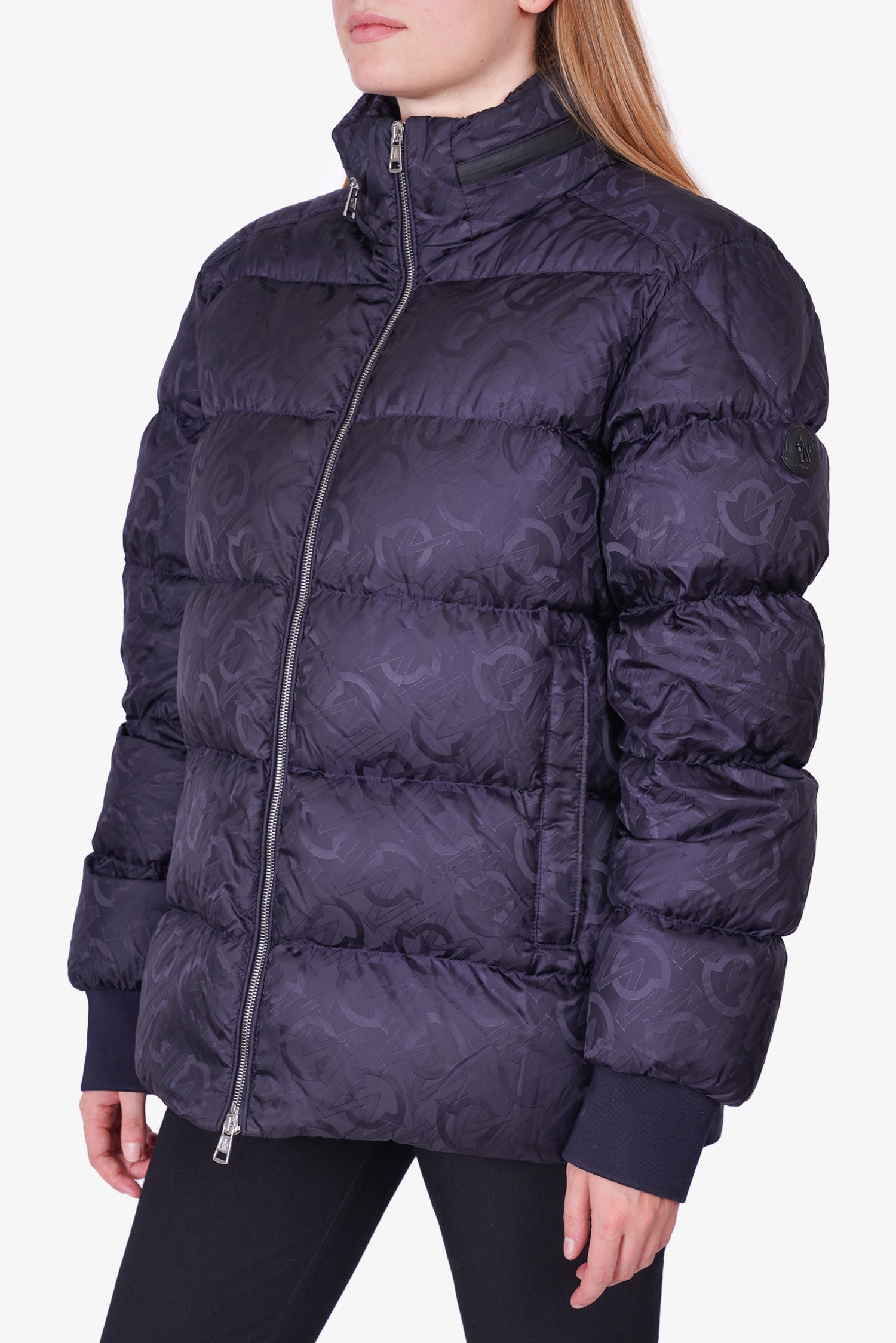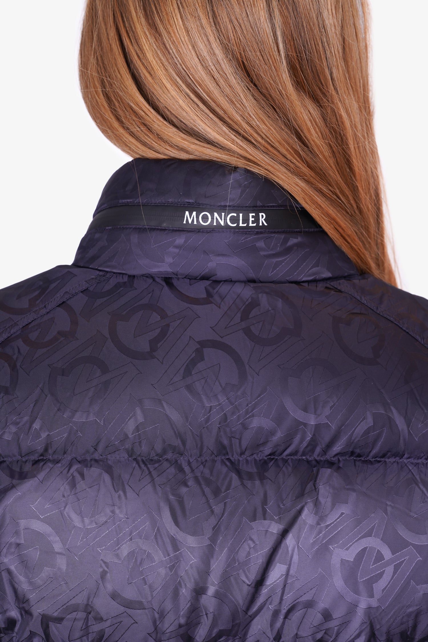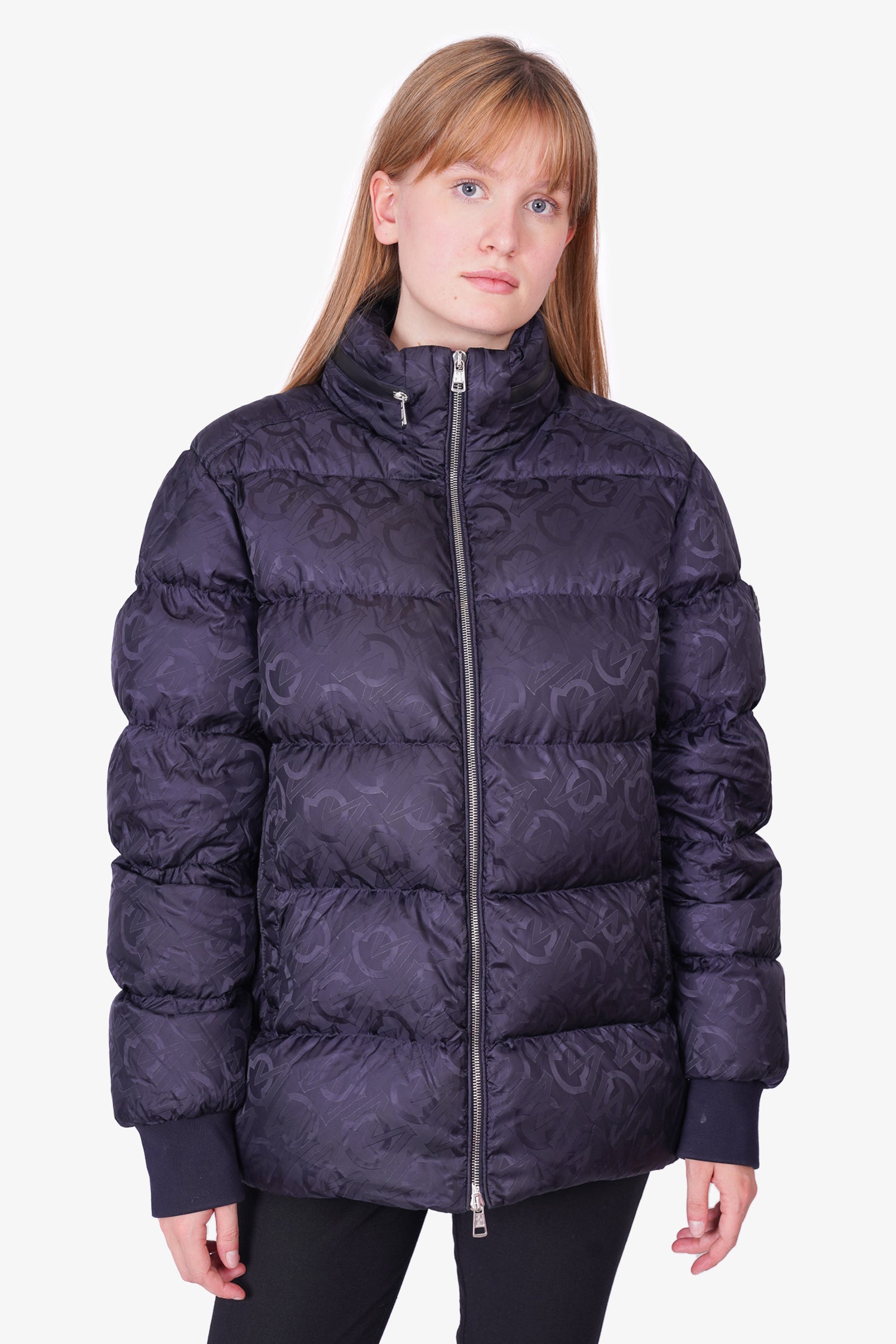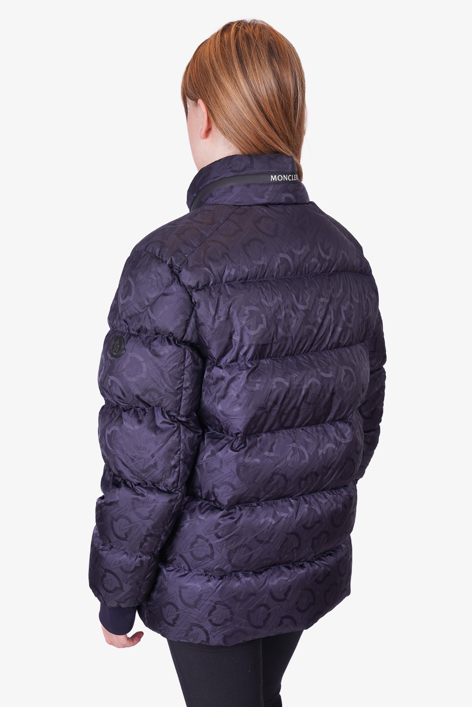 Refresh availabilityMoncler Black Logo Print Puffer Jacket. High neckline. Adjustable hood with zip closure. Front zip up closure. 2 front zip-up pockets. Puffed sleeves. Interior lining. Singular interior zip up pocket. Silver-toned hardware. Tonal stitching.