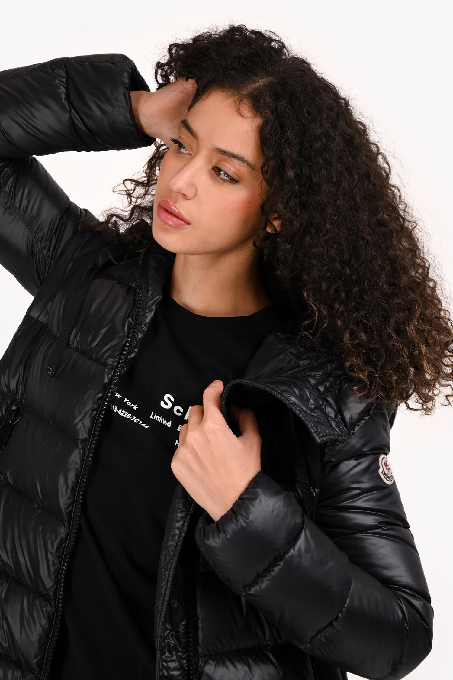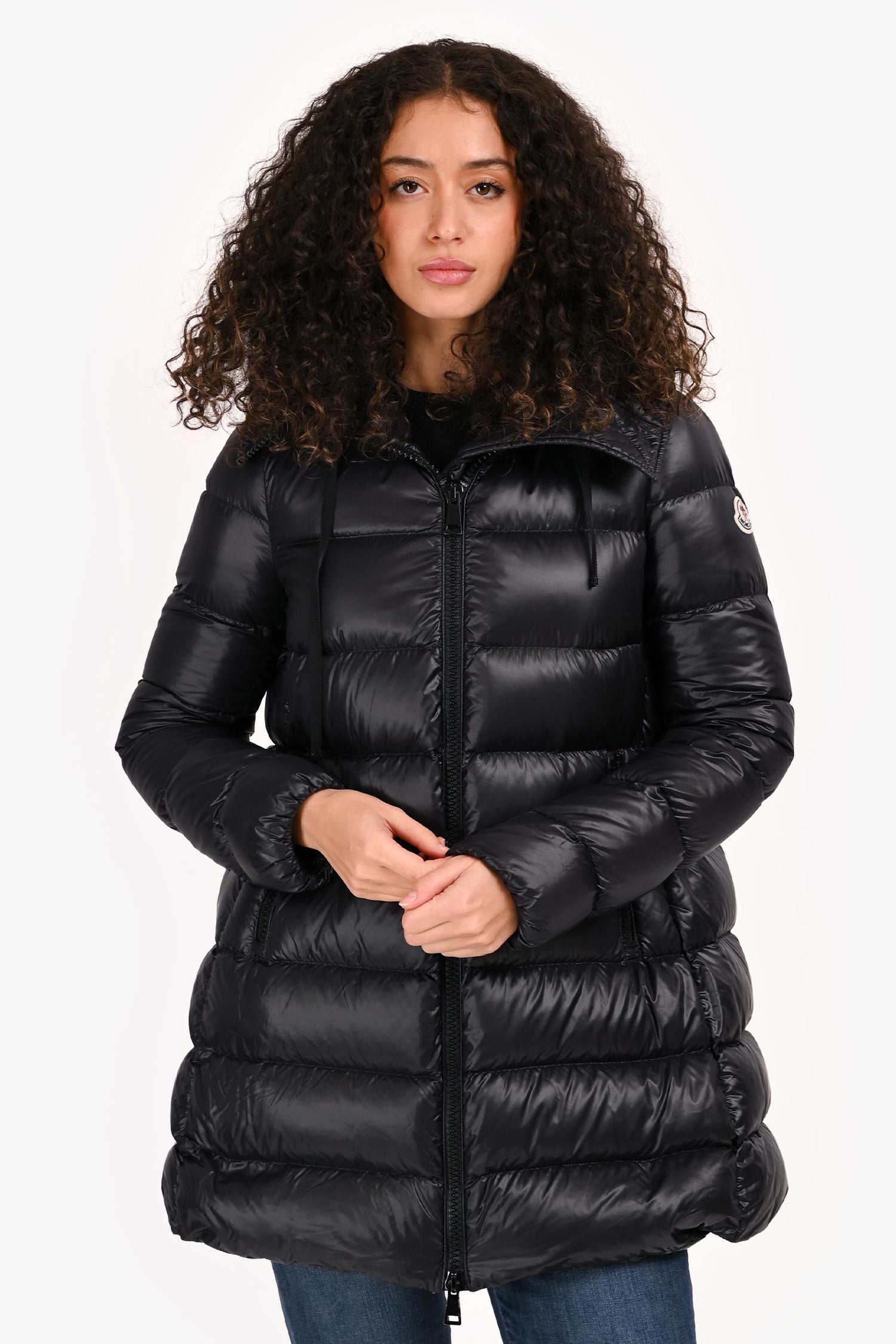 Refresh availabilityMoncler Black Midi Hooded Down Jacket. Pull-on. Front zip closure. Drawstring hood. 2 exterior zip pockets. Tonal stitching.