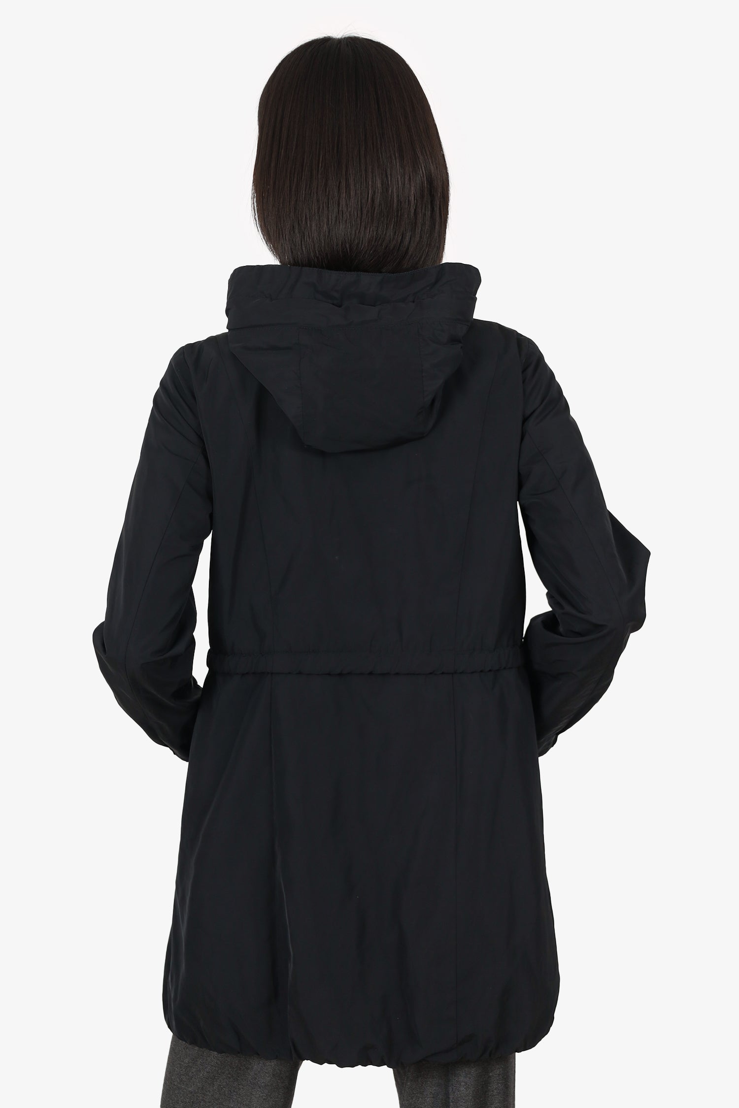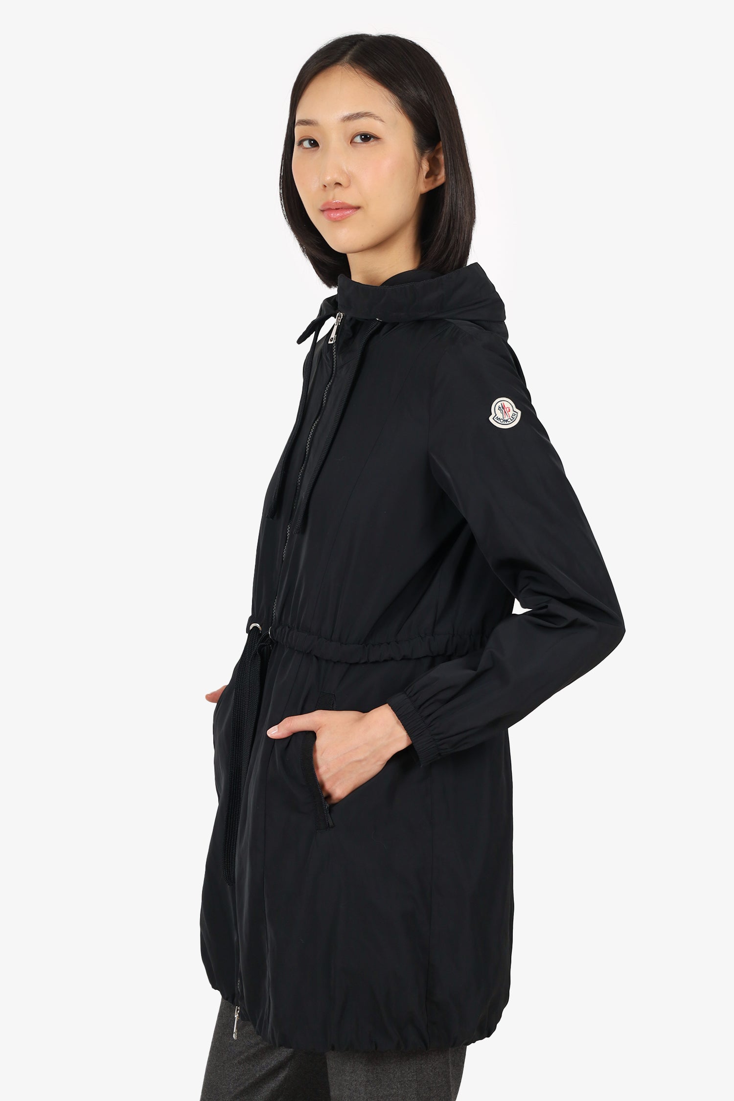 Refresh availabilityMoncler Black Nylon Drawstring Waist Band Zip-up Jacket. Pull-on. Front zip closure. Hooded with drawstrings. Adjustable drawstrings at waistband. 2 front zip pockets. Silver-tone hardware. Tonal stitching.