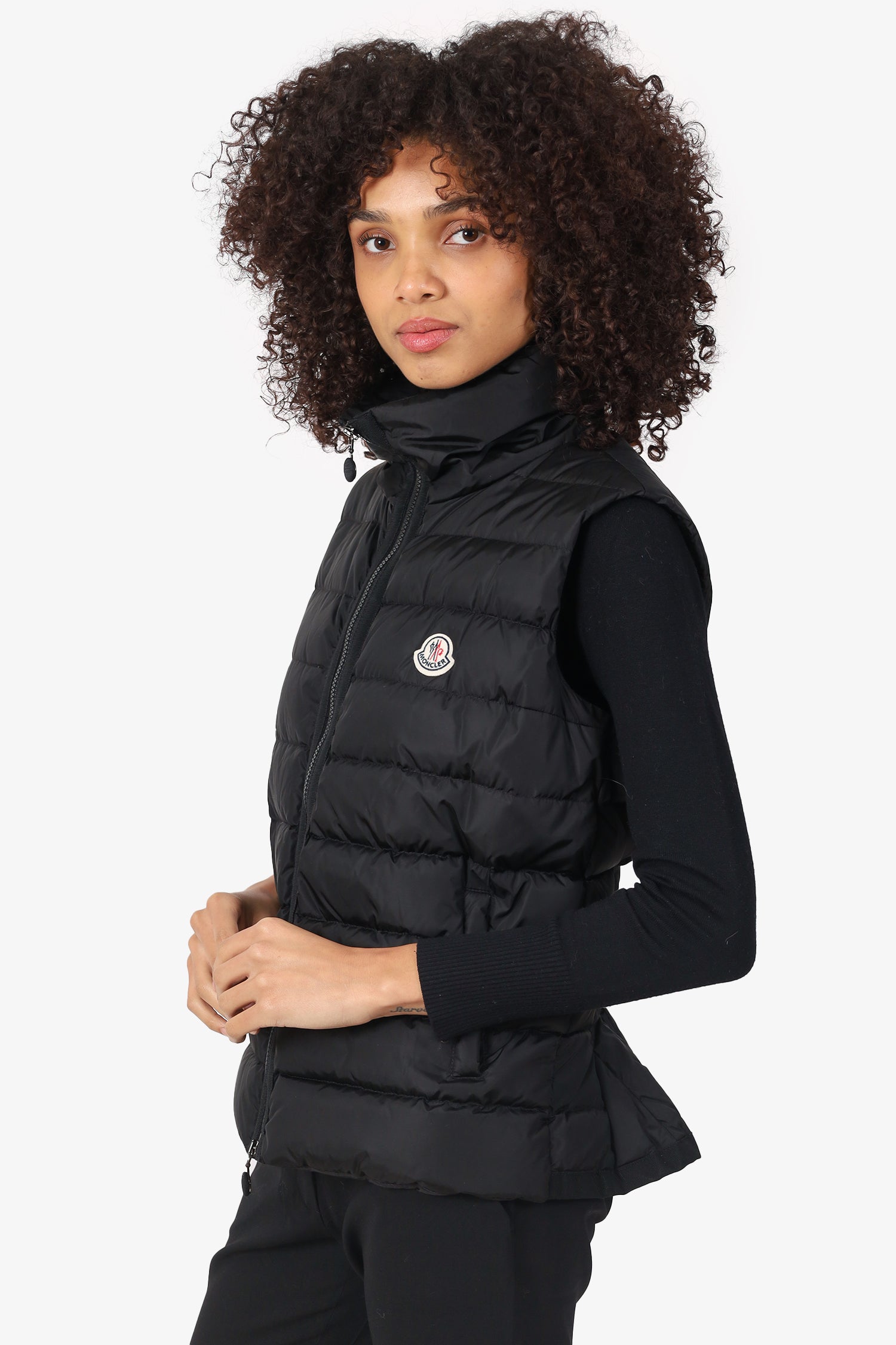 Refresh availabilityMoncler Black Nylone Anserine Puffer Vest. Pull on. High-neckline. 2-way front zip closure. 2 exterior front snap button-up pockets. Ruffle-detail to rear. Lined interior. Tonal stitching.