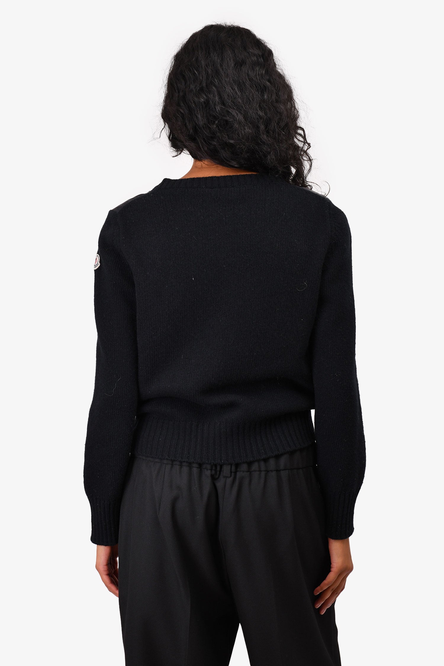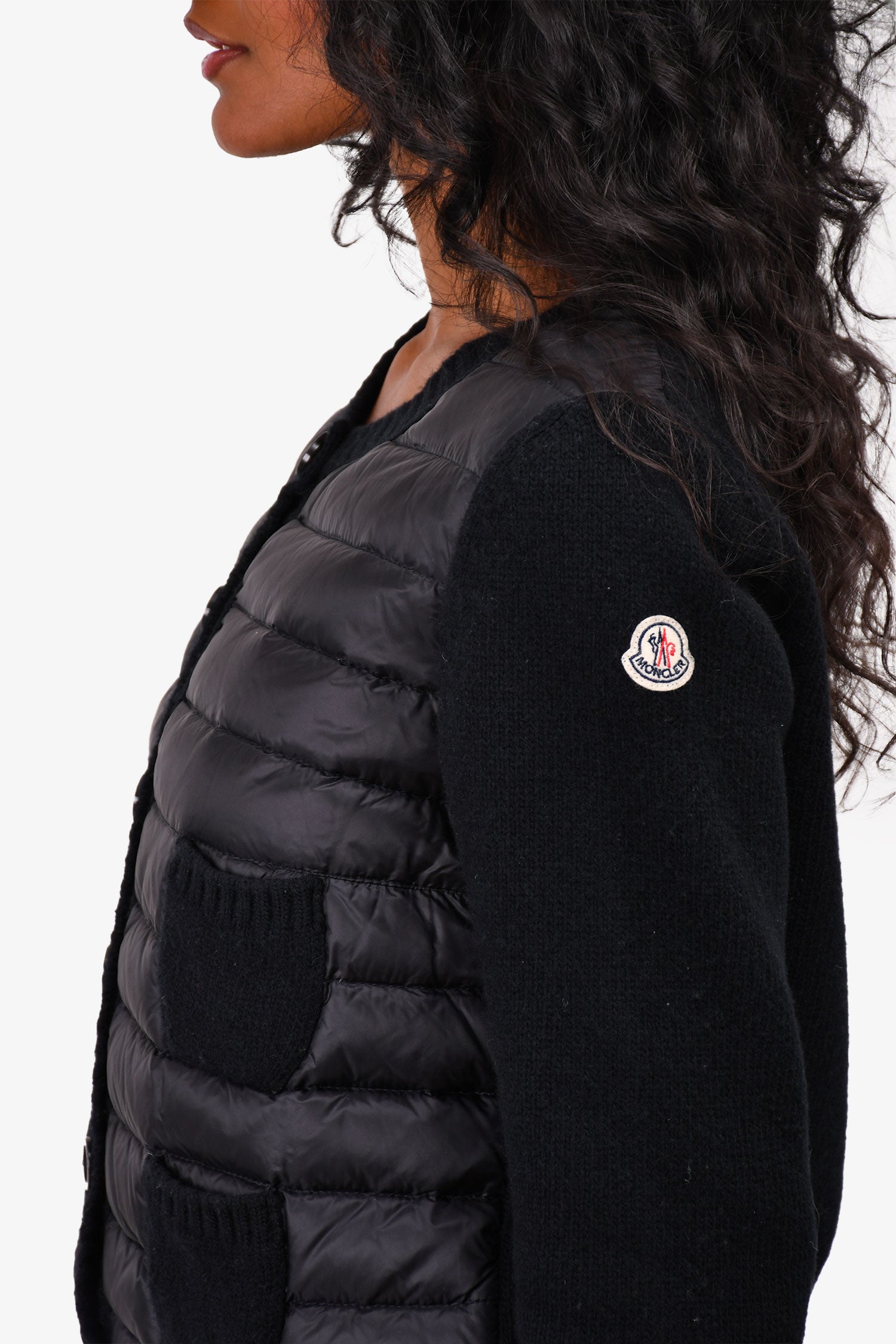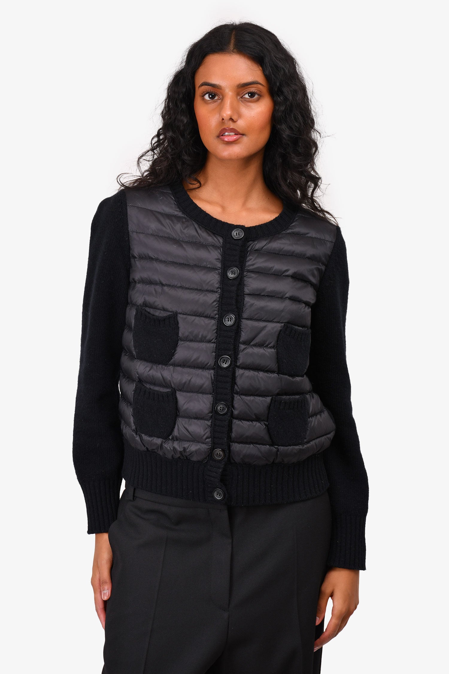 Refresh availabilityMoncler Black Padded 'Maglione Tricot' Knit Cardigan. Front button-up closure. Front mini pockets. Round neck. Ribbed neck, cuffs and hem.