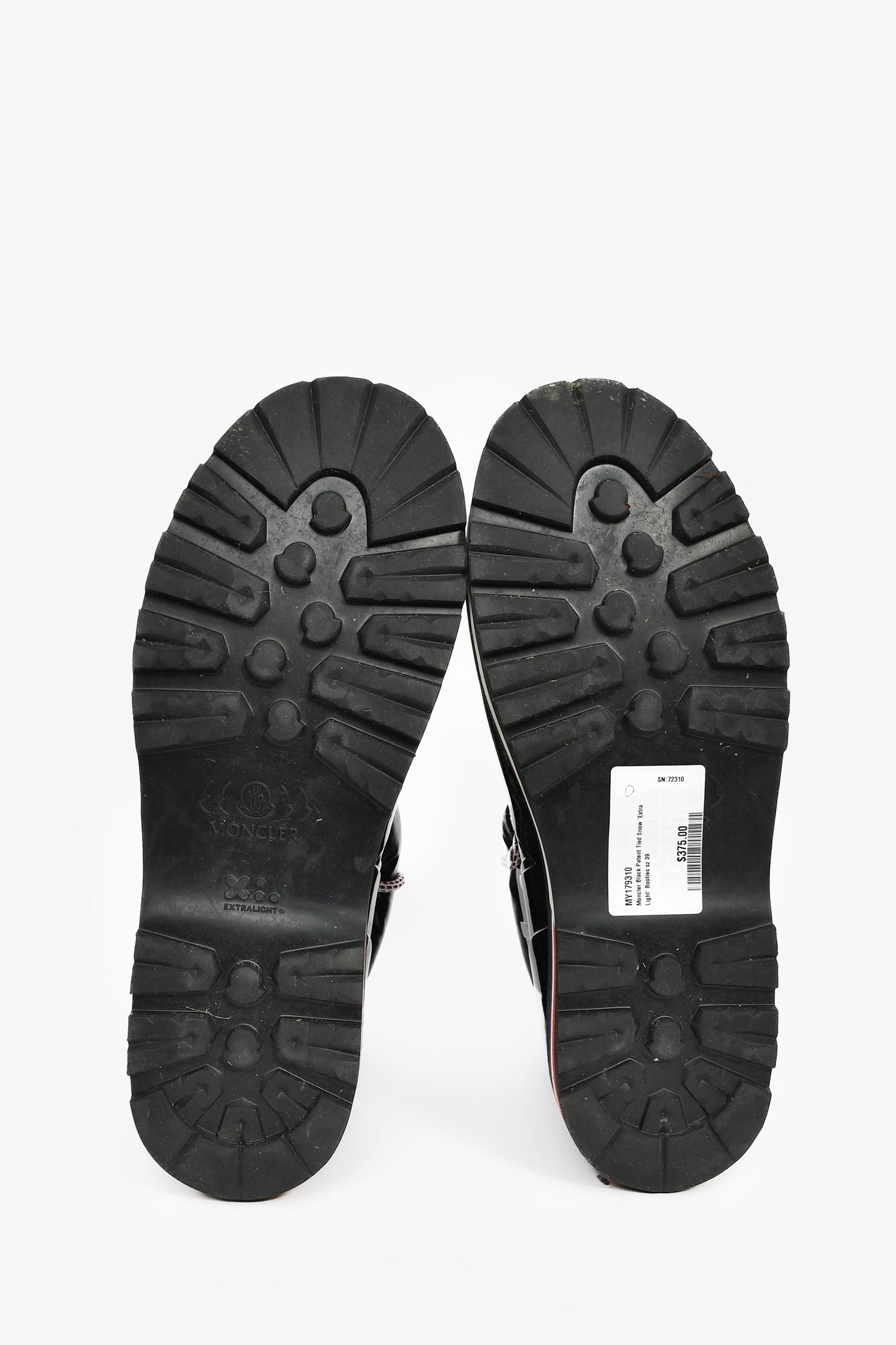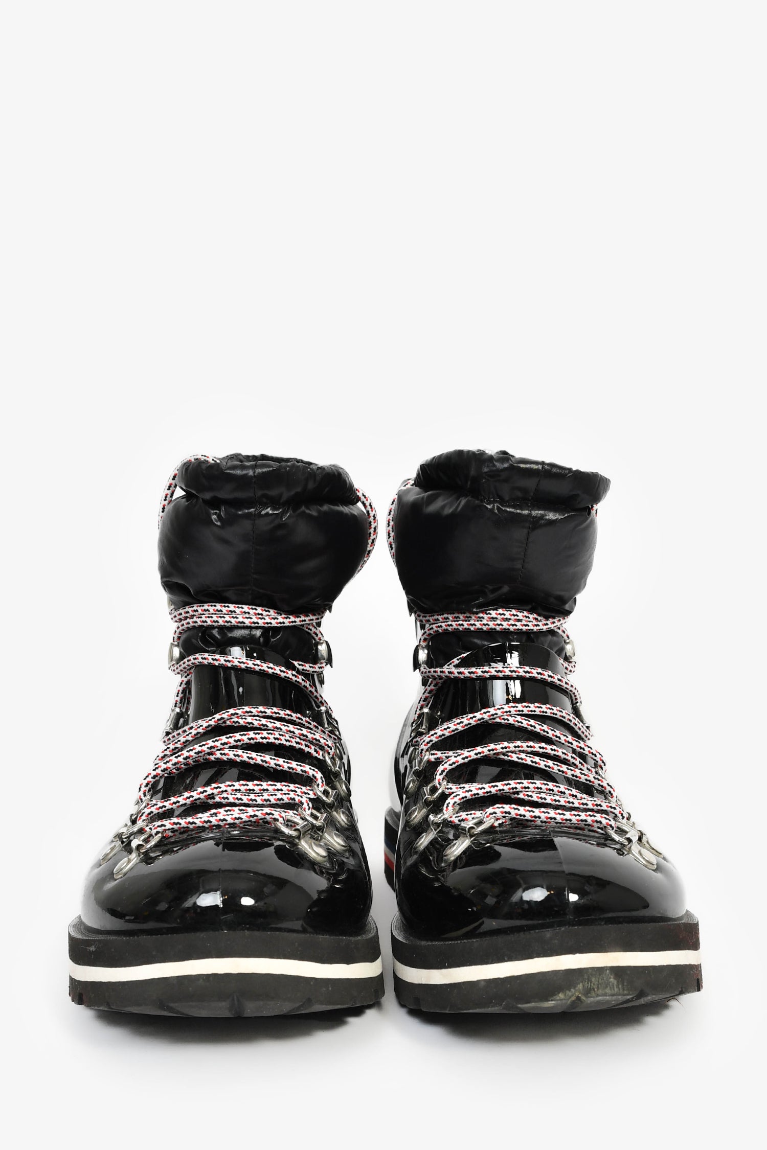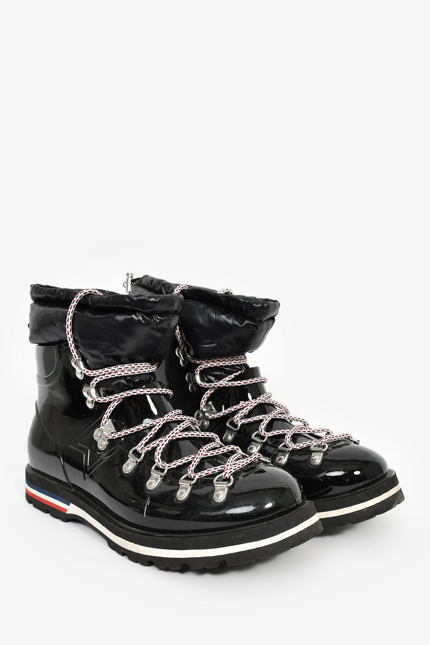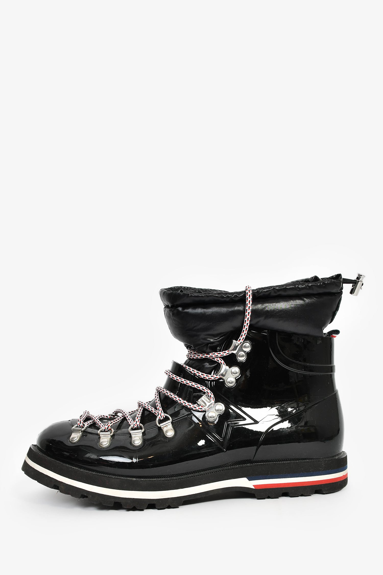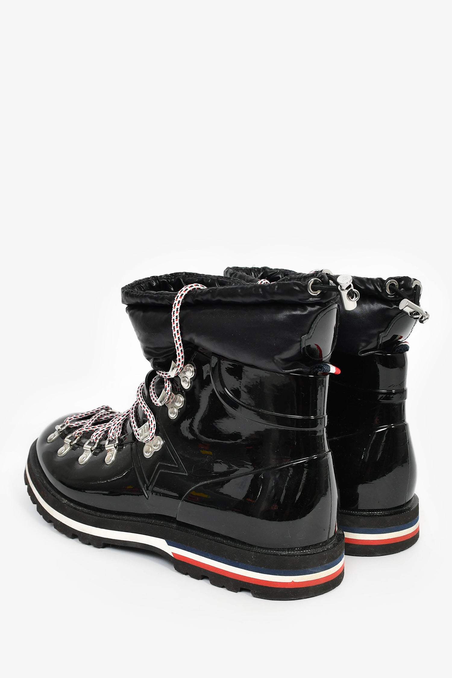 Refresh availabilityMoncler Black Patent Tied Snow 'Extra Light' Booties. Pull-on. Round toe. Front lace-up and drawstring closure. Textile lining. Silver-tone hardware. Tonal stitching.