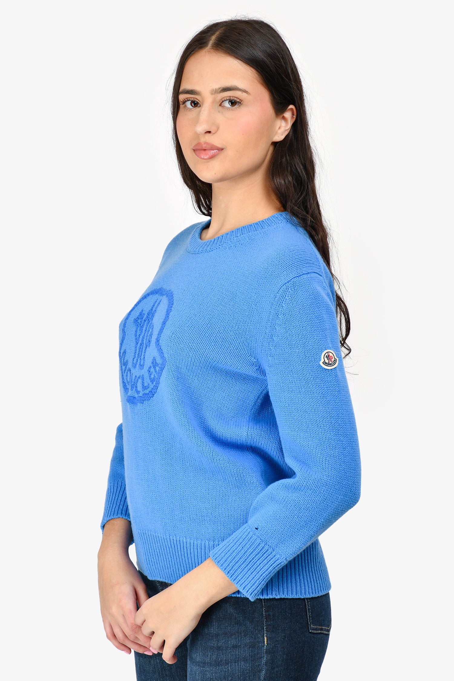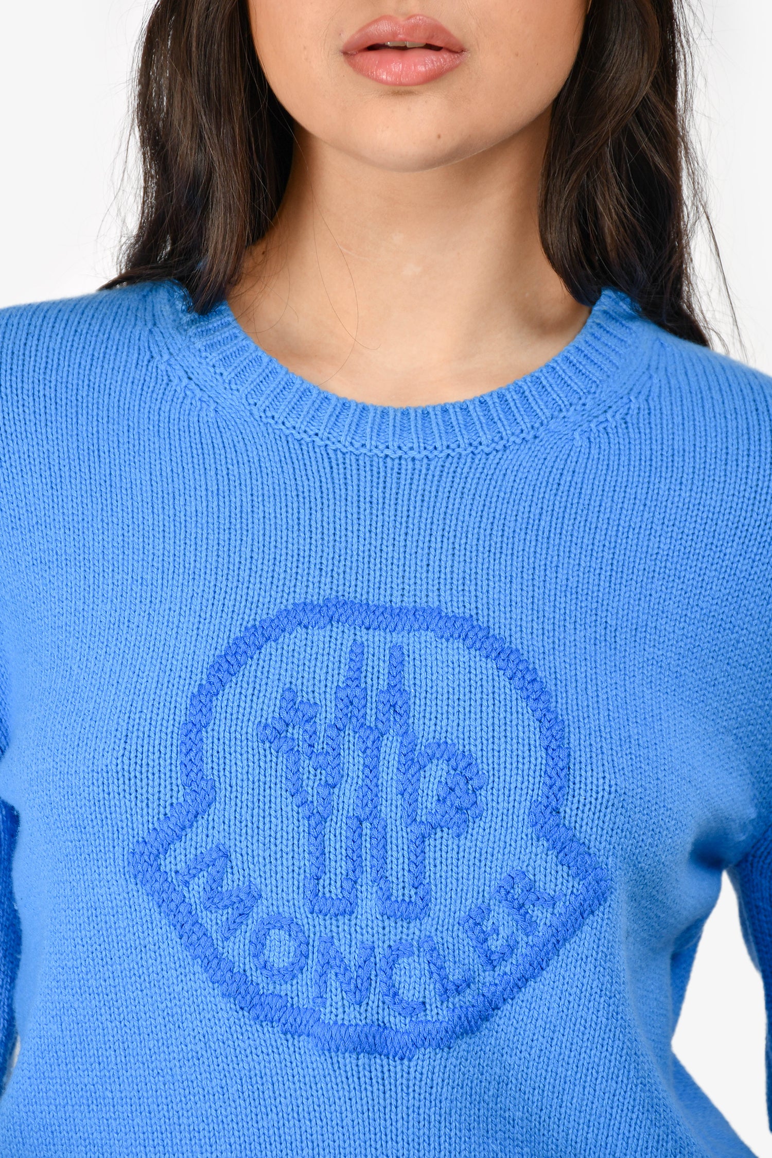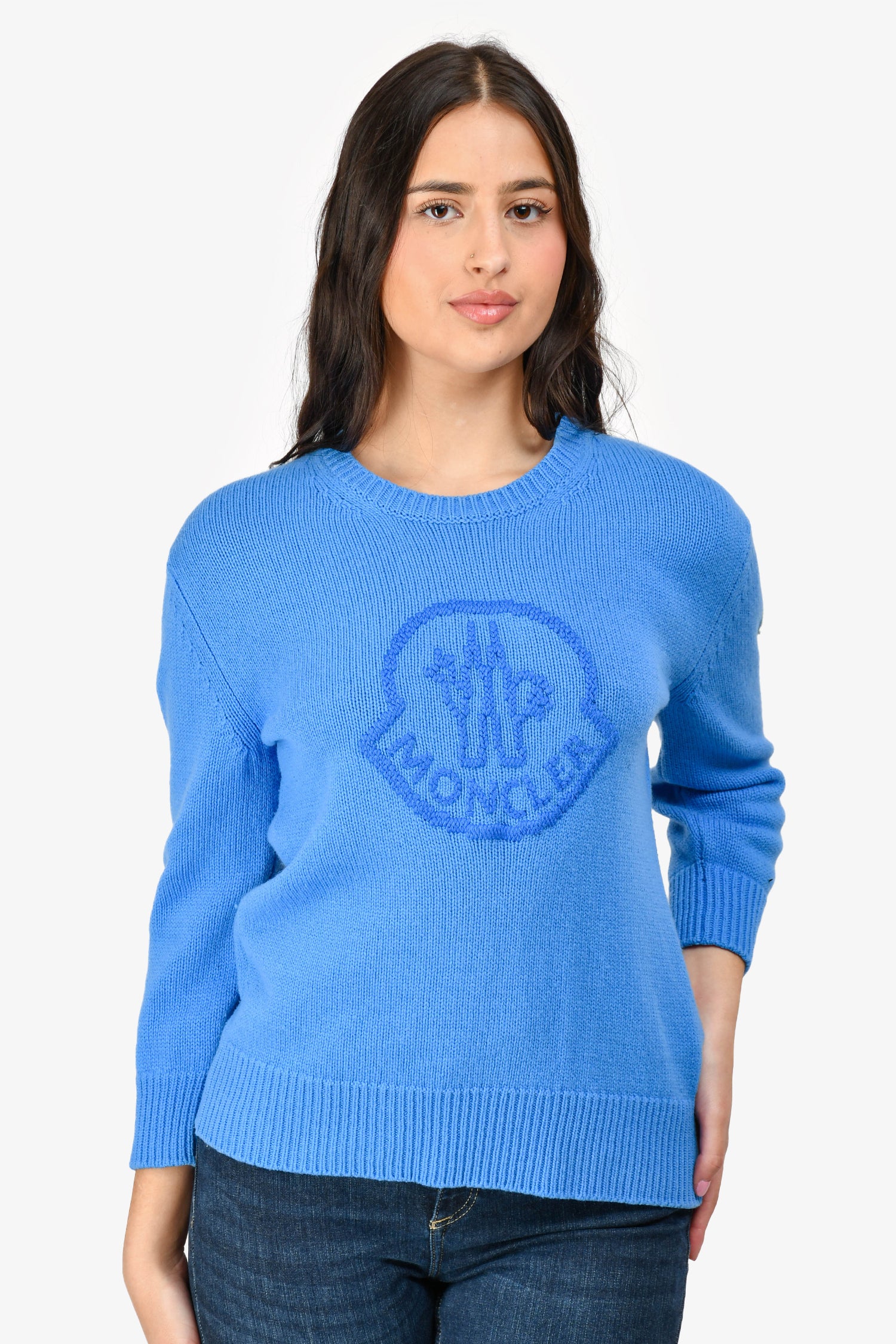 Refresh availabilityMoncler Blue Wool/Cashmere Logo Embroidered Sweater. Round-neckline. Ribbed neckline cuffs and hem.