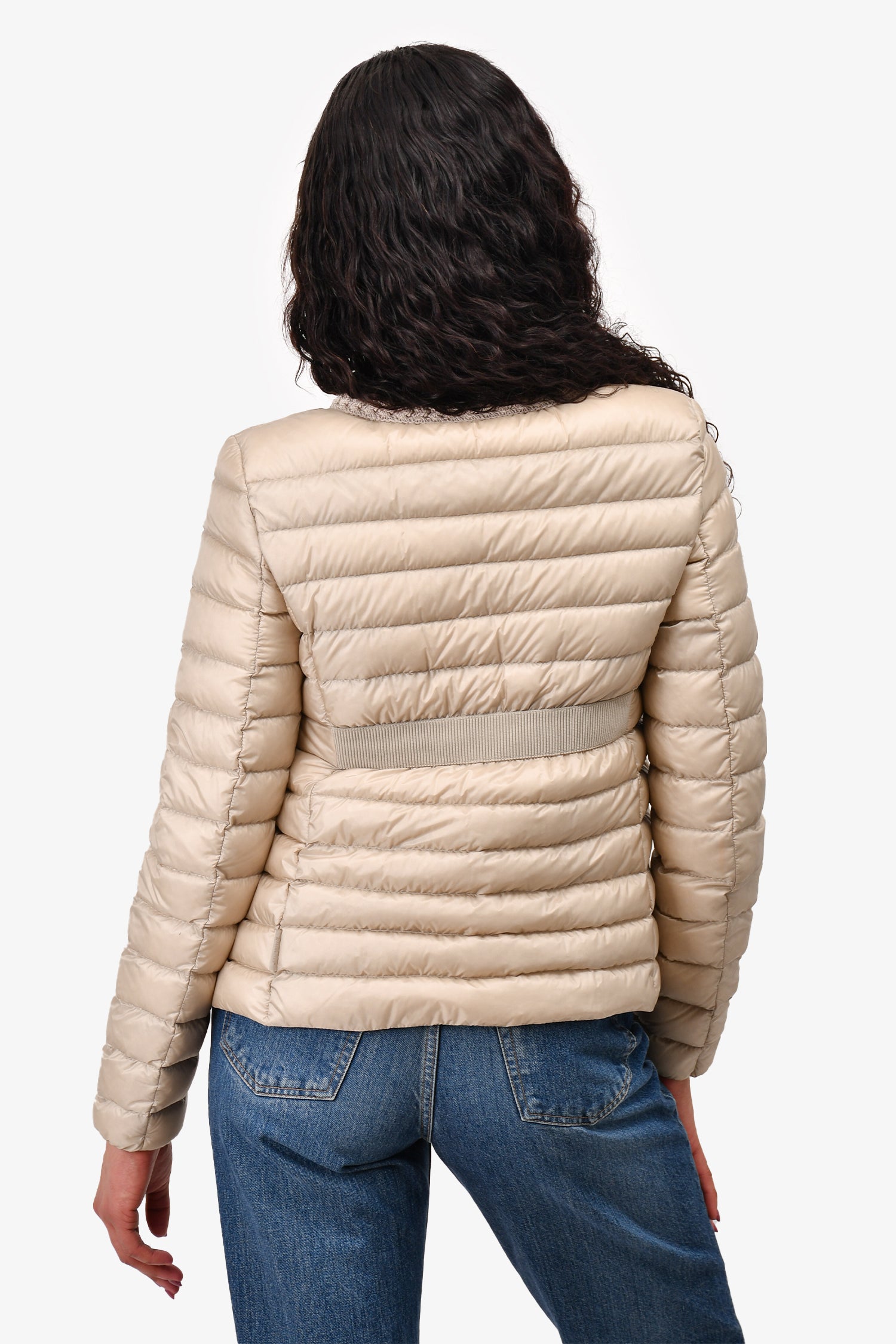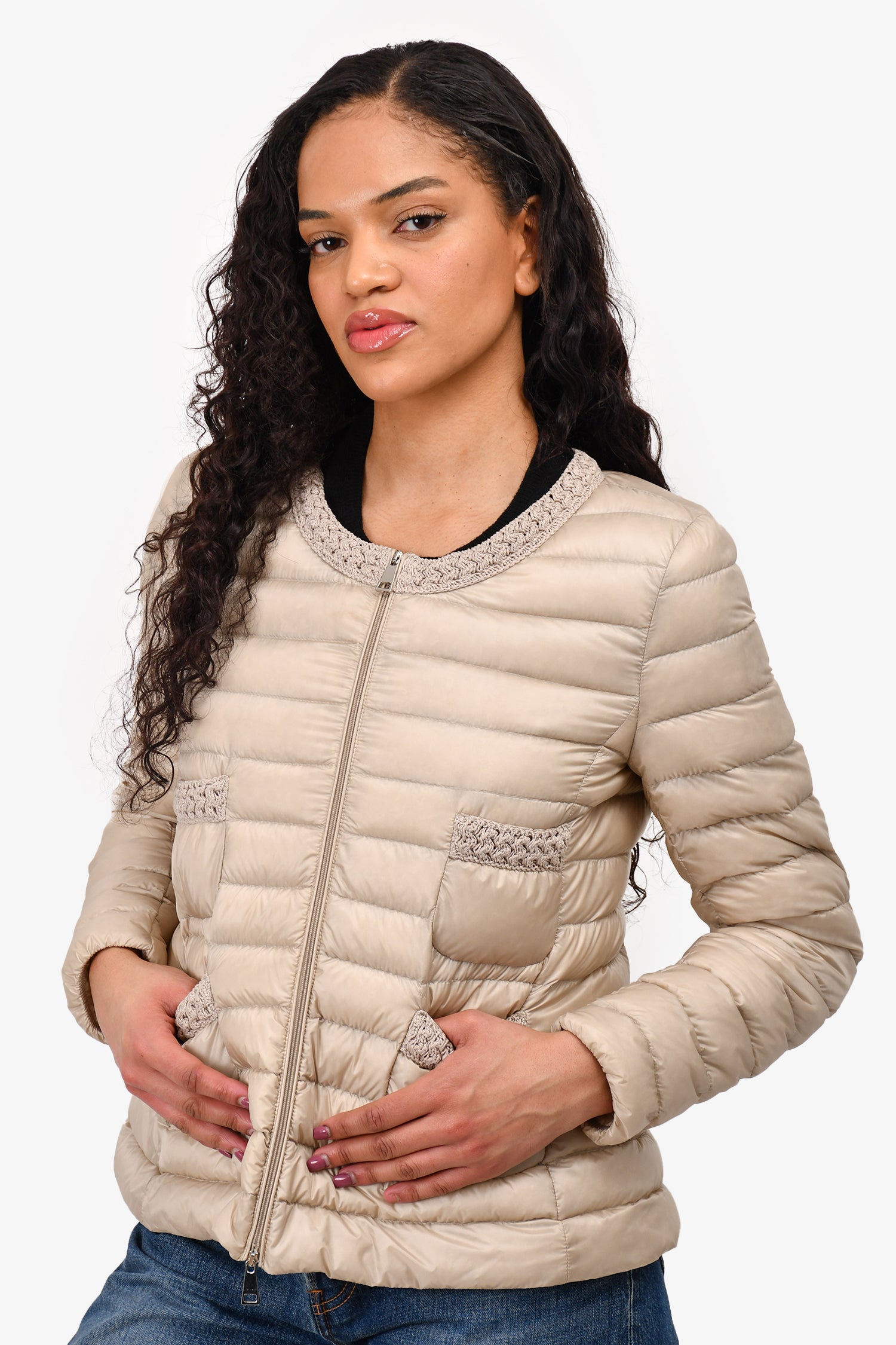 Refresh availabilityMoncler Cream Crochet Detail Jacket. Long sleeves. Front zip-up. Tonal stitching.