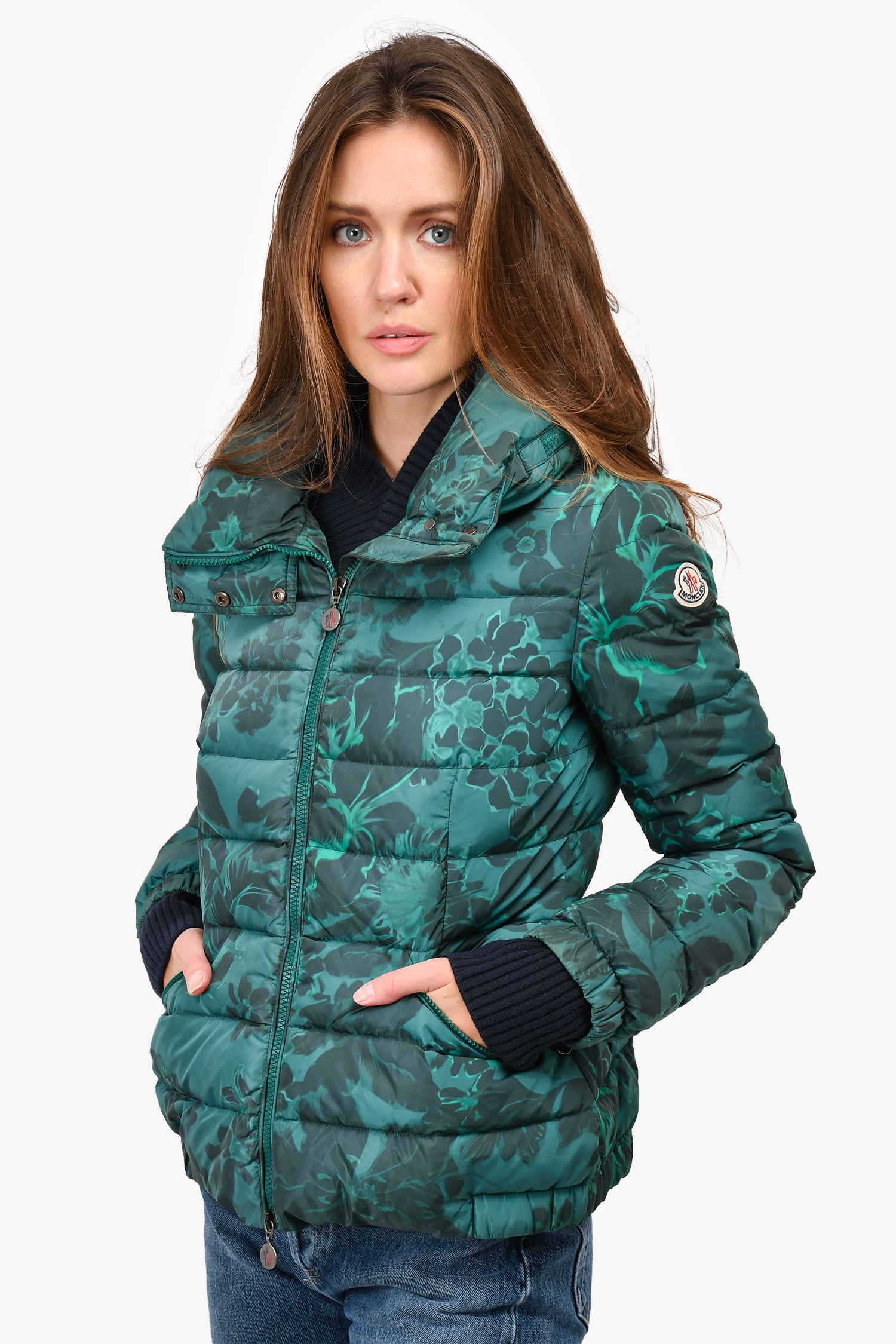 Refresh availabilityMoncler Green Floral Print Sanglier Giubotto Hooded Down Jacket. Tonal stitching. Down and feather filled. Front zipped closure. Stitched logo patch. Elasticated bottom.