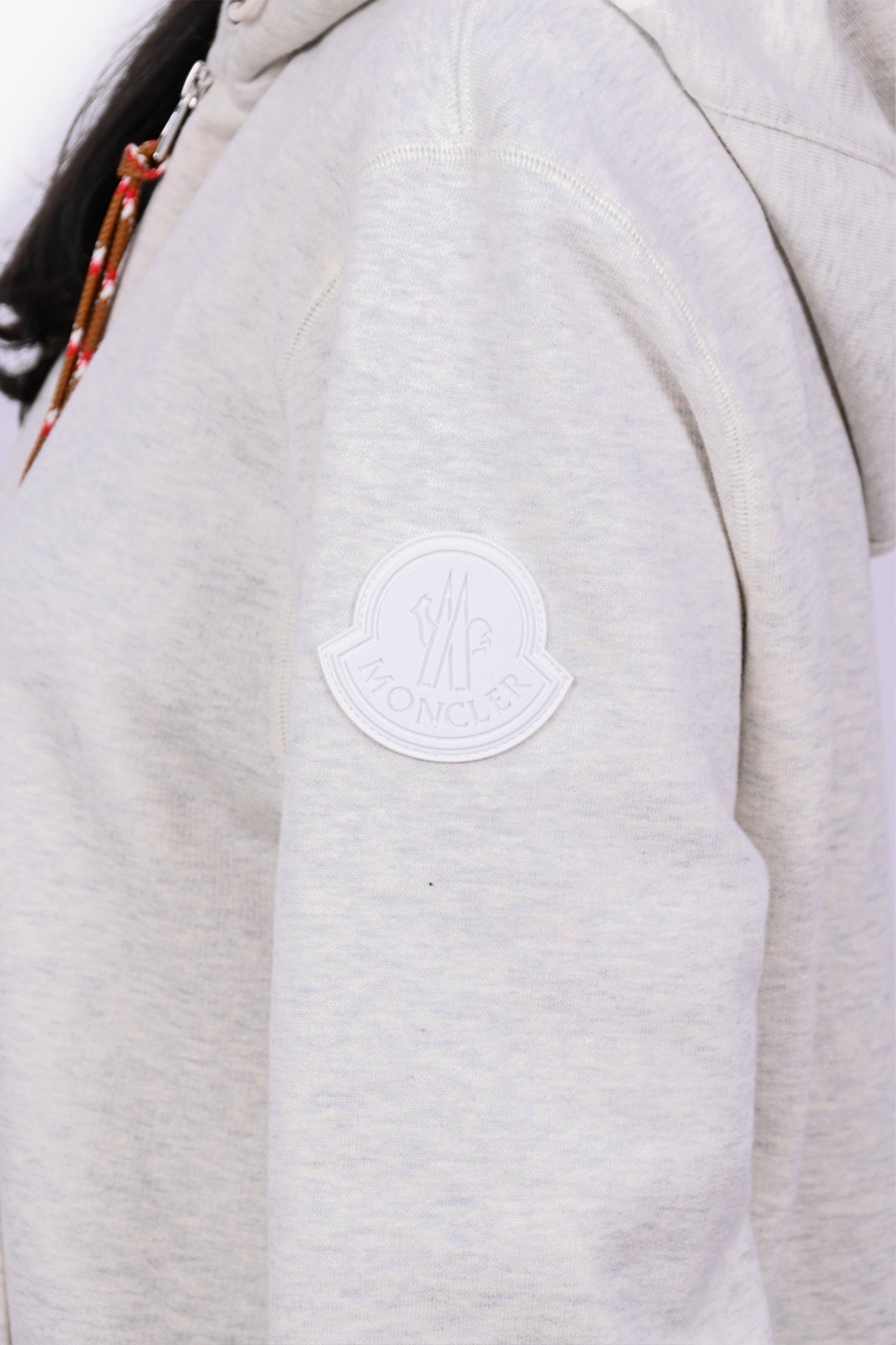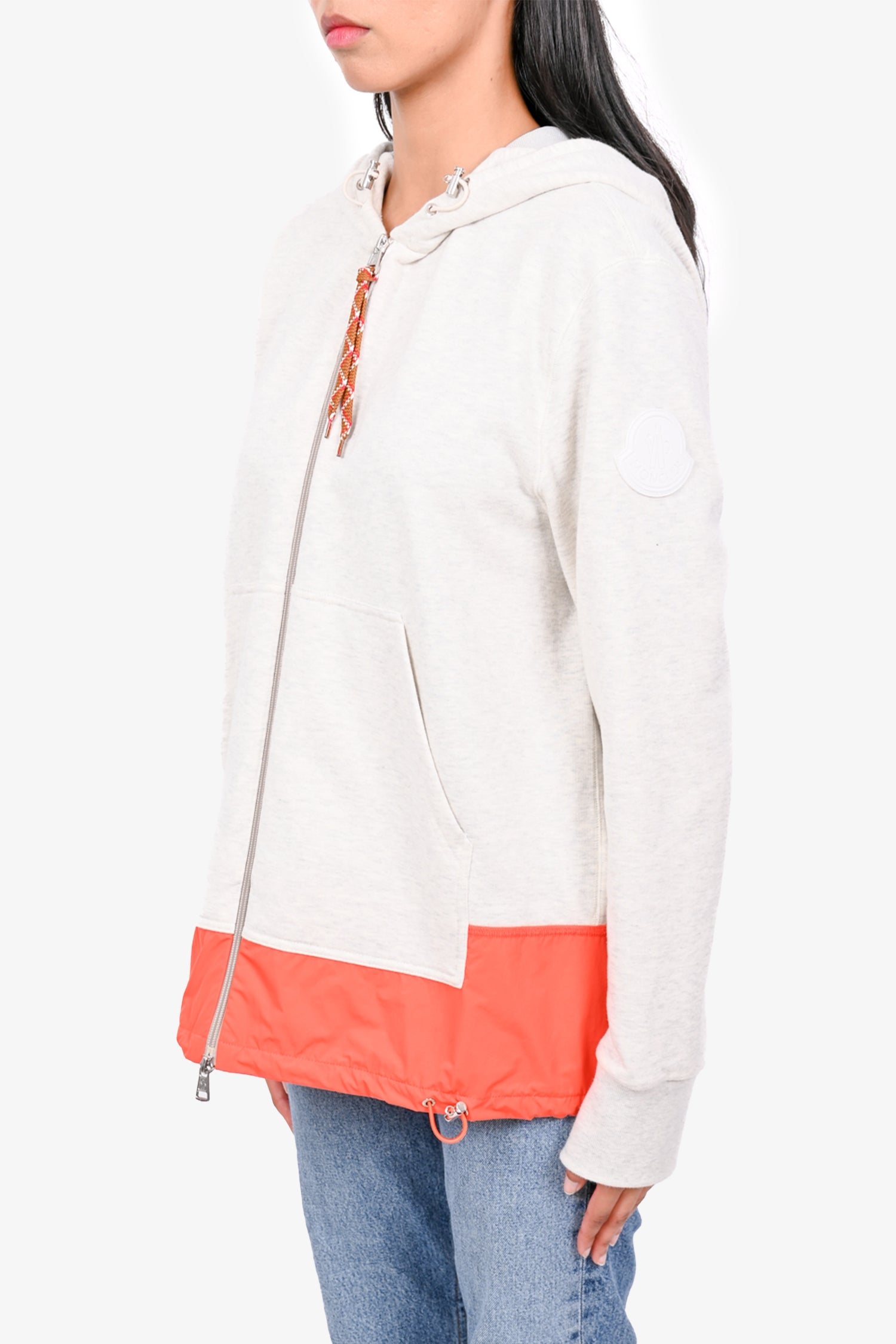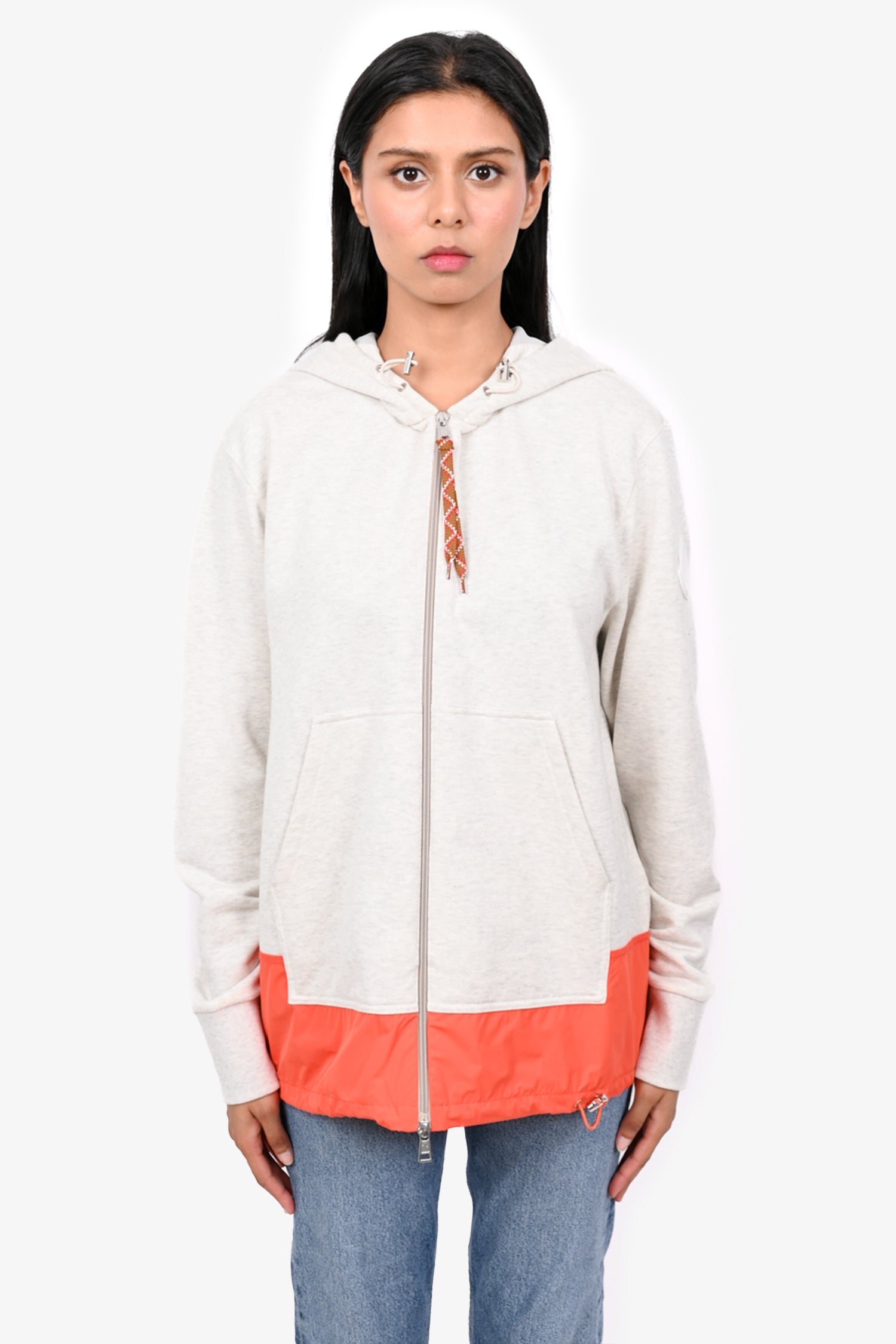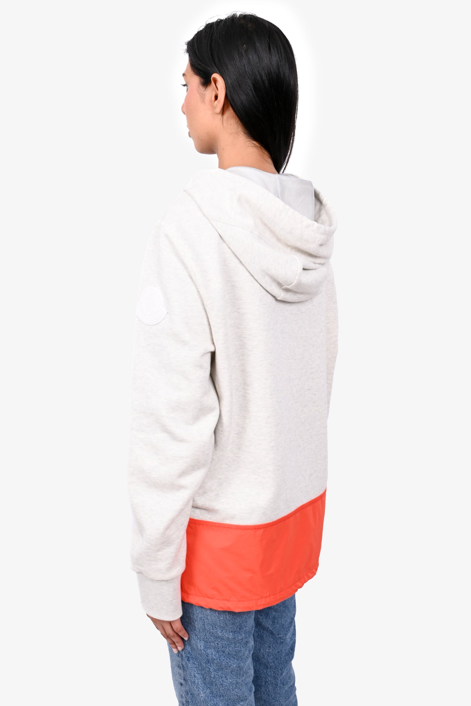 Refresh availabilityMoncler Grey Zip-Up Hoodie with Red Nylon Bottom. Front pockets. Tonal stitching.