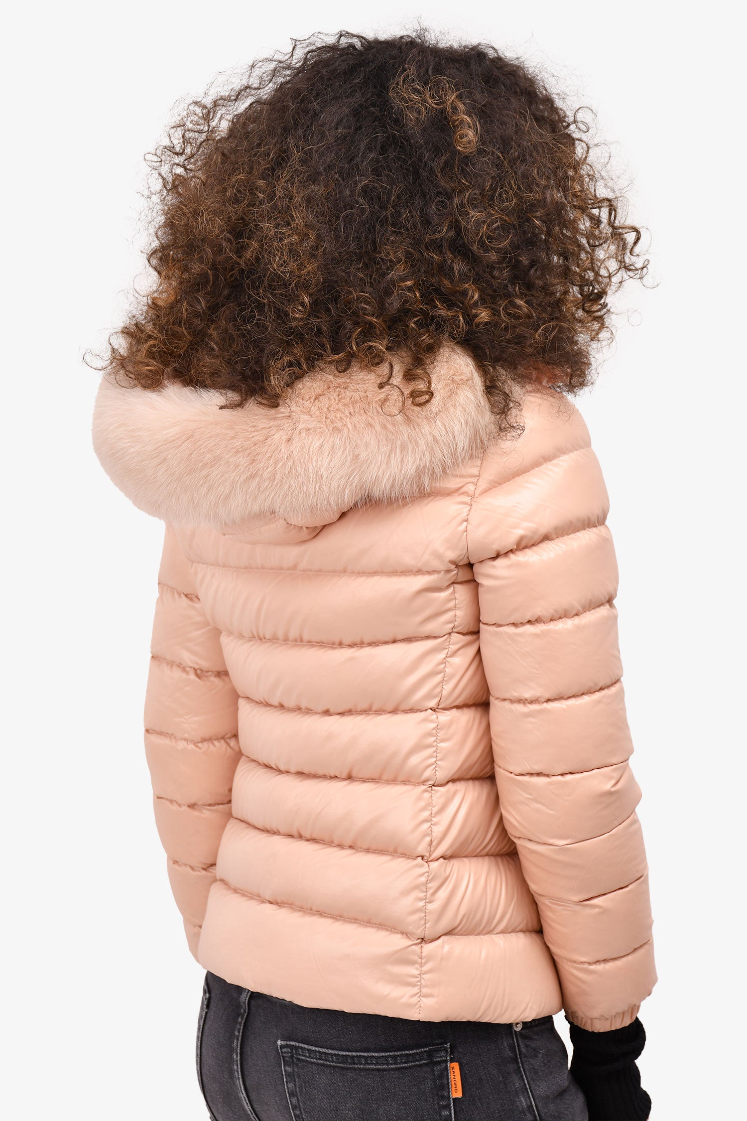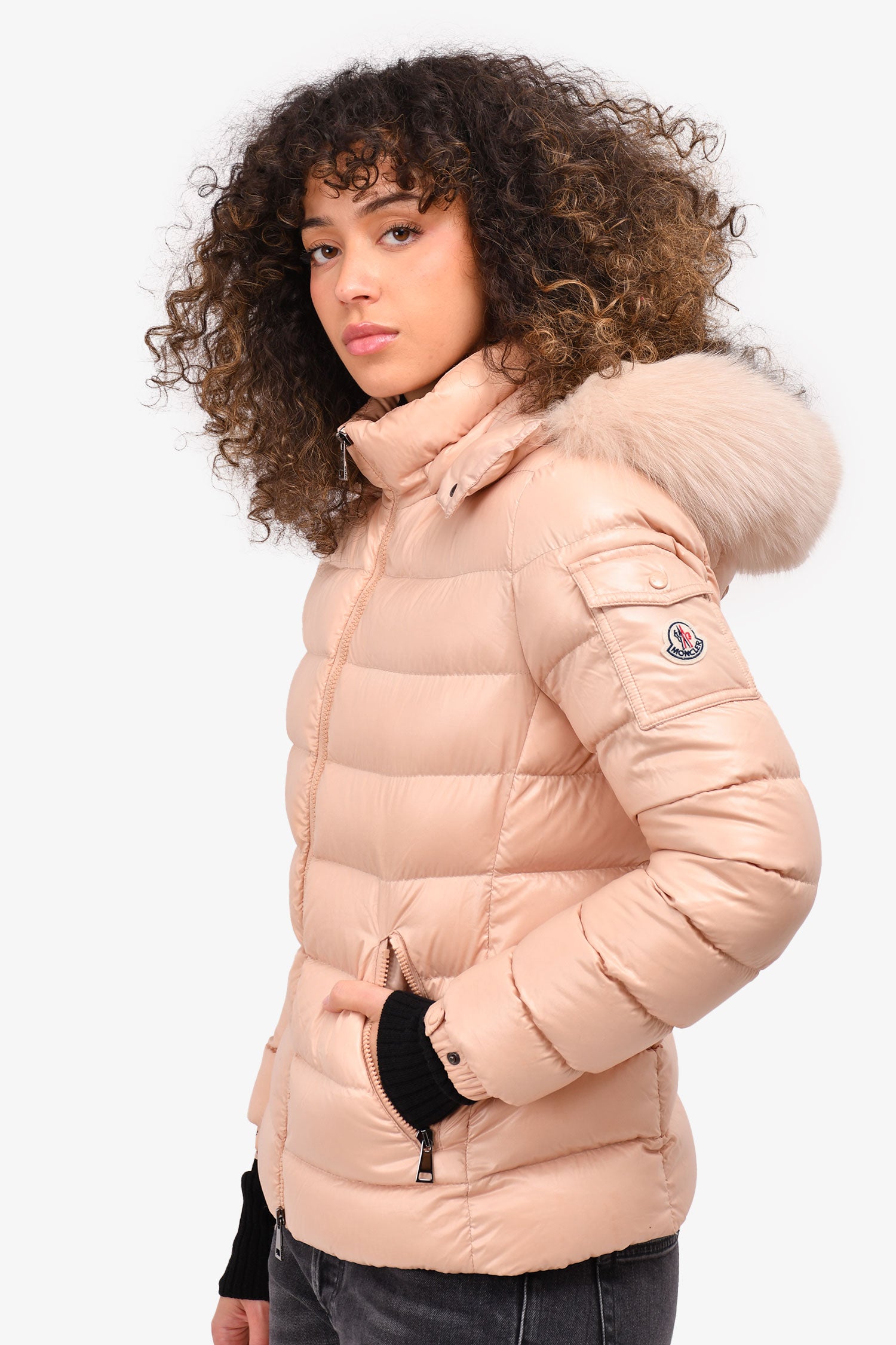 Refresh availabilityMoncler Light Pink Down 'Badyfur' Hooded Jacket with White Fur Trim. Zipped front. Side zipped pockets. Lined interior. Sleeves with snap closures.