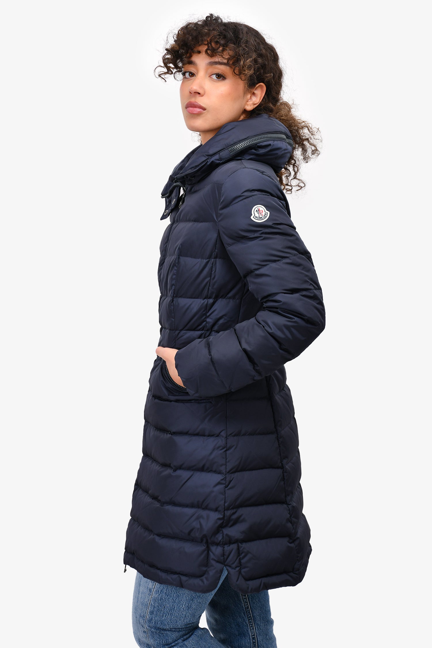 Refresh availabilityMoncler Navy Flammette Giubotto Down Puff Coat. Front two-way zip closure. Front zip pockets. Elasticized cuffs. Brand logo patch on the left sleeve.