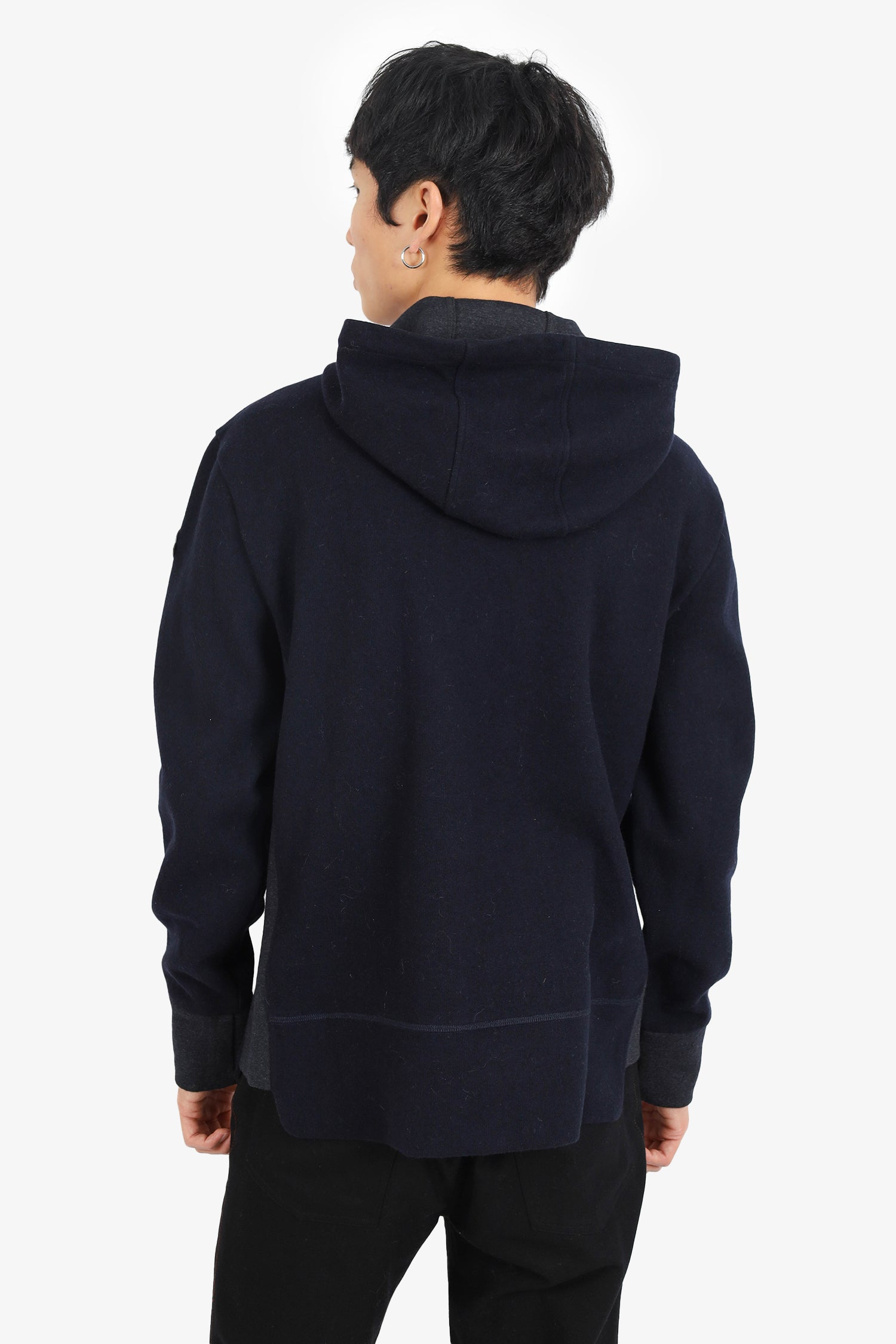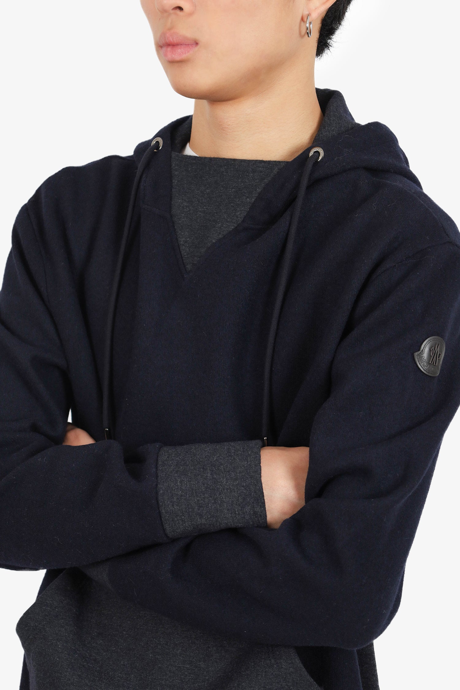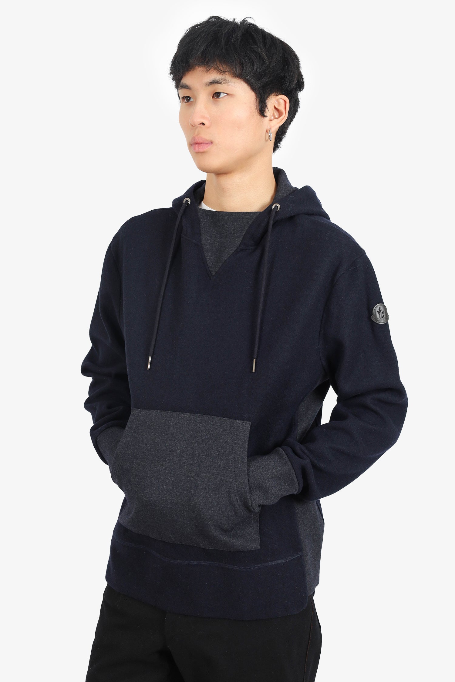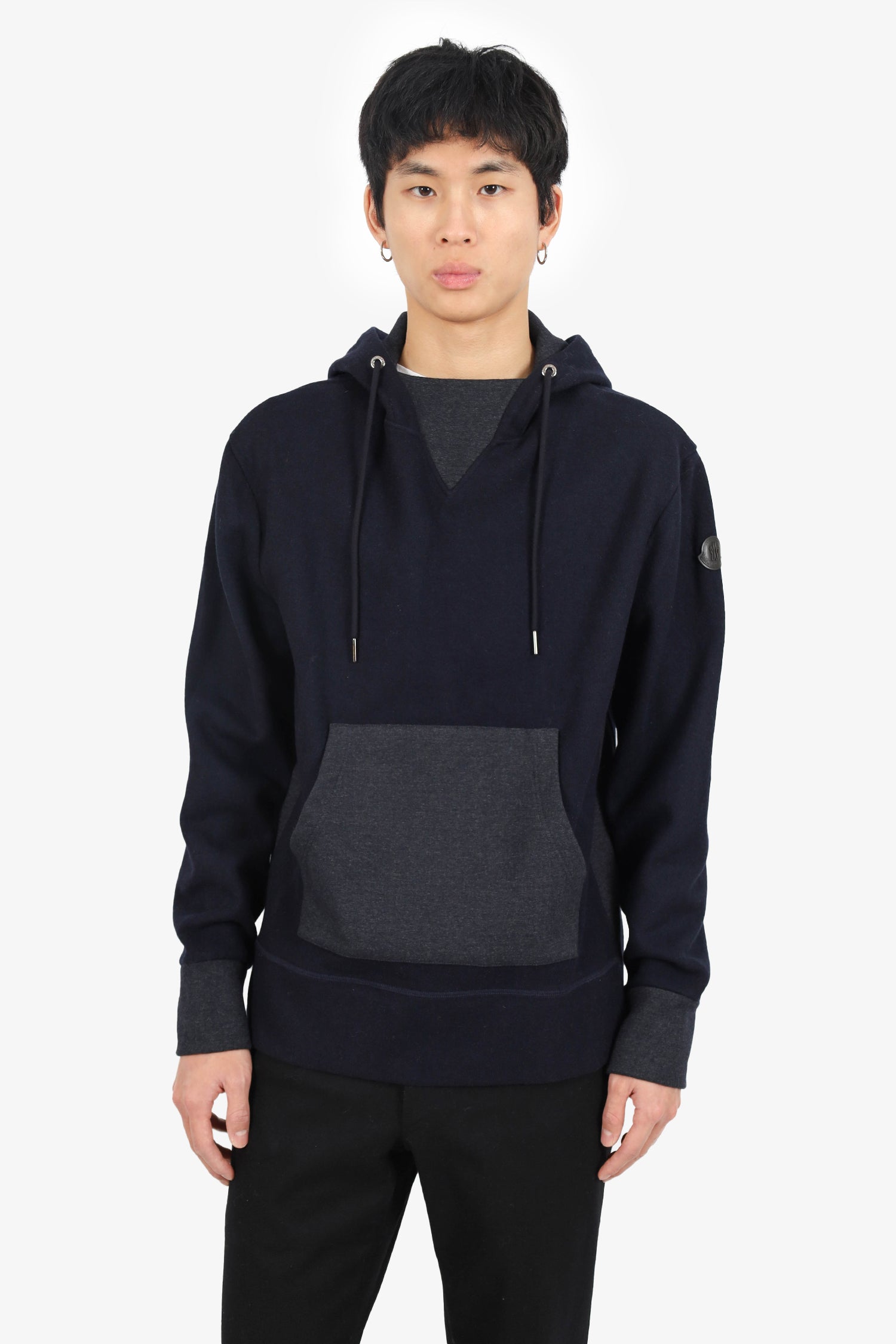 Refresh availabilityMoncler Navy/Grey Colorblock Wool Hoodie. Pull-on. Drawstring hood. Front slip pocket. Tonal stitching.