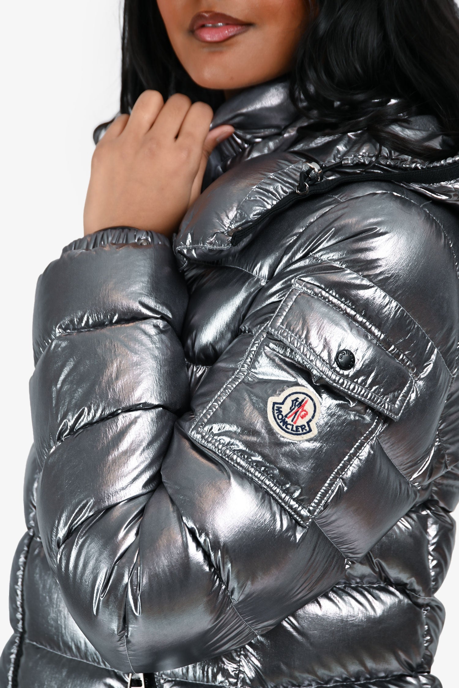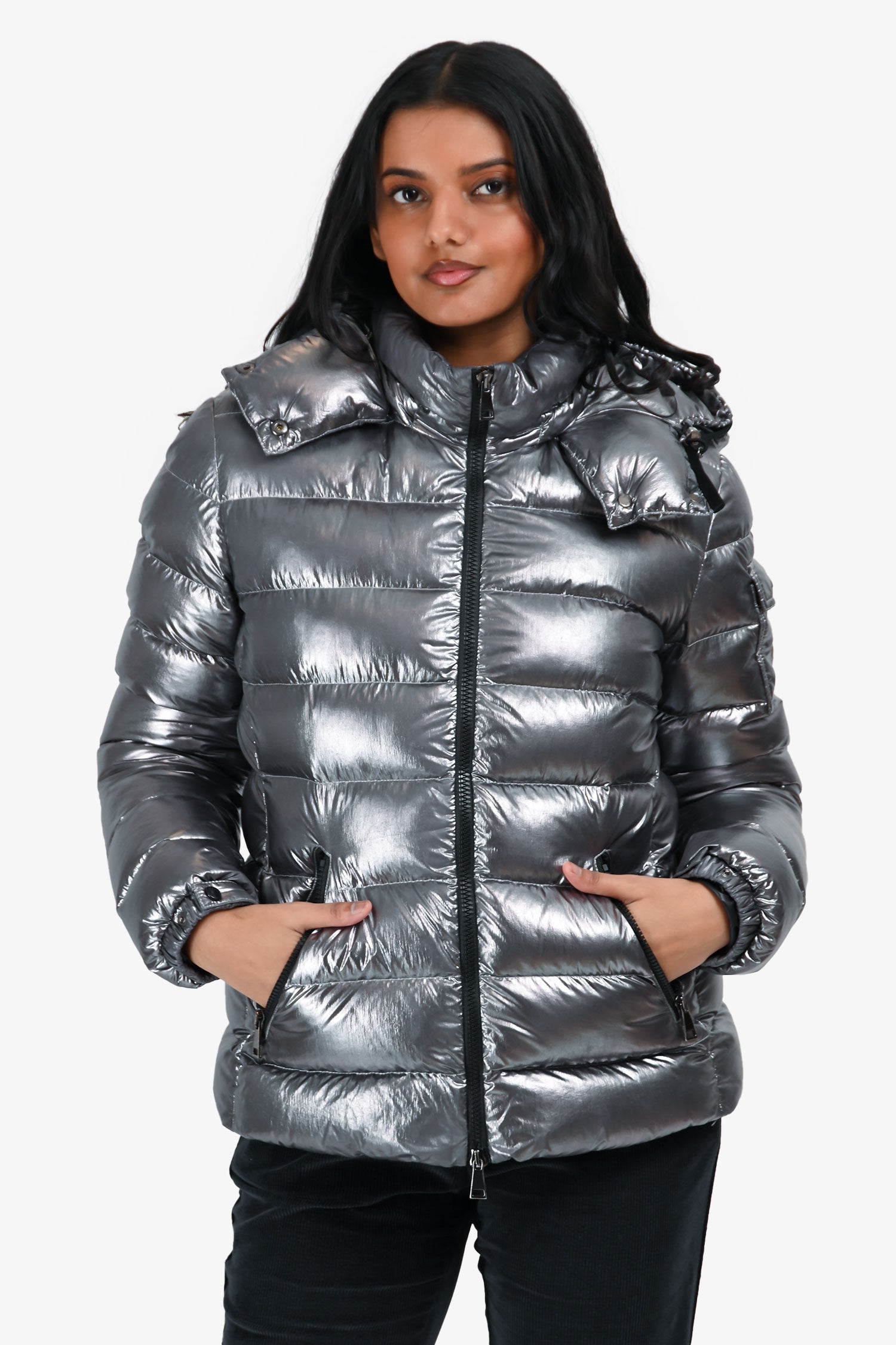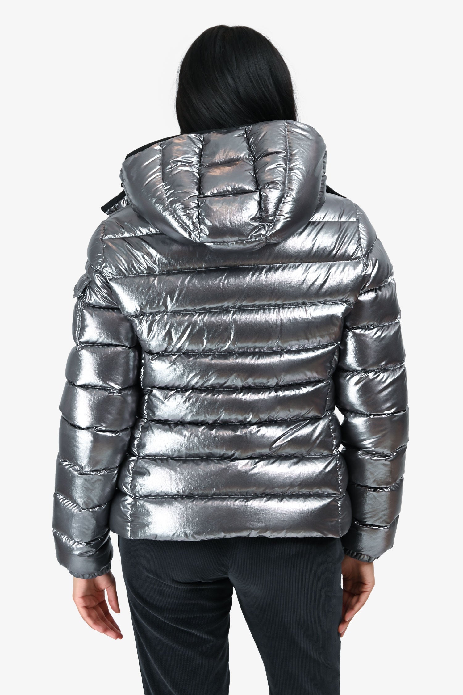 Refresh availabilityMoncler Silver Down 'Bady Guibatto'. Pull on. Front 2-way zipper closure. 2 front pockets with zipper closure. Detachable drawstring hood with snap button closure. Button up sleeves. Gunmetal-tone hardware. Tonal stitching.