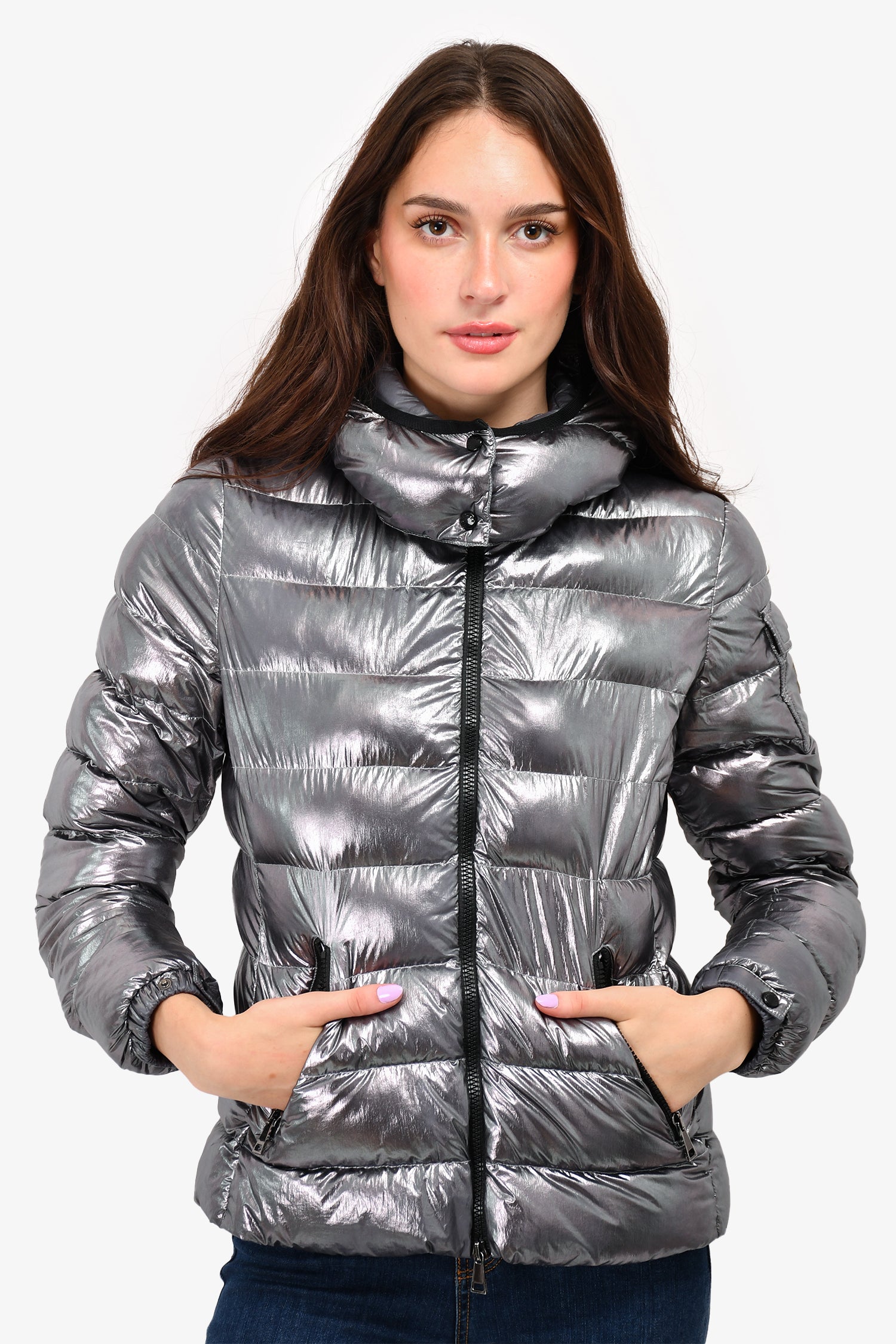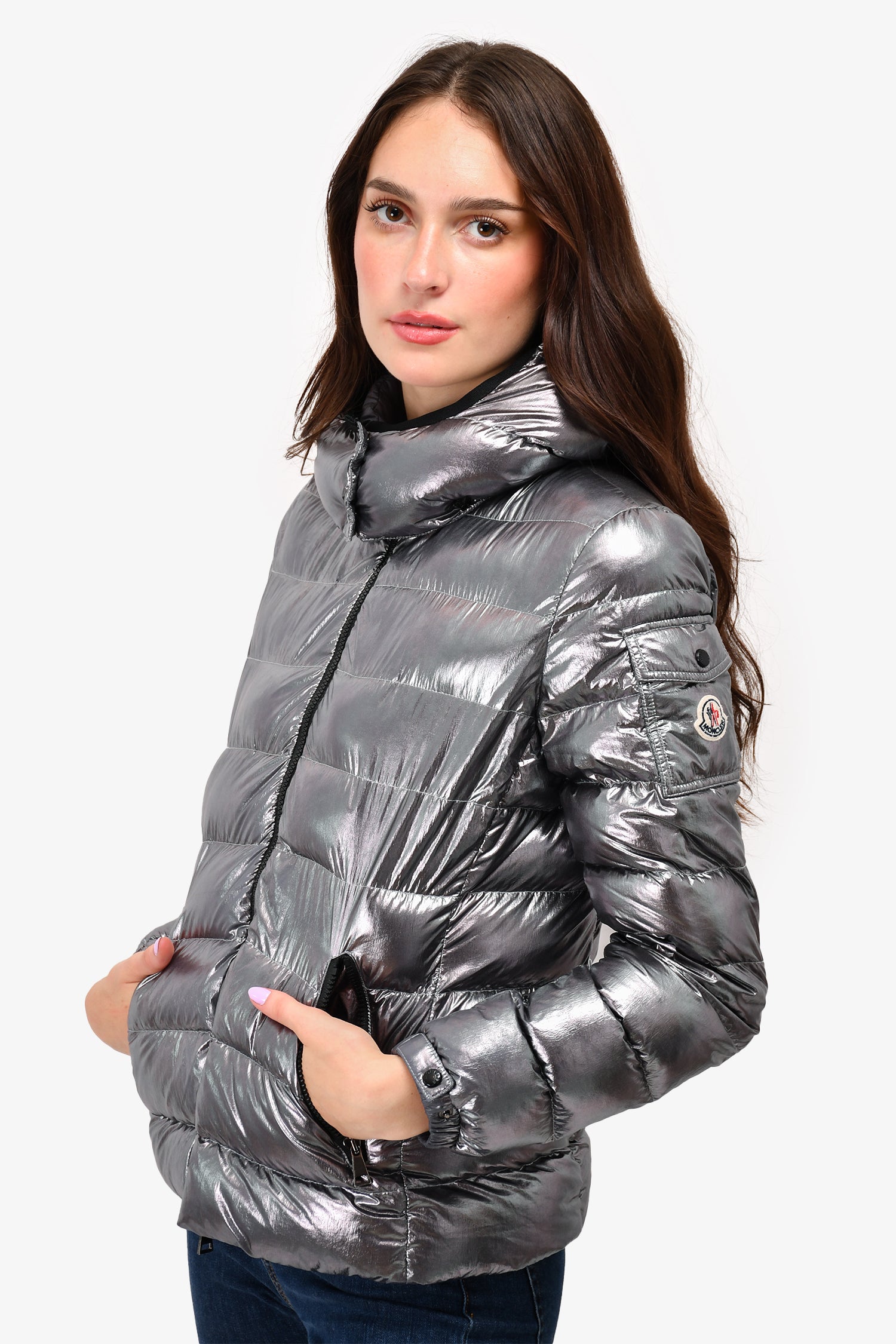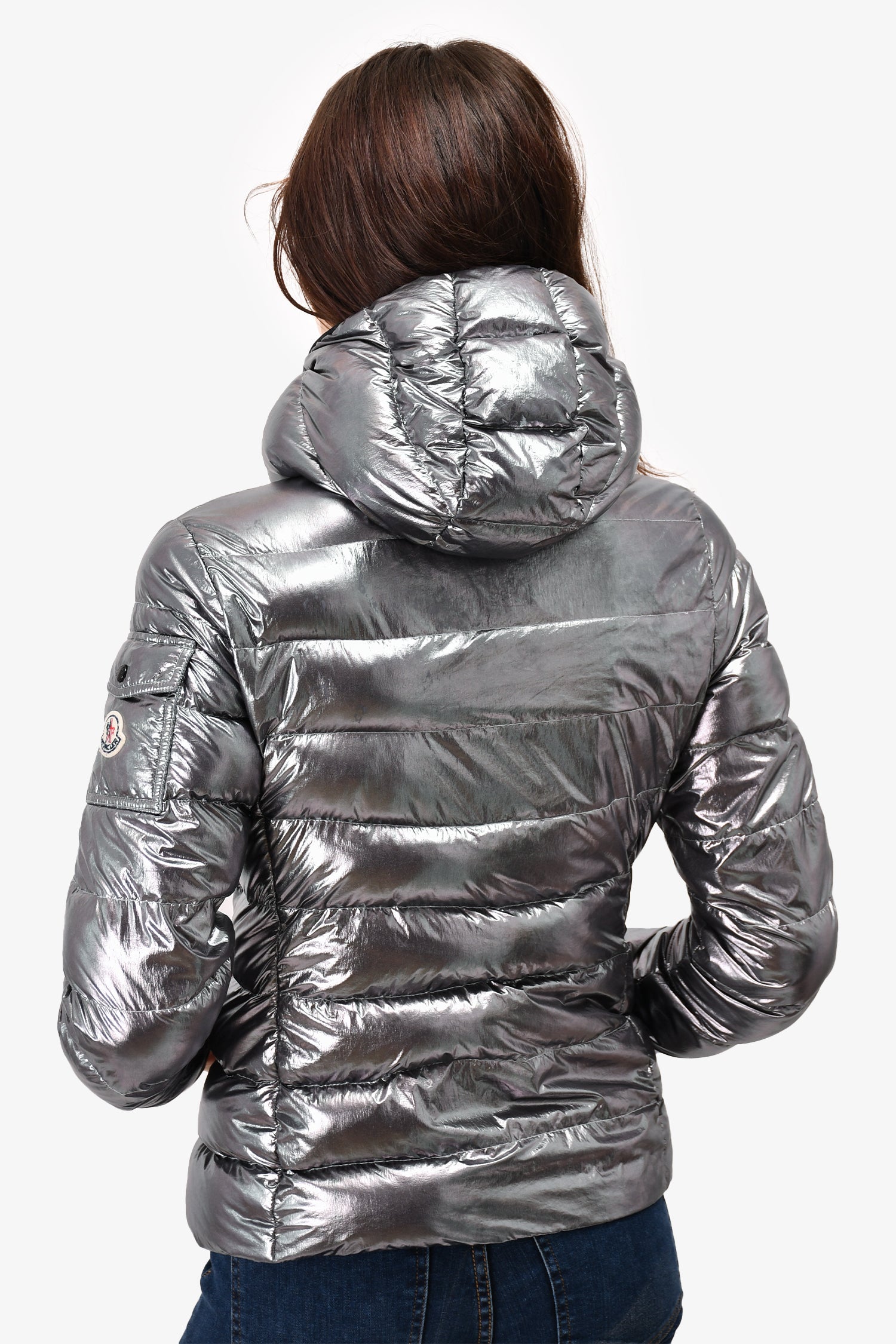 Refresh availabilityMoncler Silver Down Puff Jacket. Tonal and contrast stitching. Metallic-like finish. Down-filled. Nylon exterior. Front zipped closure. 2 zipped pockets. Adjustable pull tab on hood.