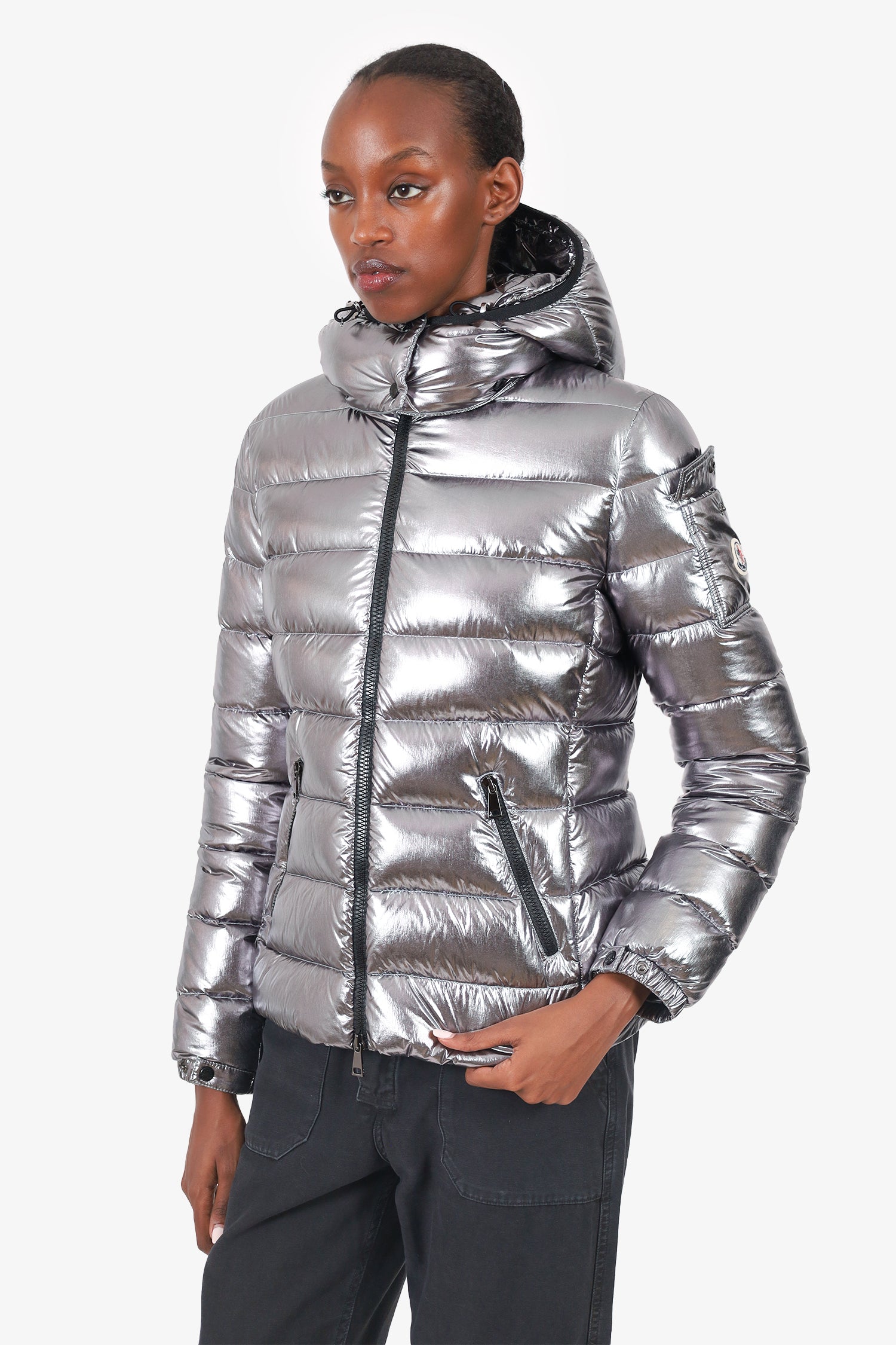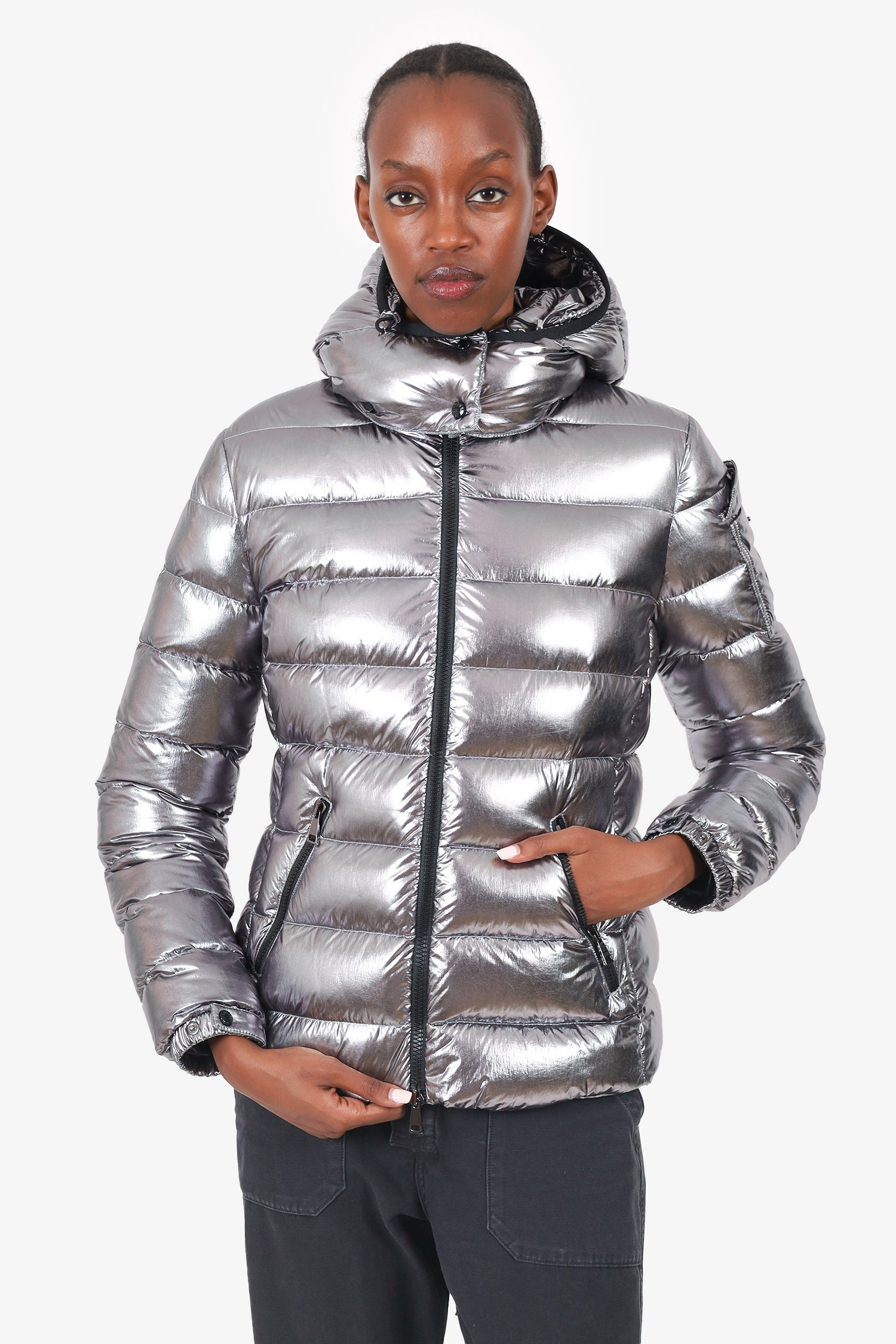Refresh availabilityMoncler Silver Down Puffer Jacket With Hood. Pull-on. High-neckline. Front 2-way zip closure. Sleeve cuffs with snap-button closure. 2 front exterior zip pockets. Lined interior. Gunmetal-tone hardware. Tonal stitching.
