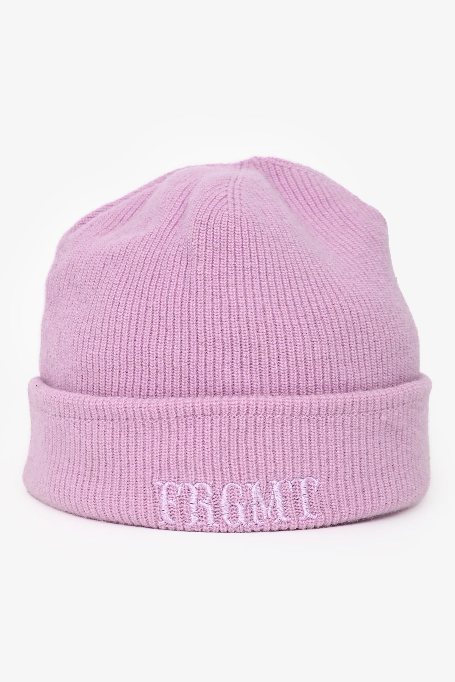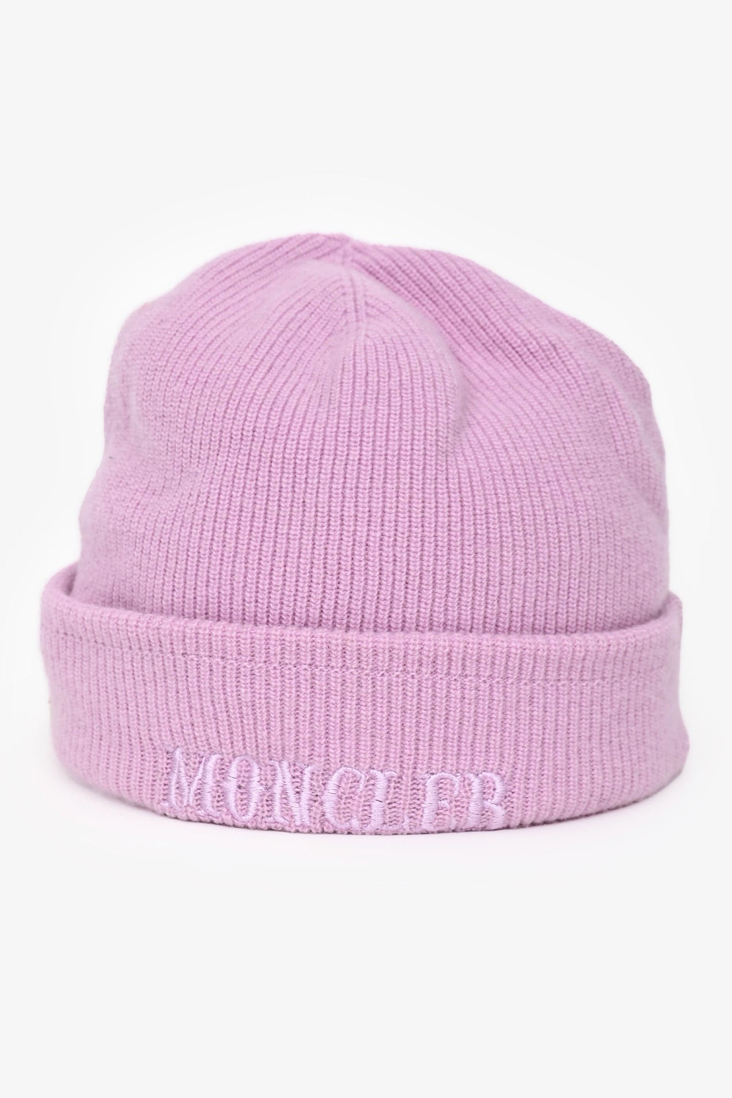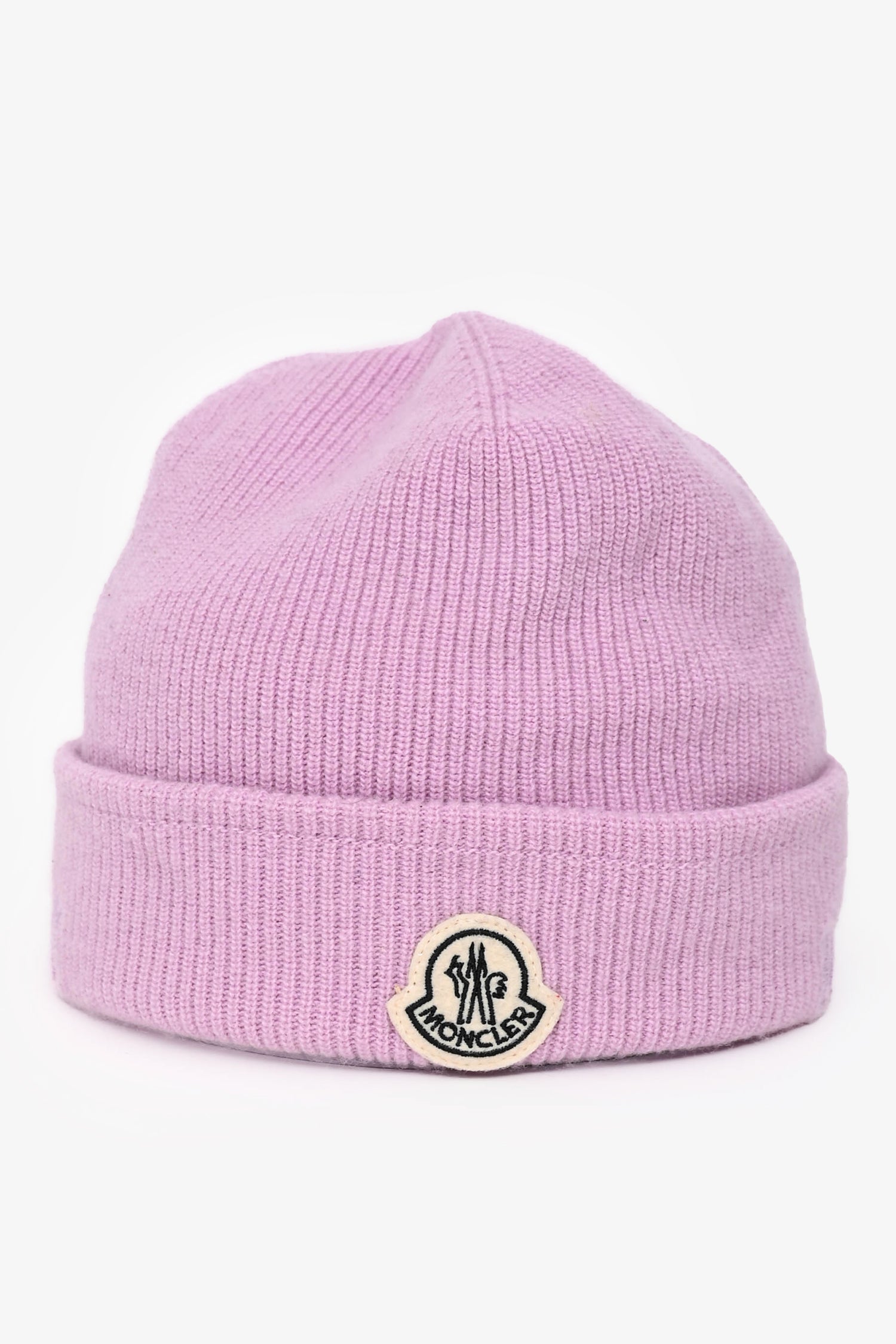 Refresh availabilityMoncler x Fragment Purple Wool Beanie. Ribbed knit design. Fold-over cuff with logo patch. Tonal stitching.