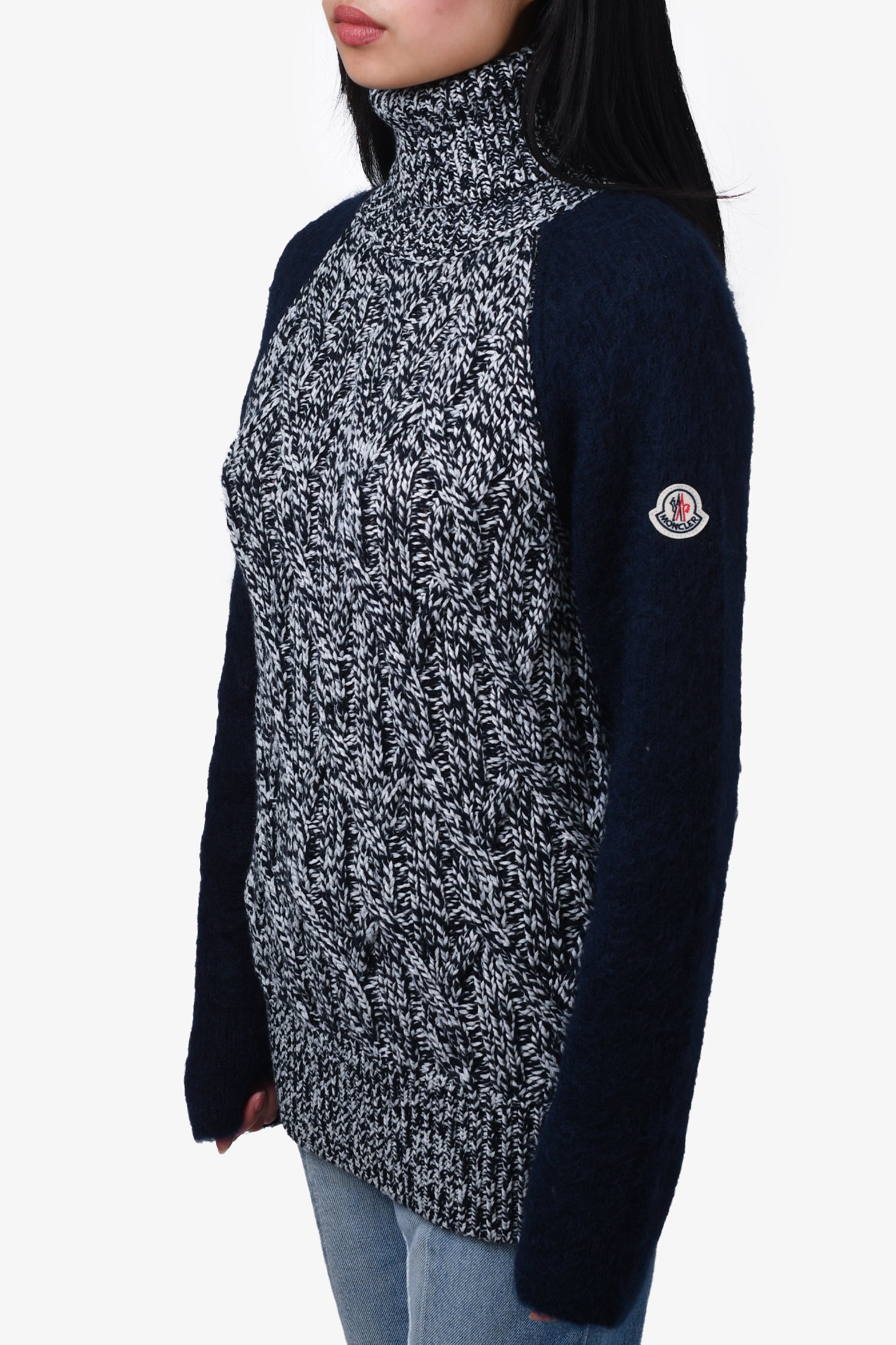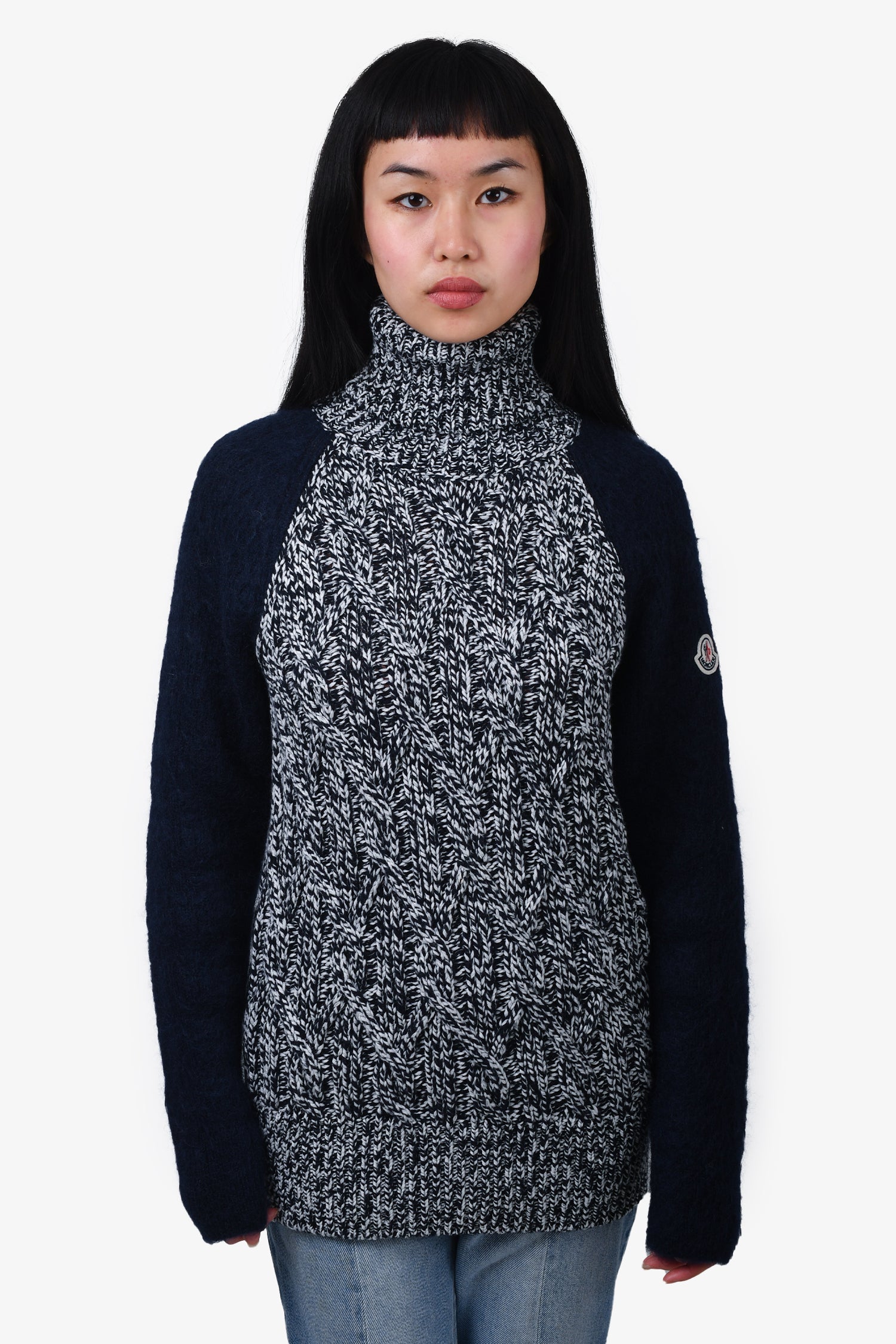 Refresh availabilityMoncler Navy Wool/Mohair Turtle Neck 'Ciclista Tricot' Sweater. Pull-on. Brand logo patch on the left sleeve. Tonal stitching.