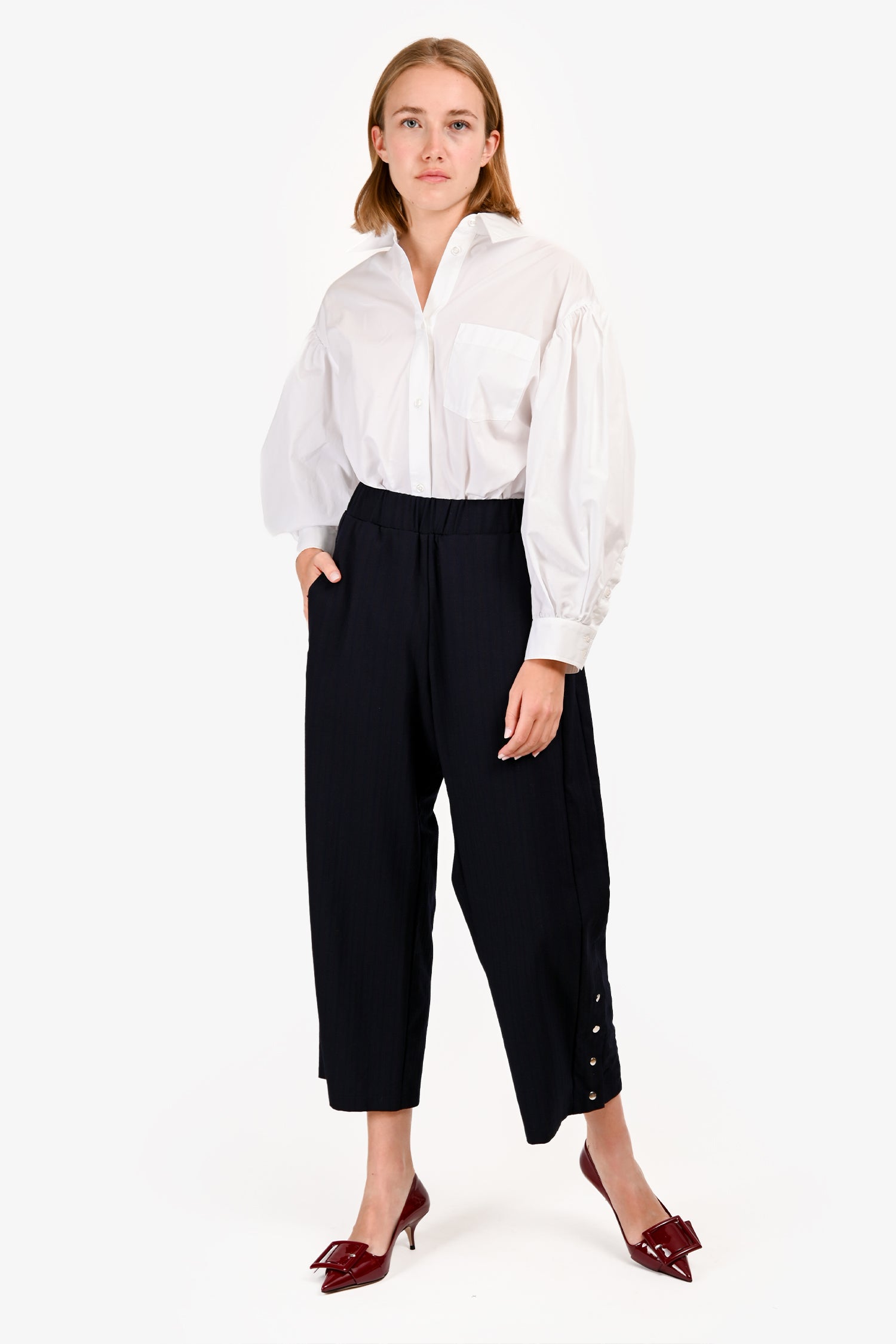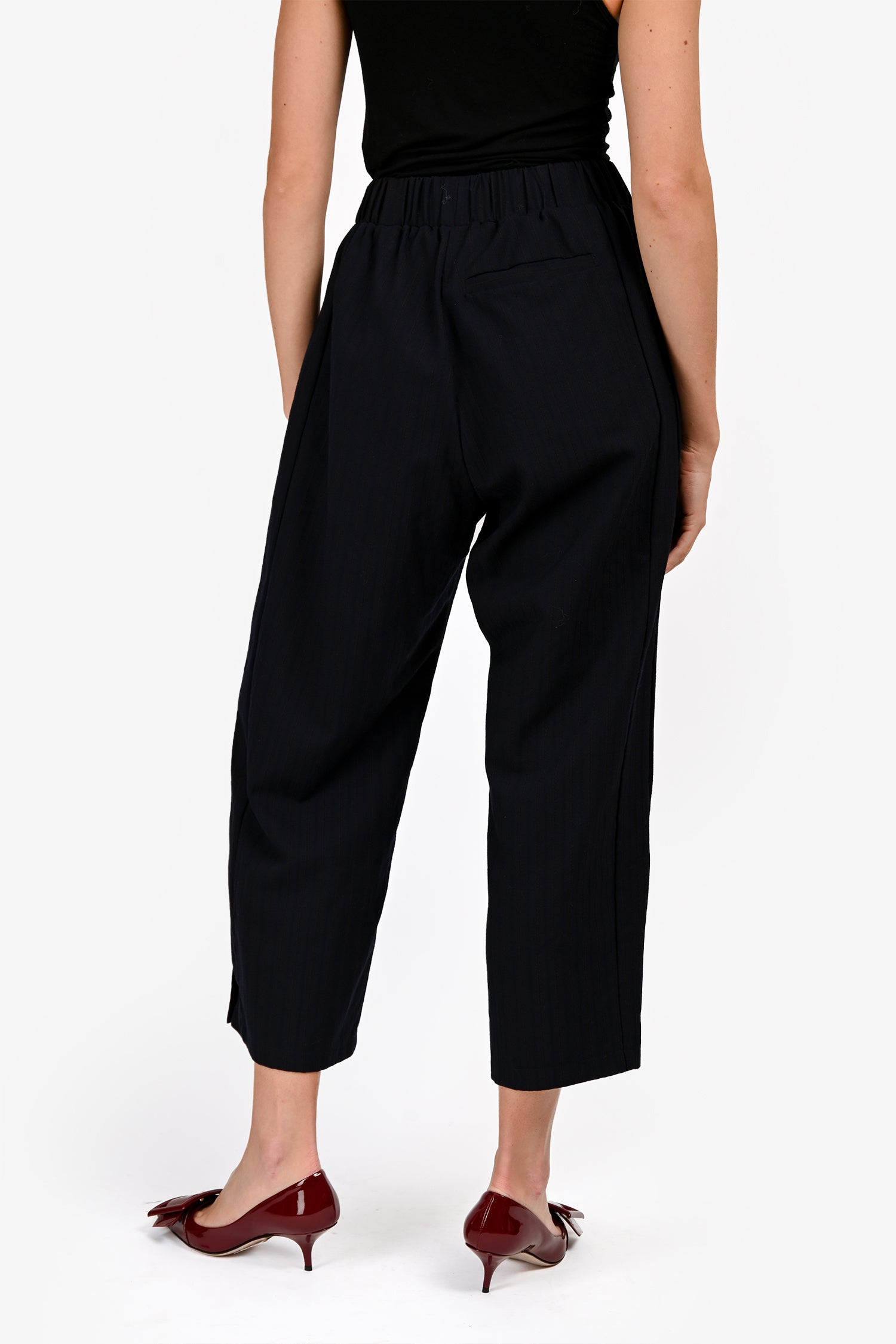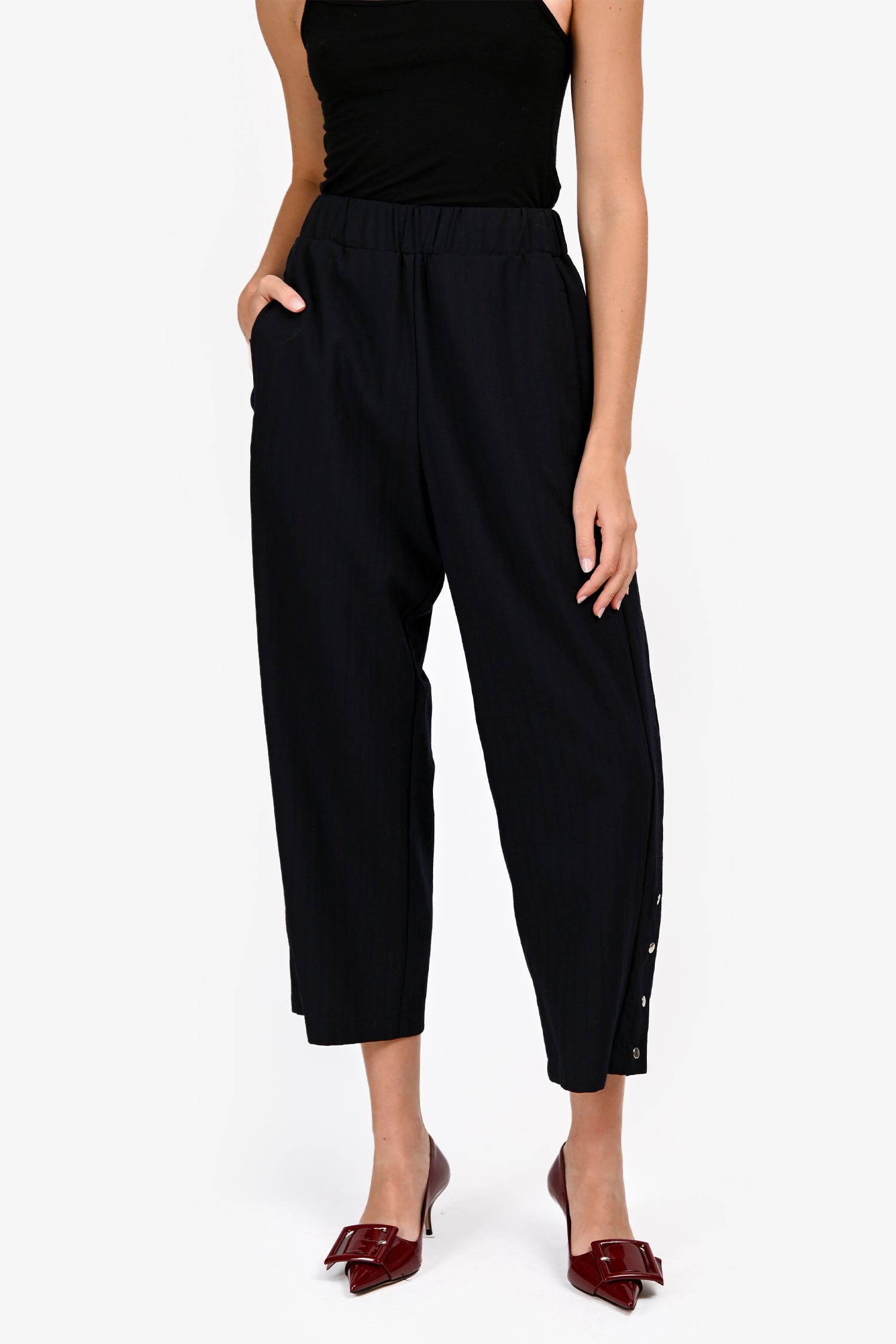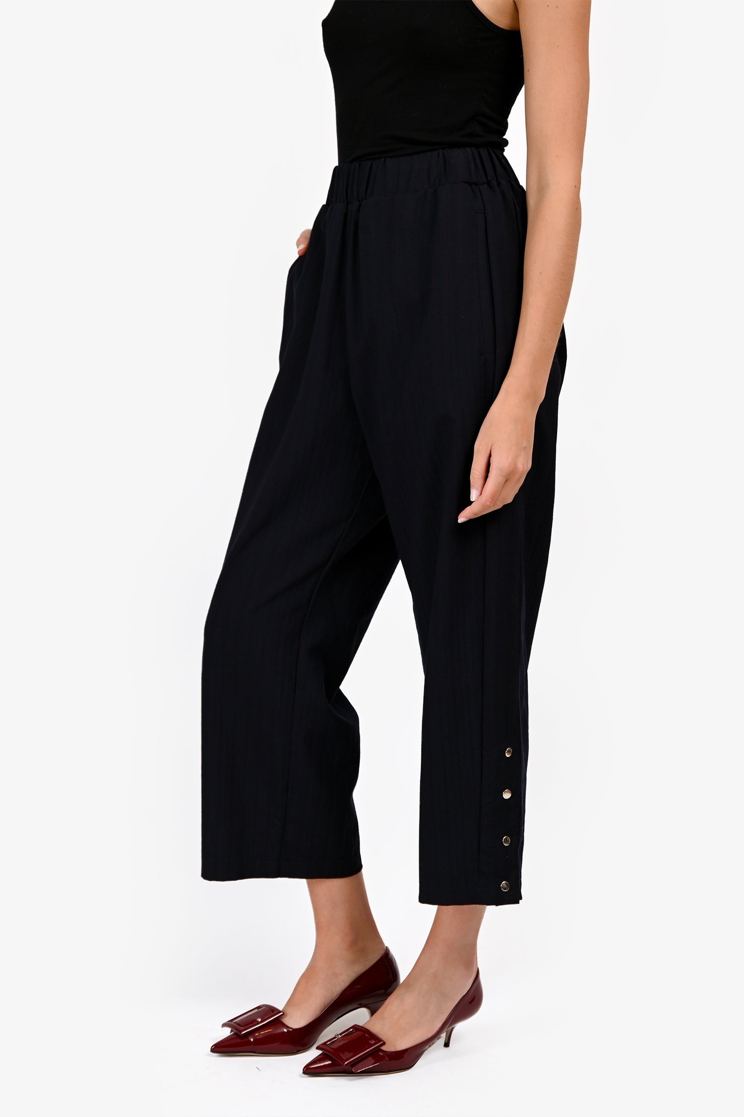 Refresh availabilityMonpell Navy/Red Pinstripe Wide Leg Trousers. Pull-on. Elastic waistband. Right side rear pocket. 2 front side seam pockets. Tonal stitching. Silver-tone hardware.