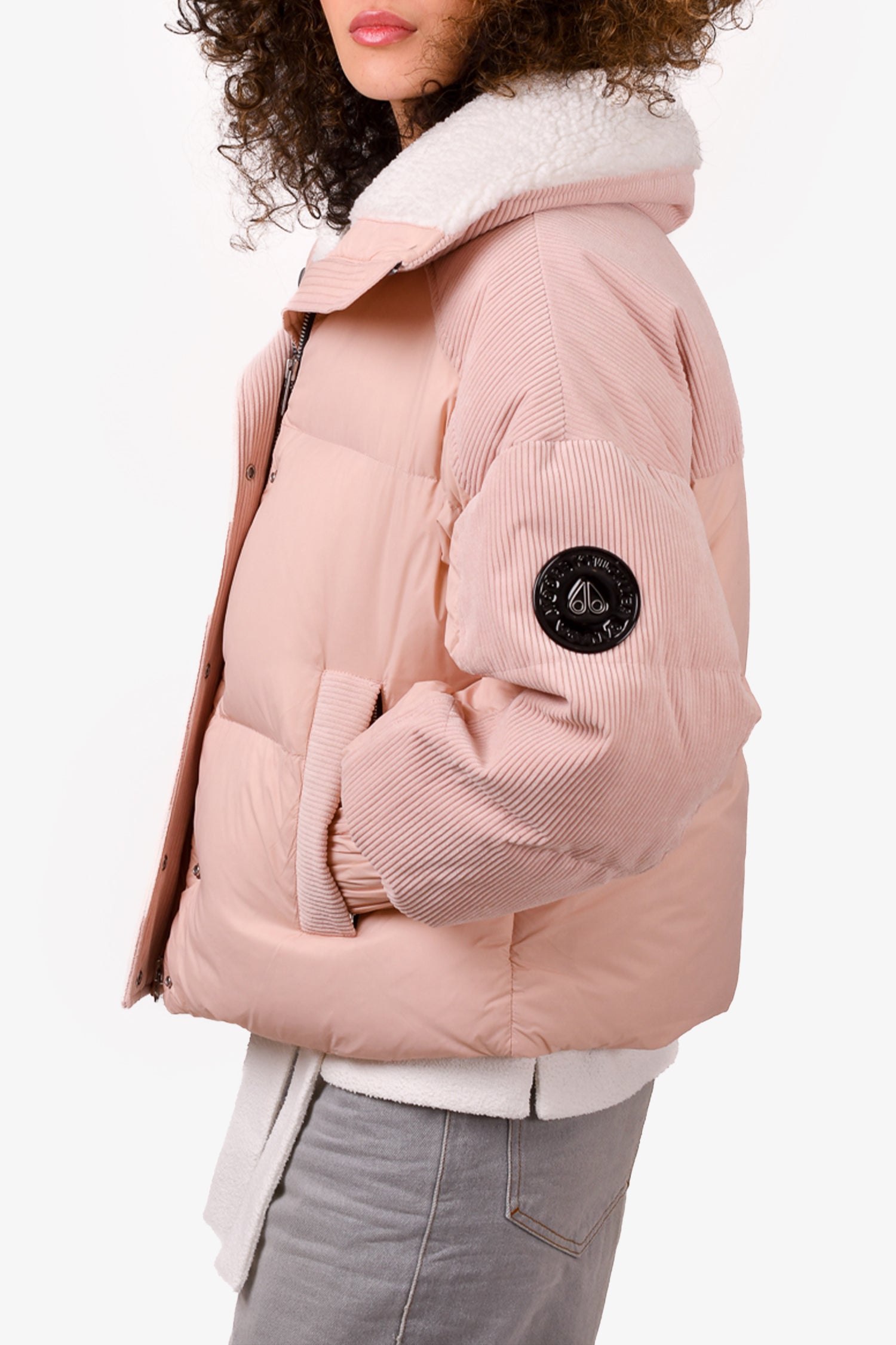 Refresh availabilityMoose Knuckles Pink Down Fleece Lined Puffer Jacket. Front two-way zip closure. Front and interior zip pockets. Ribbed elasticized cuffs.