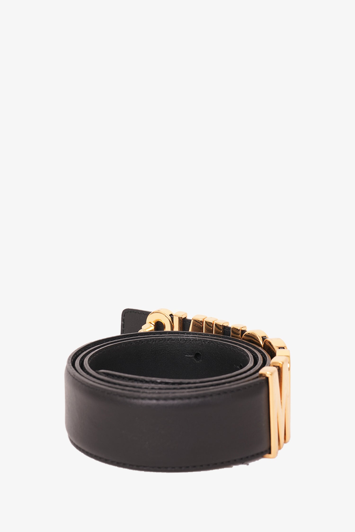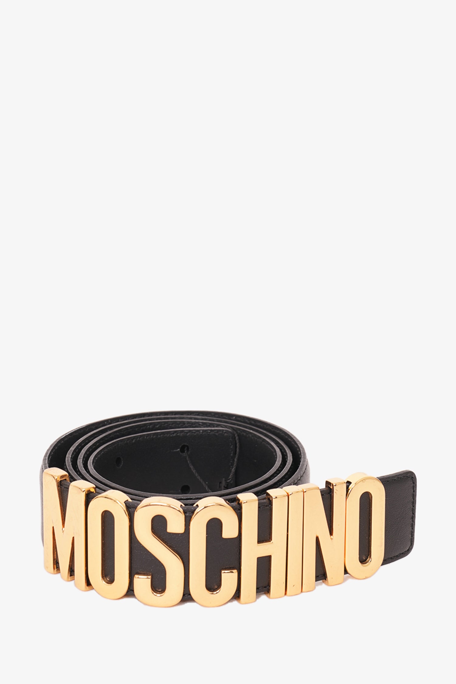 Refresh availabilityMoschino Black Leather Gold Logo Belt. Push-tab buckle closure. Gold-tone hardware.