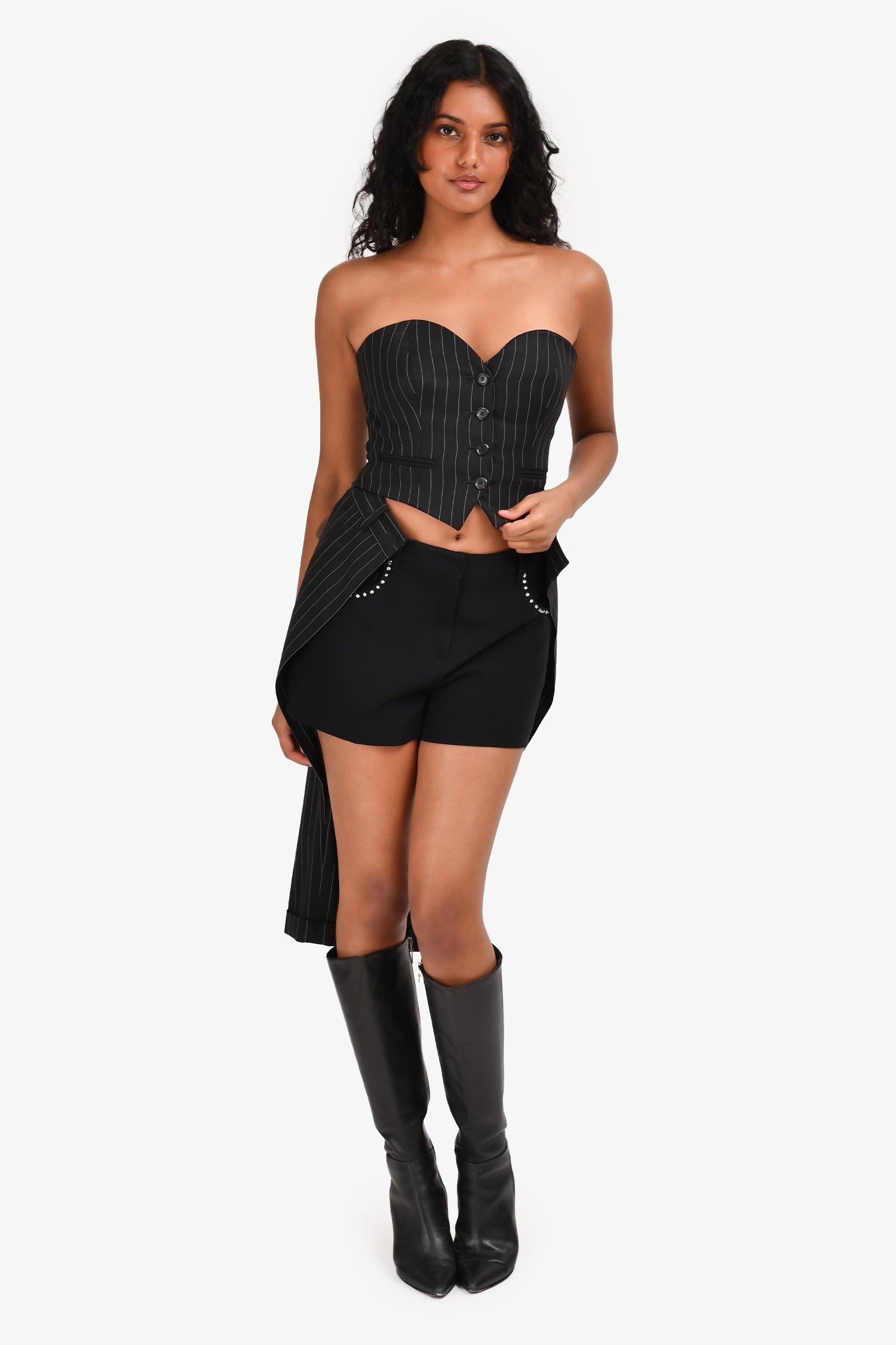 Refresh availabilityMoschino Black Pinstripe Buttoned Corset Fake Pants Top. Strapless neckline. Corset-style bodice with front button detailing. Fitted silhouette. Fully lined. Tonal stitching.