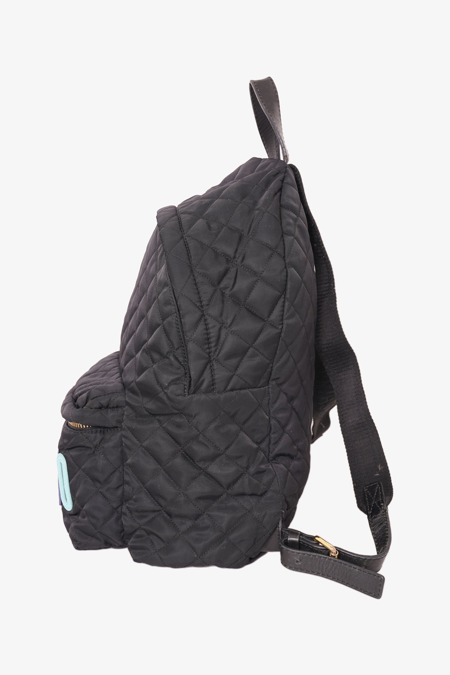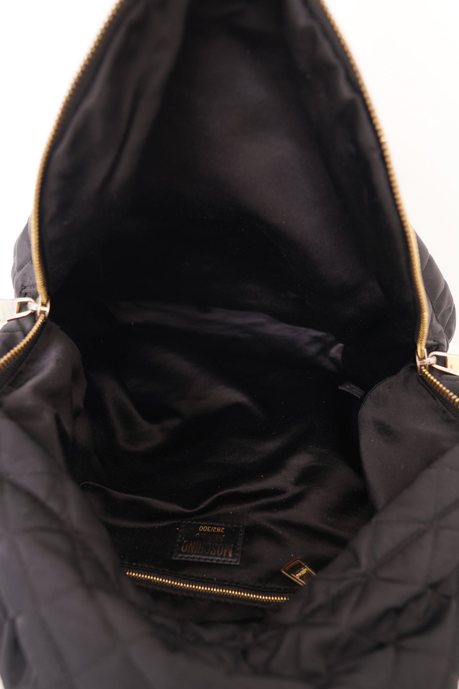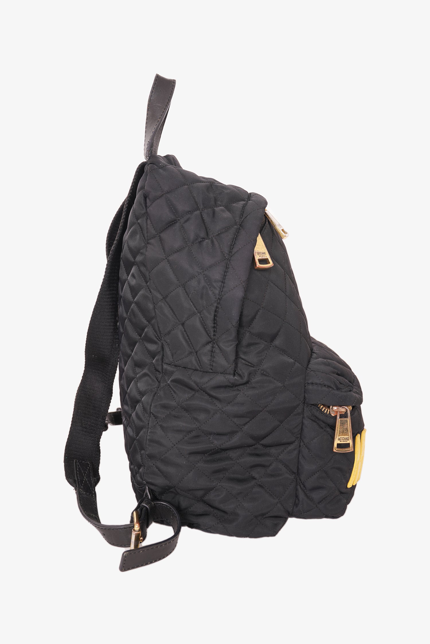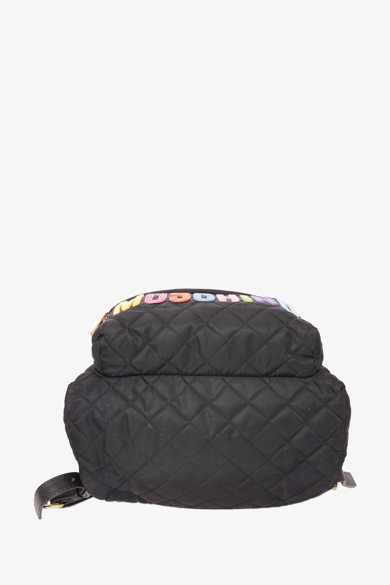 Refresh availabilityMoschino Black Quilted Nylon Backpack. Top zip closure. 1 interior zip pocket. Front pocket with zip closure. Adjustable straps. Gold-toned hardware. Tonal stitching.