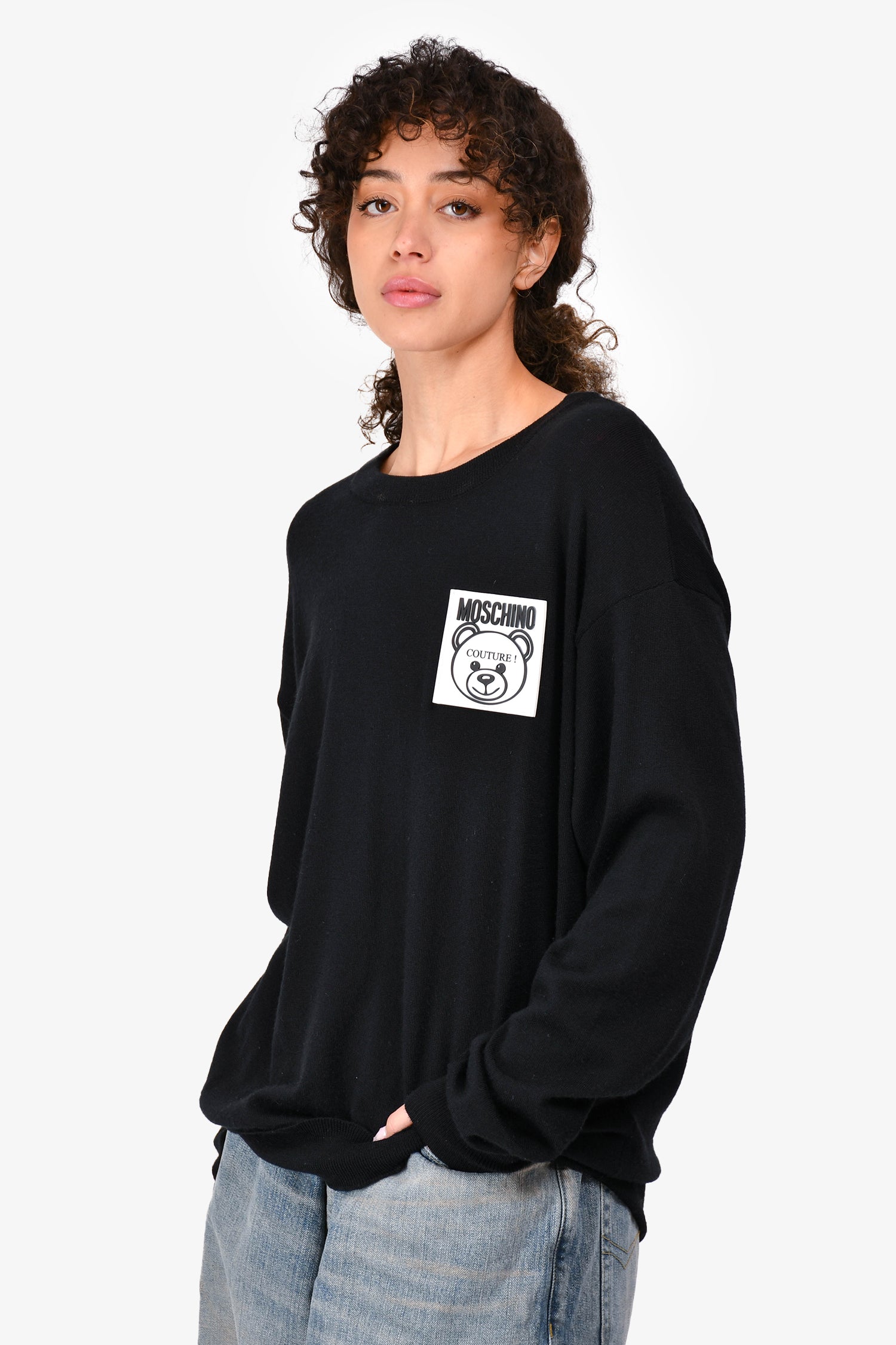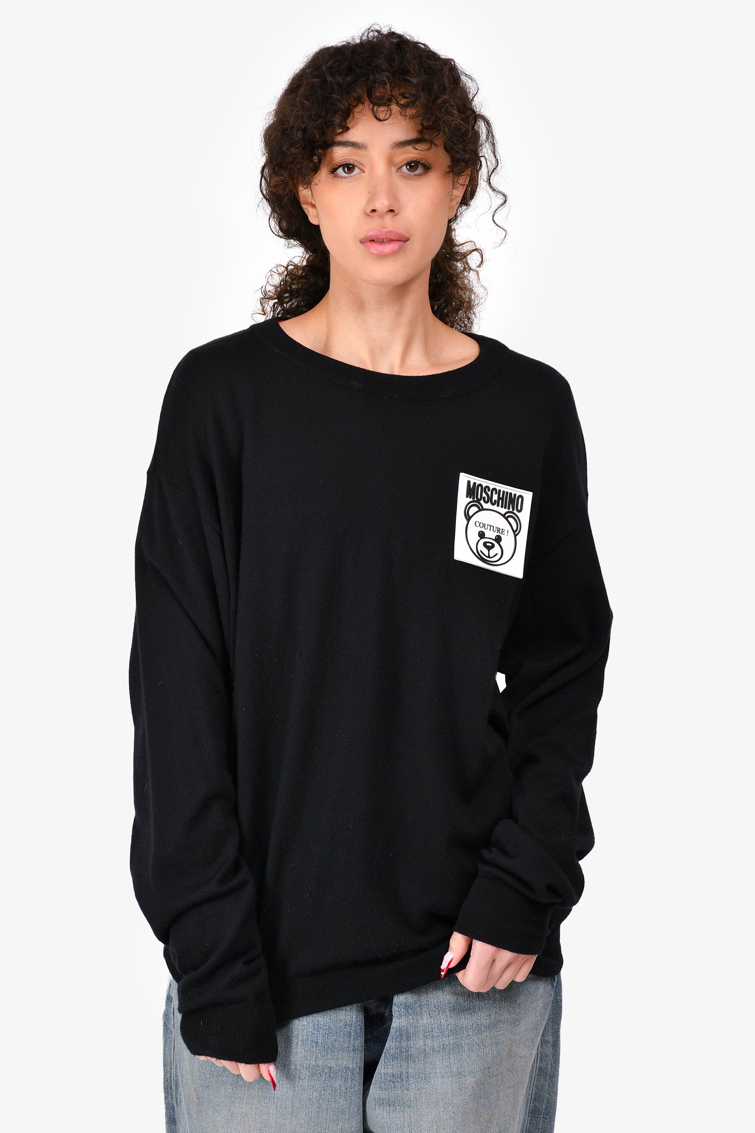 Refresh availabilityMoschino Black Wool White Logo Patch Crewneck Sweater. Ribbed collar, waistband, and cuffs. White/black teddybear patch. Tonal stitching.